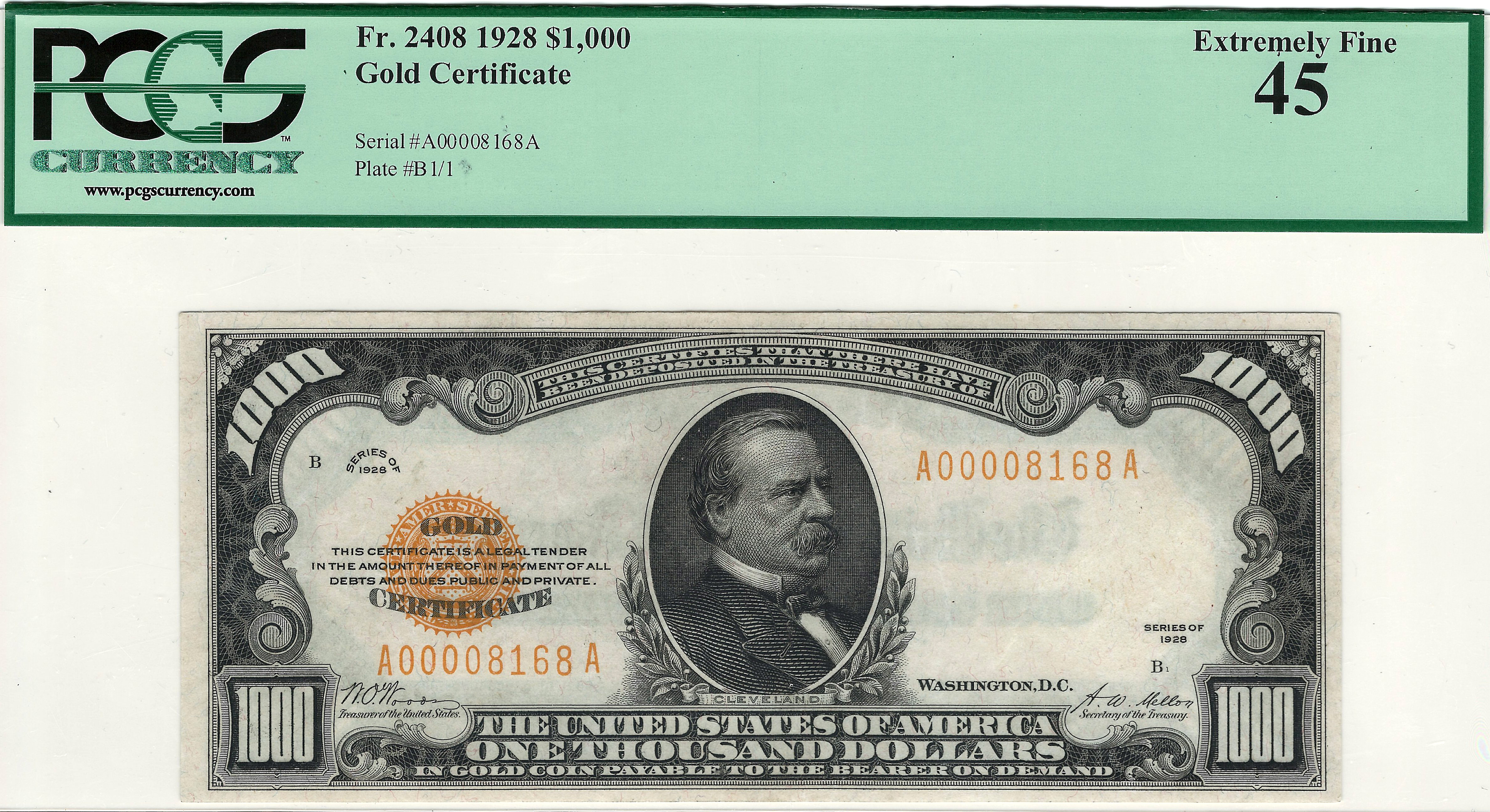 This Fr-2408 1928 $1,000 gold certificate has been off the market since March of 1980. I acquired this note from the collector in November of 2012. If you will please look carefully at the large scans you will notice the nice wide even margins which is uncommon on the gold certificates. On most of these gold certificates the bottom margins will be cut off, almost into the designs or they will be crooked from left to right. The front and reverse of this note faces up like a UNC note and the centering is dead on, both front and back. The burnt orange gold seal and serial numbers are bright and fresh as the day it was printed. It does not get much nicer than this. There are absolutely no rips, tears pinholes or marks of any kind. The serial number is A00008168A and it resides in a PCGS-45 holder.