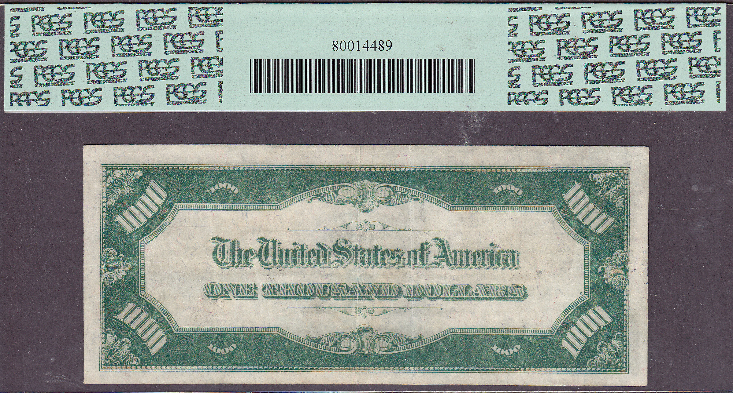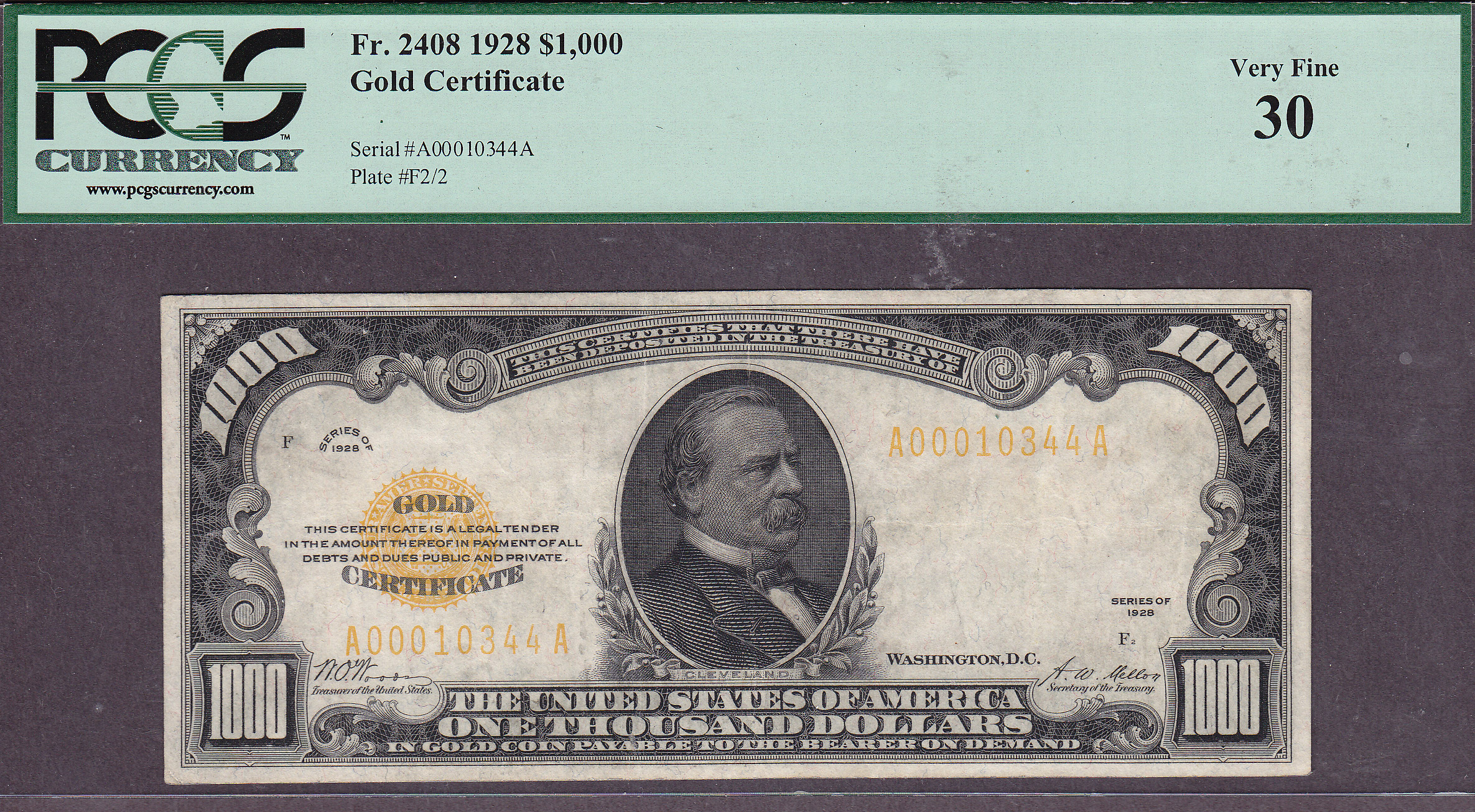 This is always one of the favorite small size notes for collectors. The popular 1928 $1,000 Gold Certificate. The 1928 $1,000 Gold Certificate is the largest small size denomination gold certificate ever offered to the public. It is highly popular and sought after by astute collectors. I can tell you this, I have bought and sold a quite a few of these notes and I have not found a nicer VF note than this one. What makes this one so nice is the fact that it is totally problem free. No rips, tears, pinholes, bank stamps, hard soiled folds or ink writings. This note was put away many years ago by some smart investor and it is just now coming to surface in the market. Check the scans and you will agree that it has very even margins, perfect centering and exceptional gold color. If you have been in the market for one of these rarities, you really need to consider this one. The serial number is A00010344A and is in a PCGS Very Fine holder.