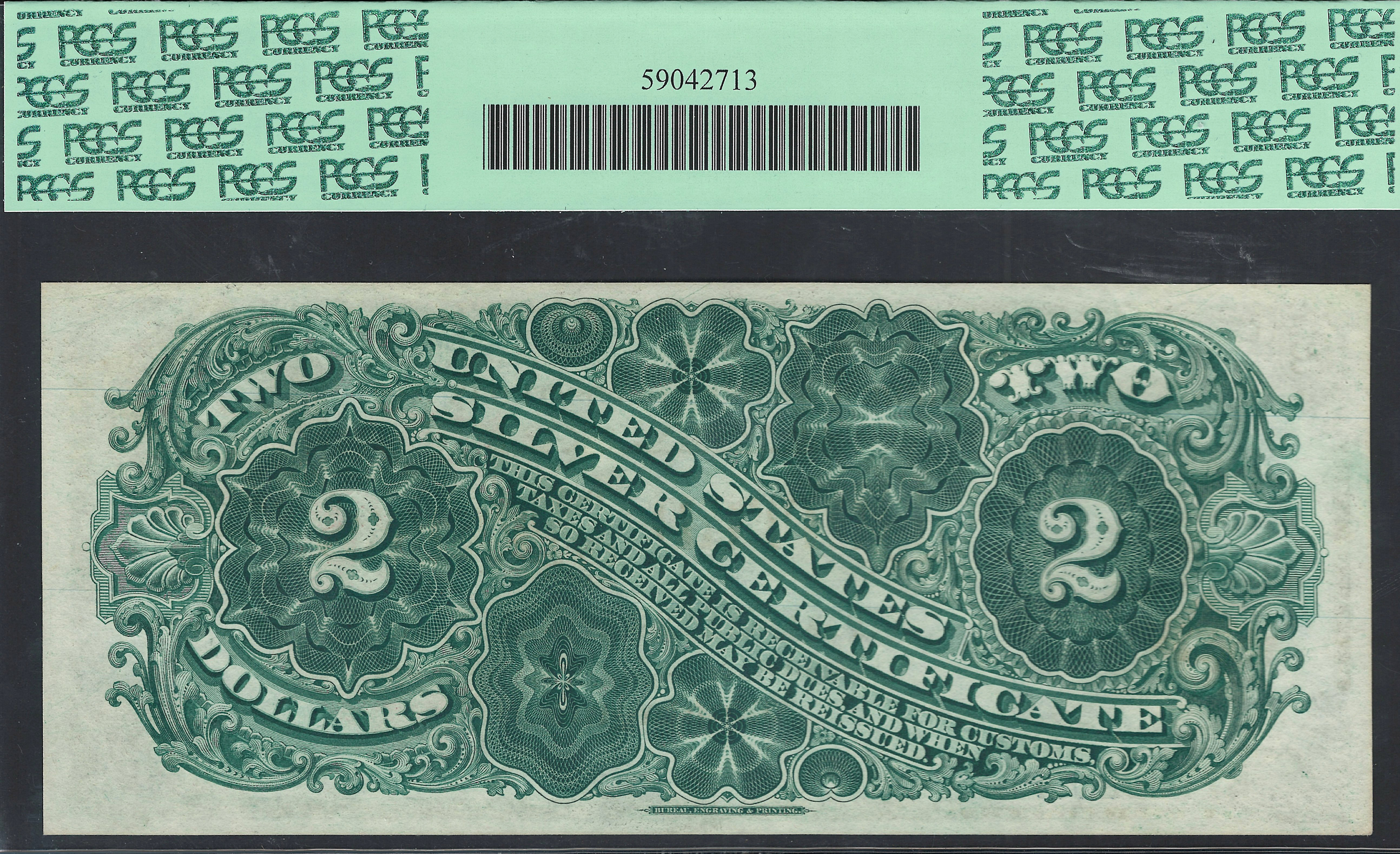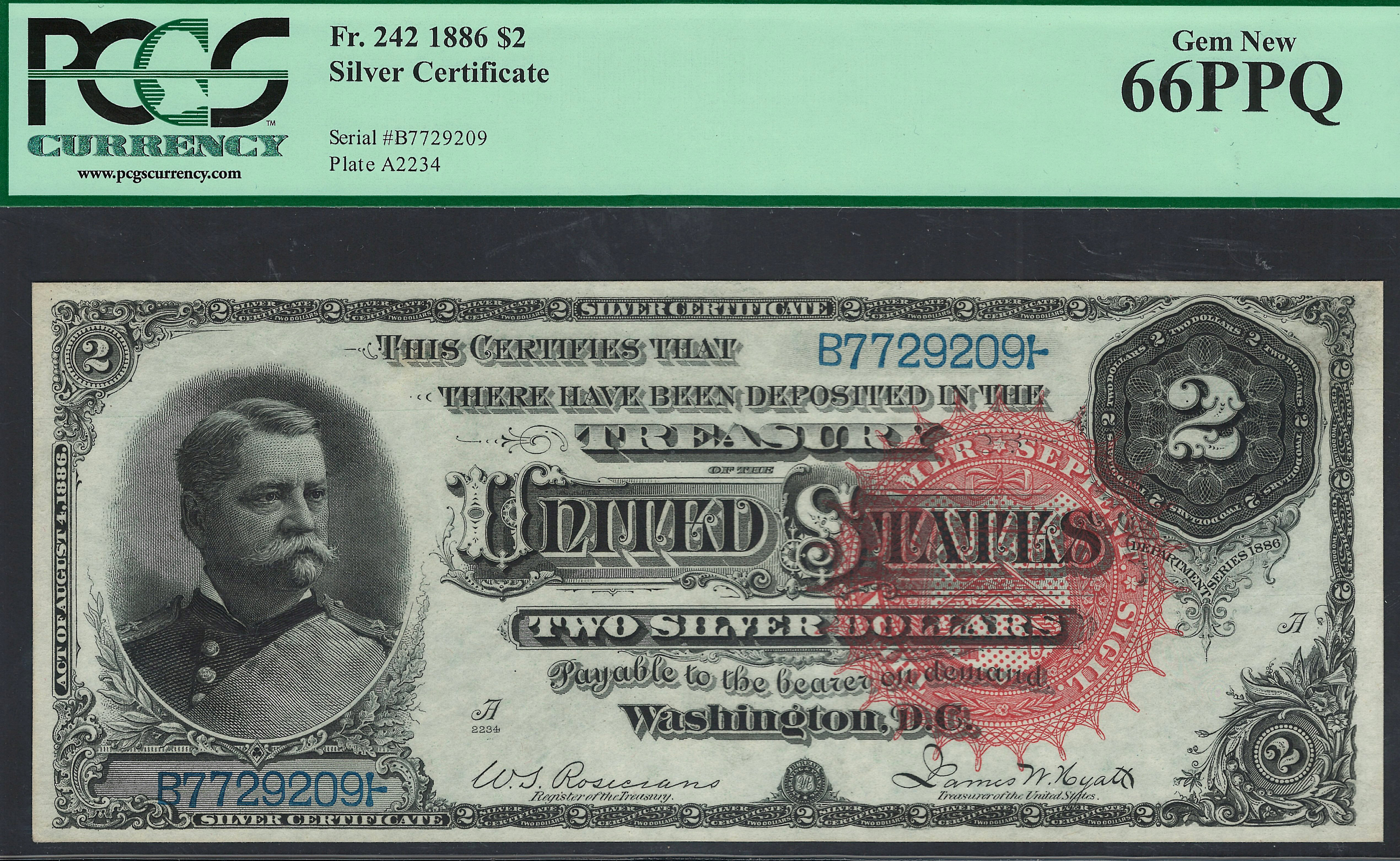 Here is a stunning Superb GEM 1886 $2 Silver Certificate. This note is commonly referred to as a Hancock Note. It features the bust of Union General Winfield Scott Hancock. I really love the large red spiked red seal to the right and the blue dual serial numbers. Once again look how beautiful our currency used to be. The obverse says it all. You can easily see why this is in a PCGS-66PPQ holder. It is perfect in every way. All four corners are perfectly squared, Vibrant colors and even margins on both sides. The serial number is B7729209.