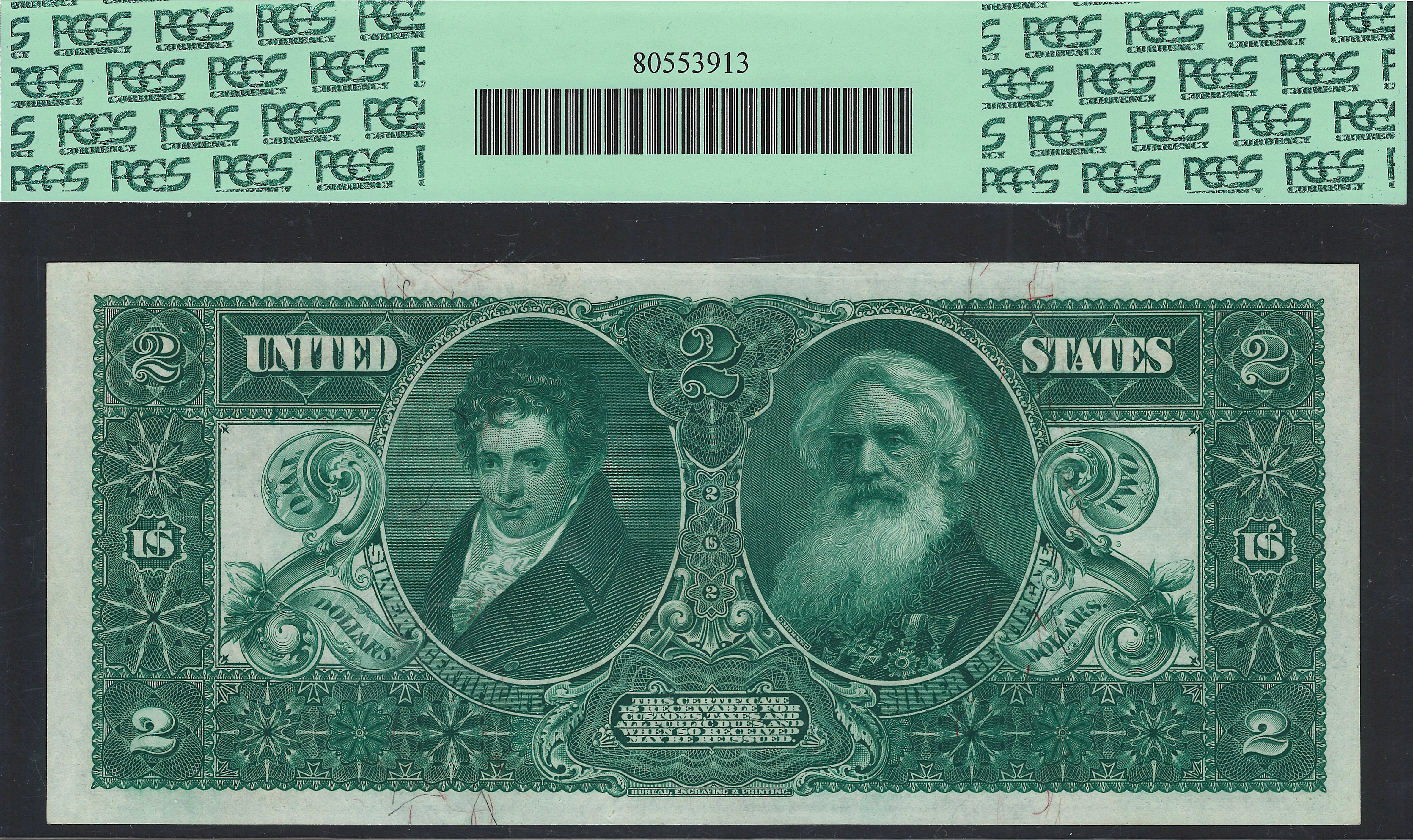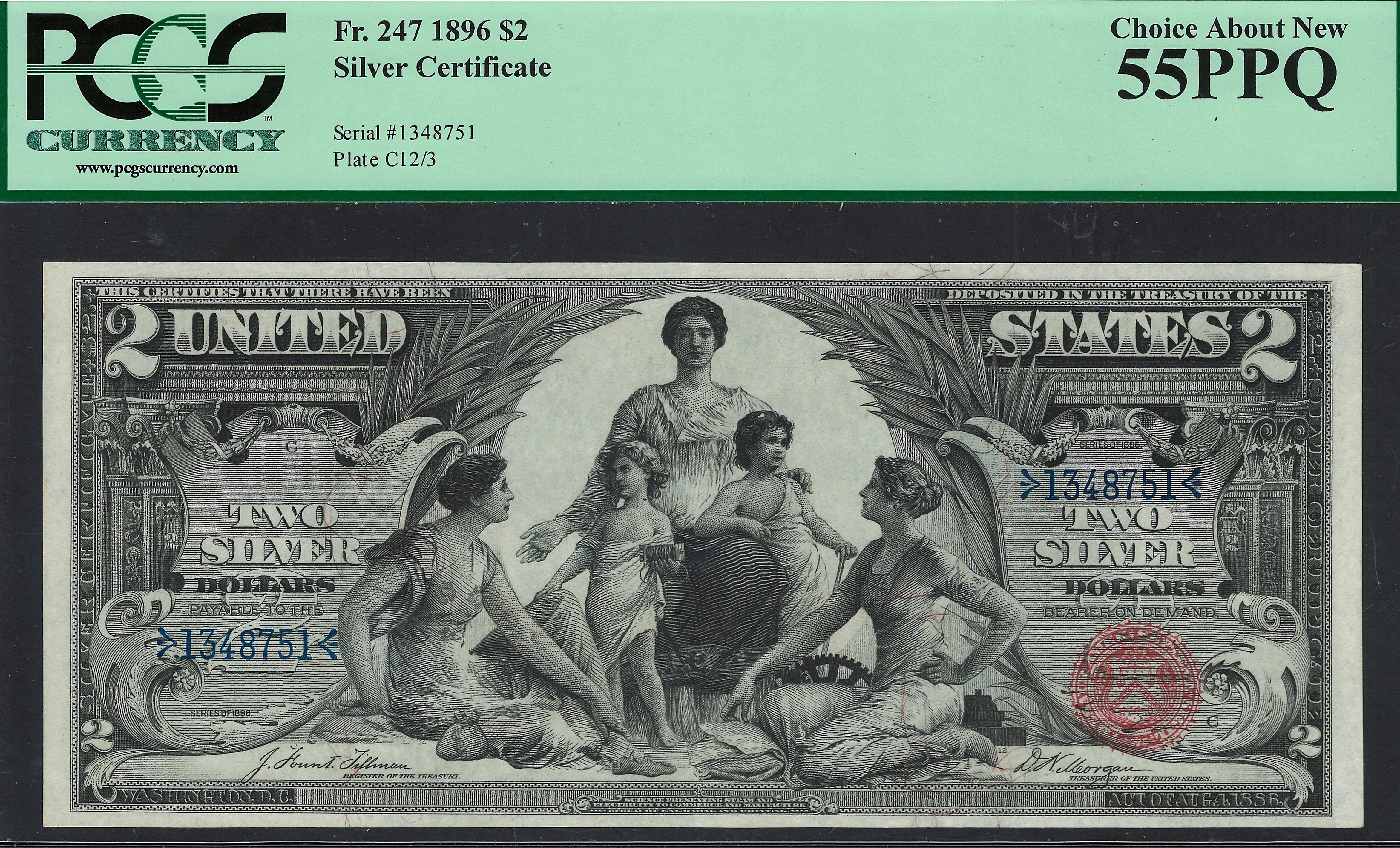 While I was at the Rocky Mountain Coin Show in Denver on May 11th, 2014 I had the opportunity to acquire a complete set of $1, $2, and the $5 1896 Educational notes. I actually only wanted the 1896 $2 Educational but I had ti buy the set to get it. You can see why I wanted the 1896 $2 Educational so bad. This is one really nice deuce with all the attributes that one could want on a note. It faces up like a GEM-67 note on the front and back. This is the nicest $2 Educational I have ever owned in a AU grade, by far. Great margins, wonderful and fresh paper quality and the inks looks as if it was recently printed. This note was actually in a CGA-66 holder and the collector had it crossed over recently. It has the appearance of a Superb GEM note. If you are looking for a super nice original 1896 $2 Educational note this may be the only chance you will get. Most of these are either in GEM for $15,000 or in a VF-25 to VF-35 grade. Rarely do you see an AU-55PPQ on the market. That is exactly why I jumped on it immediately. The serial number of this deuce is 1348751 and it resides in a PCGS AU-55PPQ holder. I have priced it at wholesale pricing for some lucky collector. SORRY THIS NOTE LASTED 5 MINUTES ON THE WEBSITE BEFORE SOME LUCKY COLLECTOR GRABBED IT"