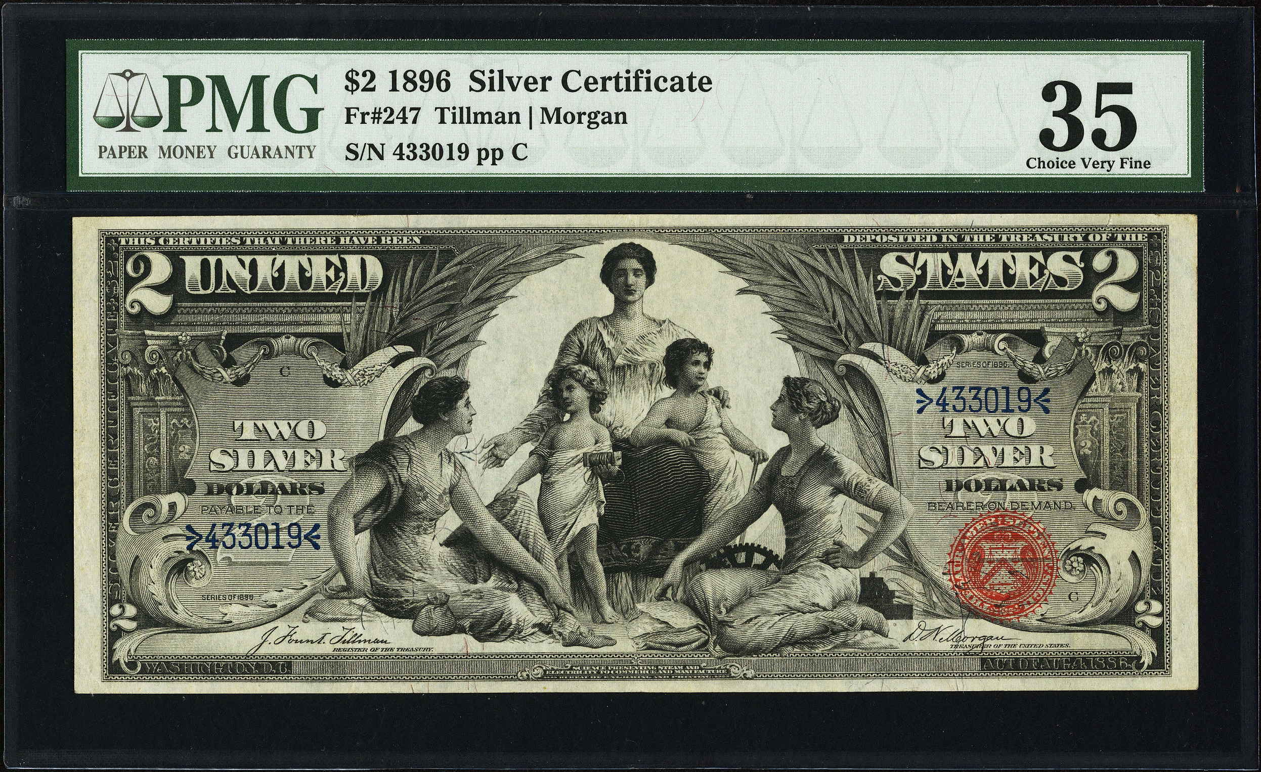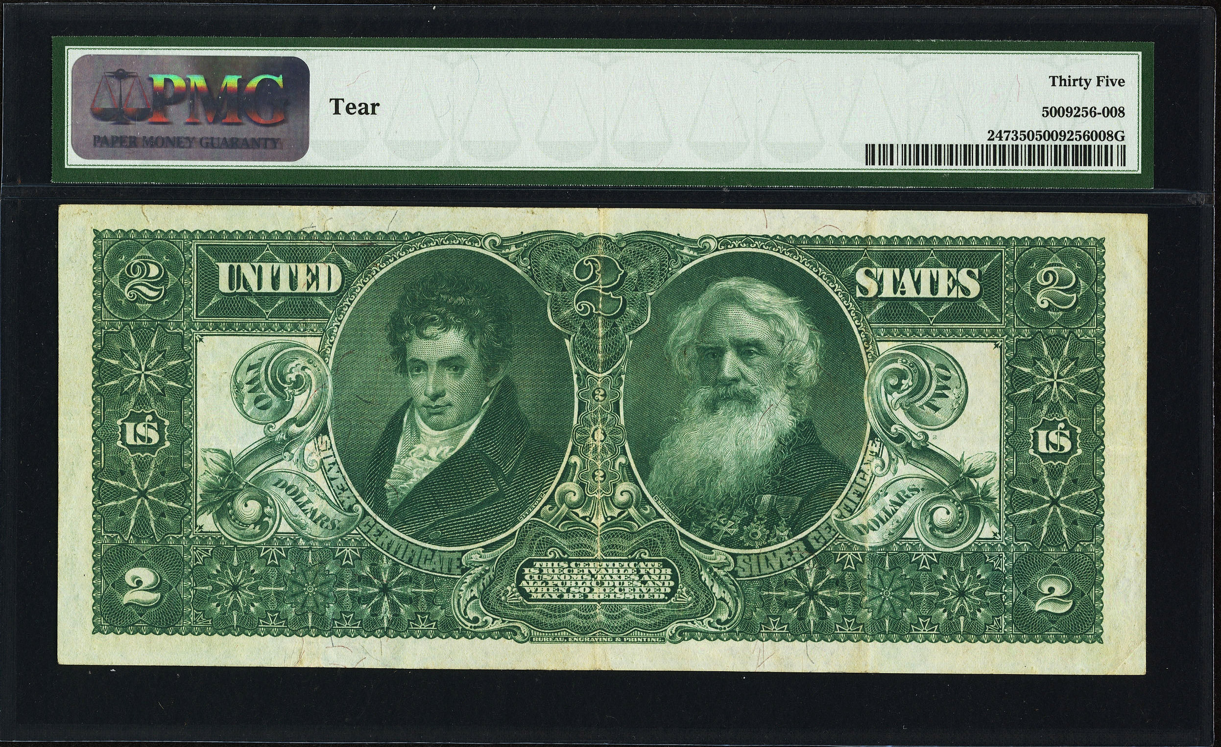 Here is one of the three famous 1896 Edicational notes. The apperance of this note is fully EF, especially from the face. Full margins and deep blue serial numbers add to the eye appeal. PMG indicates a tear in the note, though it is very minor and at the upper right outside the prime focal area. For some one who wants a $5,000 note at a discounted price, this is the one. It is in a PMG Vf-35 holder. You will never fine another $2 educational priced this low at this grade.