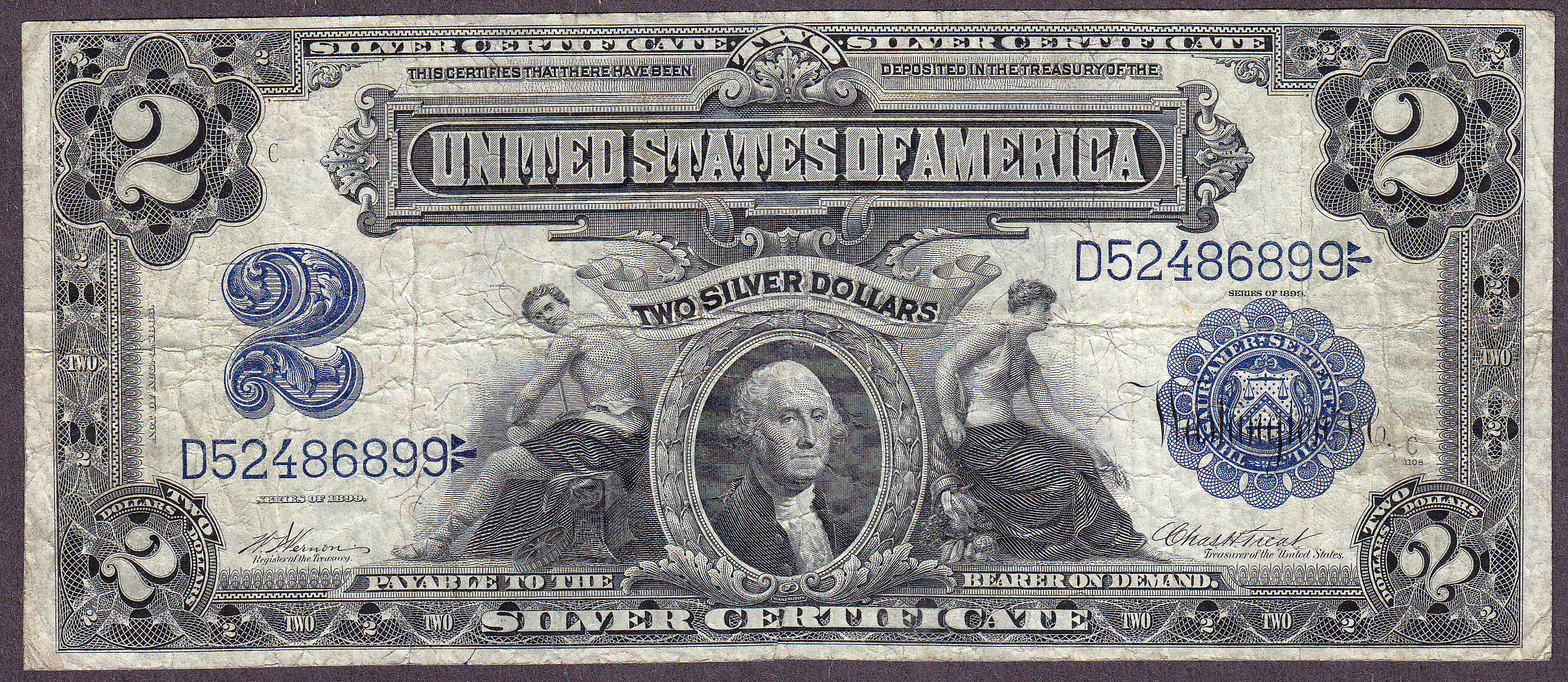 This is a rare 1899 $2 Silver Certificate with a Inverted face. The reason they call it an inverted face is because the back is actually printed first. which would make the front or face inverted, not the back. The serial number is D52486899. Although it is circulated it is very rare for this high grade. I only see one pinhole in the photo of George Washington on the left side. See the large scans for additional details.