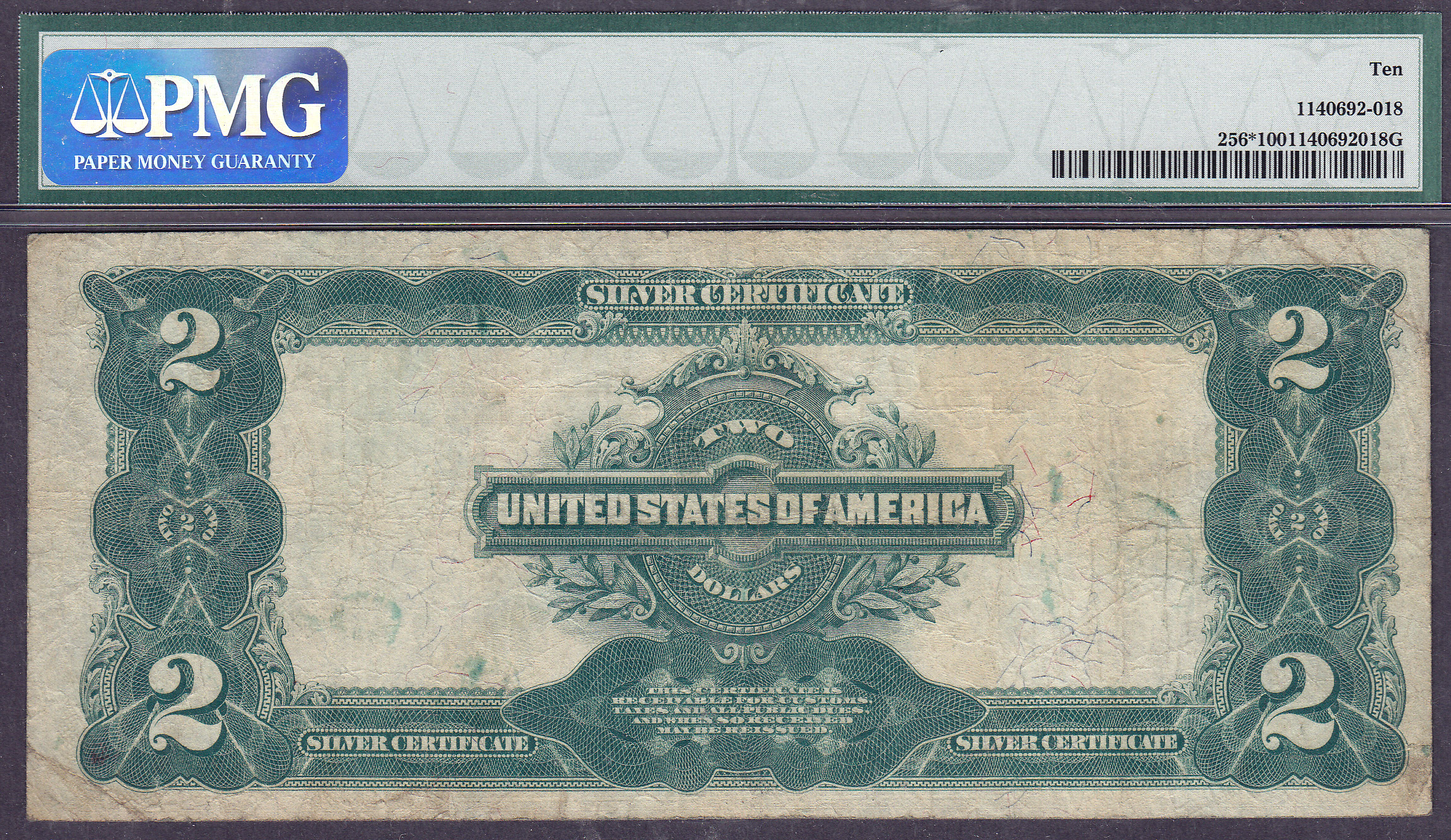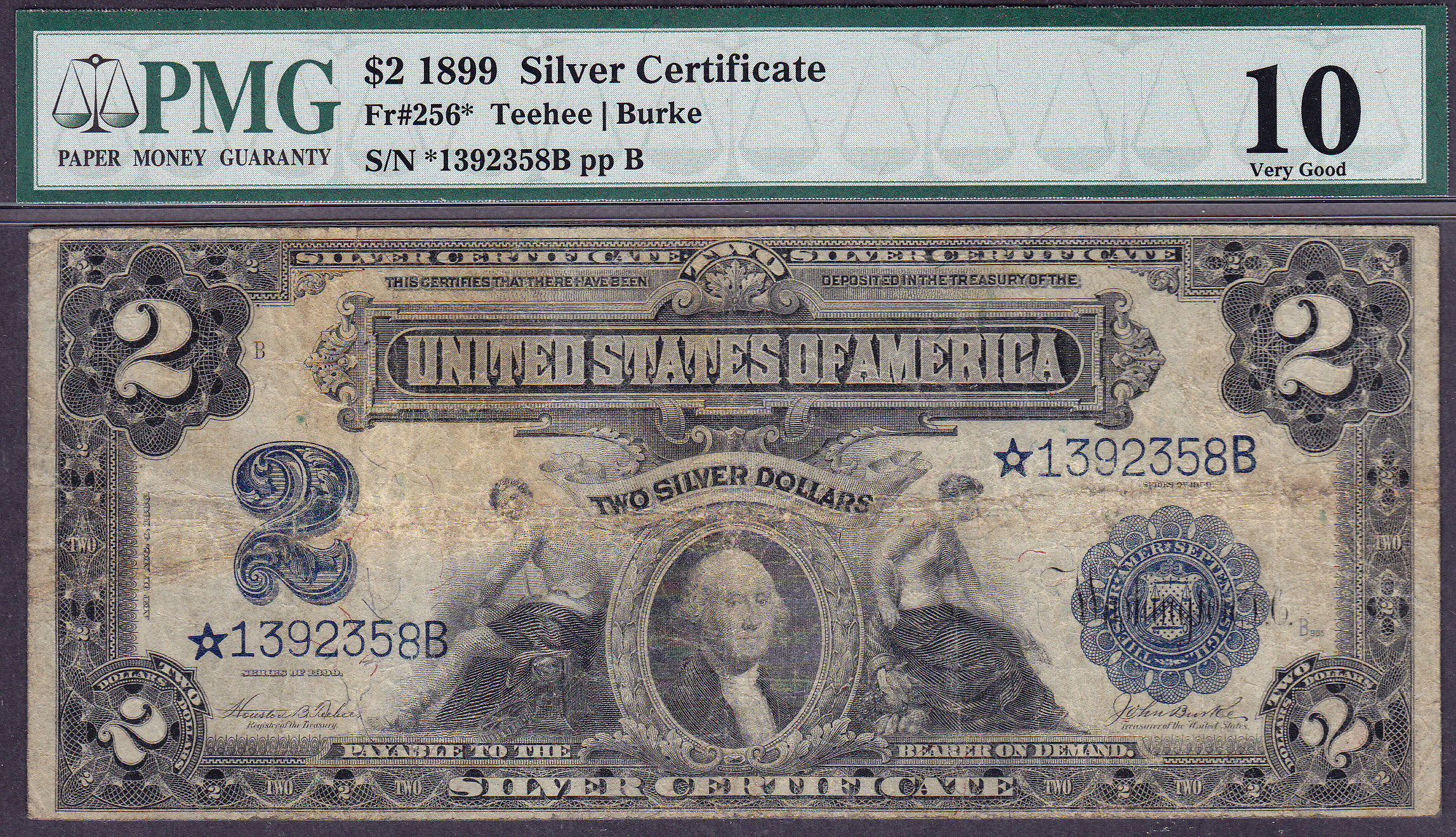 Here is a very nice VG rare star. it is a FR-256*, or the 1899 $2 Silver Certificate. The serial number is *1392358B and is ina PMG-10 holder.