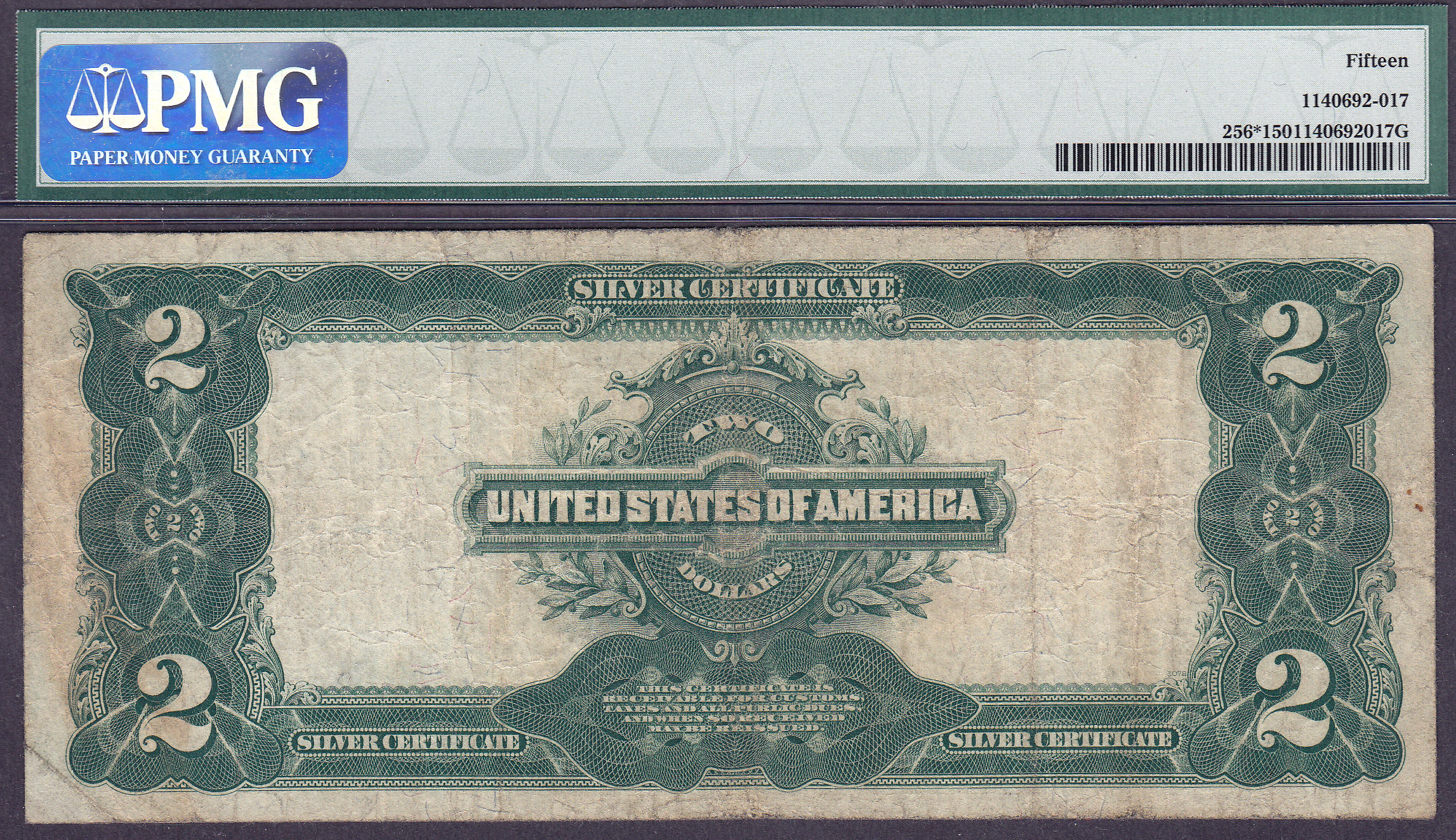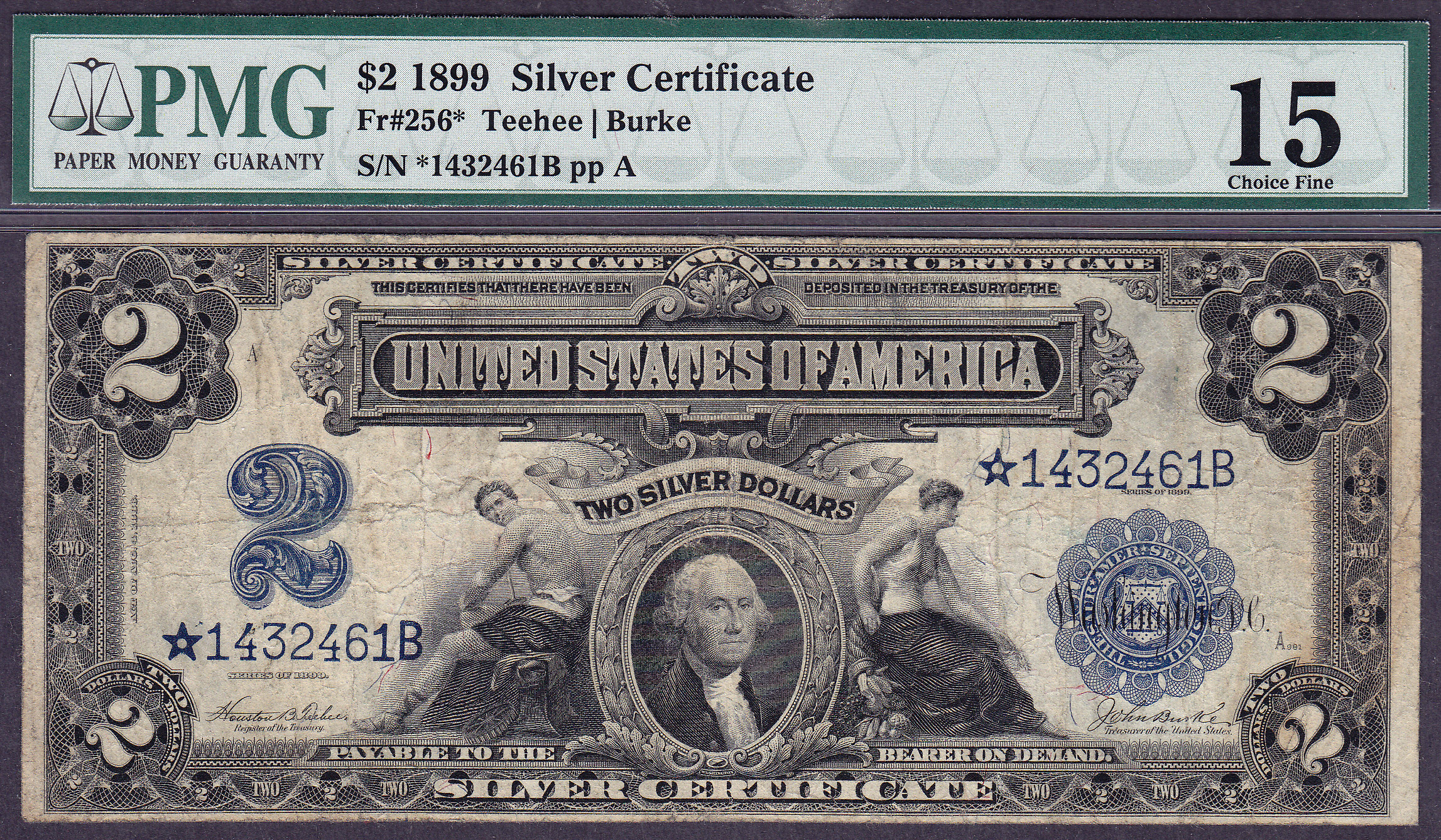 Here is a nice FR-256 star or a 1899 $2 Silver Certificate star. There are no rips, tears or pinholes. The serial number is *1432461B and is in a PMG F-15 holder.