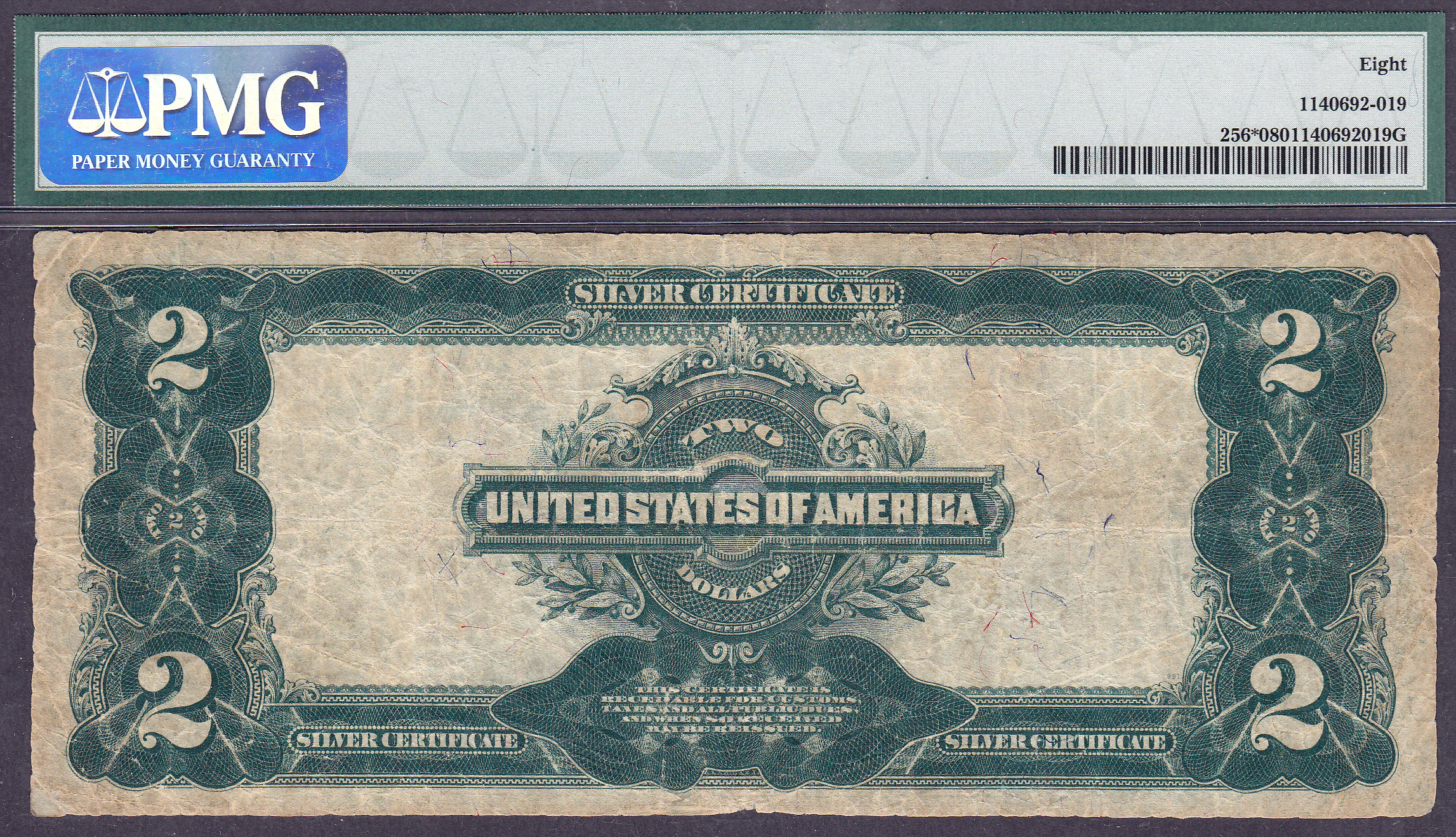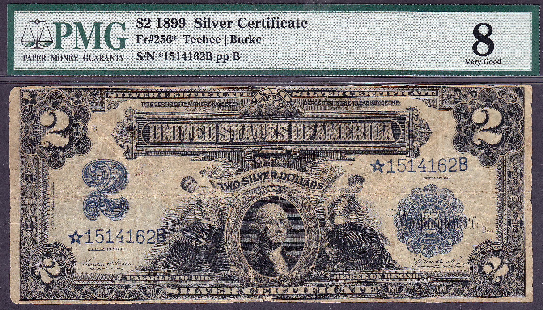 Here is a 1899 $2 Silver certificate Type II star. it is in a PMG VG-8 holder. The serial number is *1514162B. If your looking for a nice price on a cool and rare Large Size star...here it is.