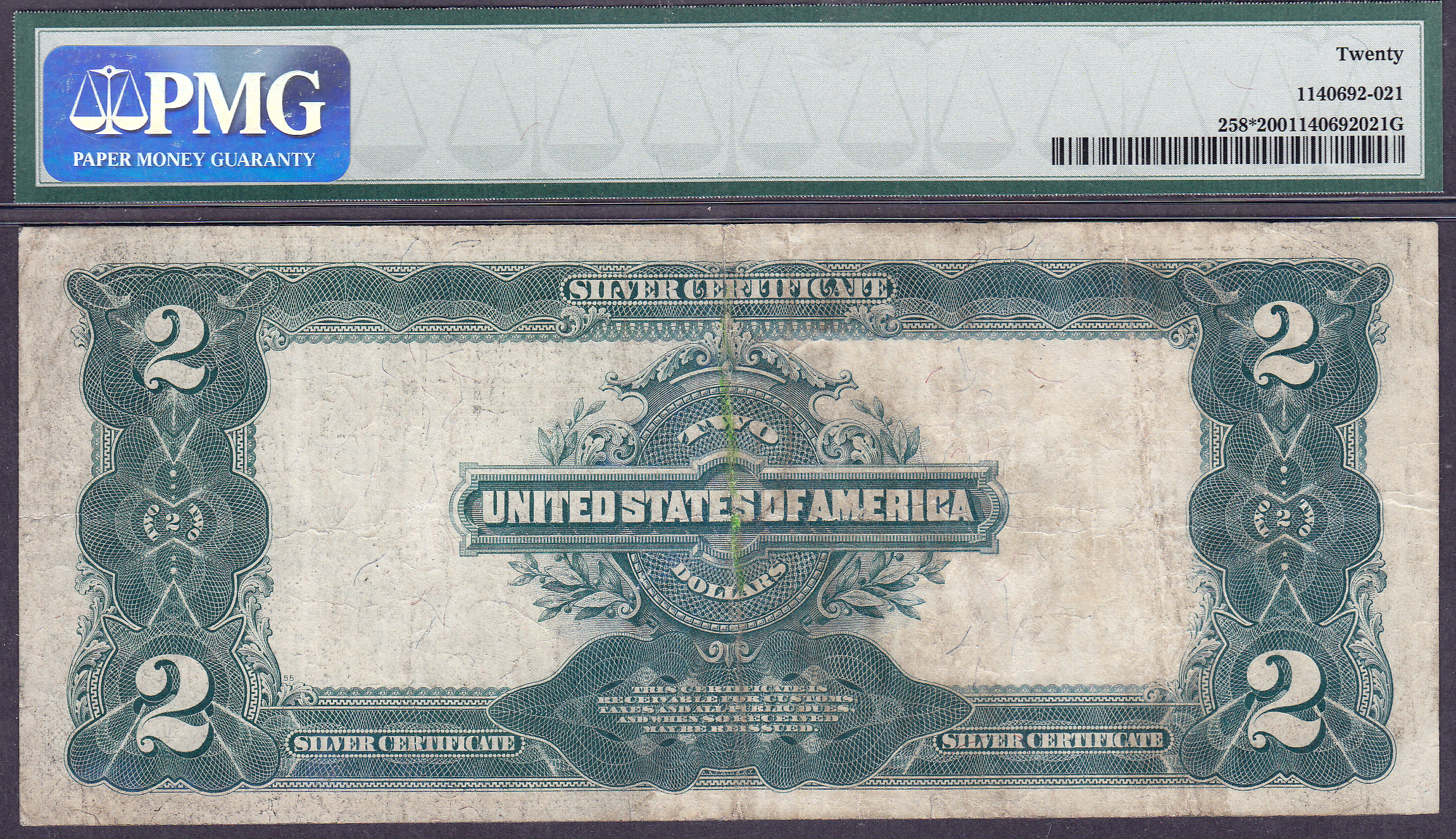 Here is a very desirable 1899 $2 Silver certificate star in a PMG VF-20 Holder. it is a circulated no problem Type II varity. The serial number is *1850925b. Kelley list this note for $1,000 in VF condition.