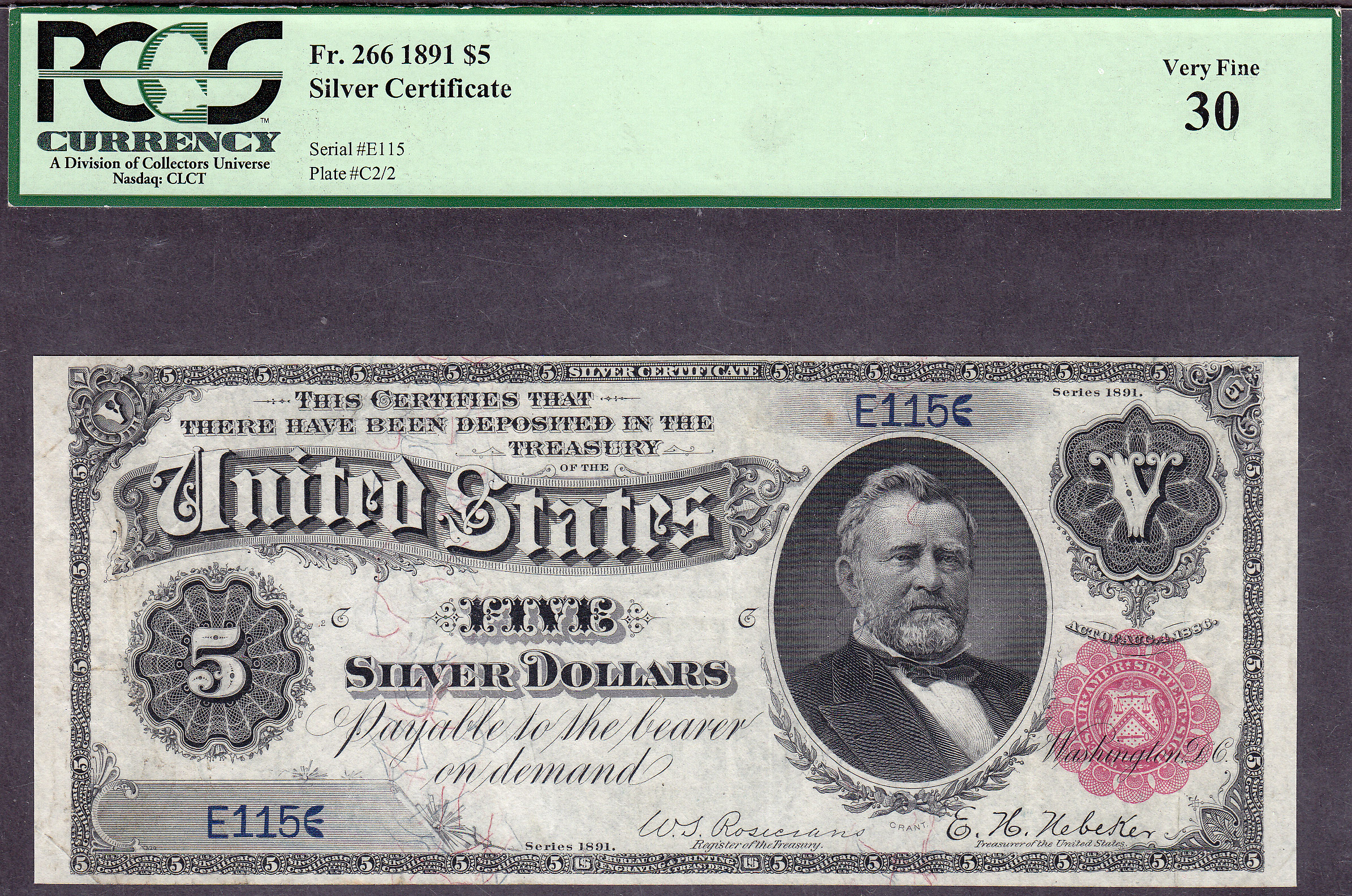 This 1891 $5 Silver Certificate with serial number E115 is somewhat of a famous note. It is a Fr-266 1891 $5 Silver Certificate with an uncommon low serial number. It has one of the lowest serial numbers known, E115. It is a typical 3 fold VF note with no major issues. No rips, tears, pinholes, bank marks or stamps. It is a very collectible note for the fancy serial number collectors. It is priced to sell today. It needs a new home right away.