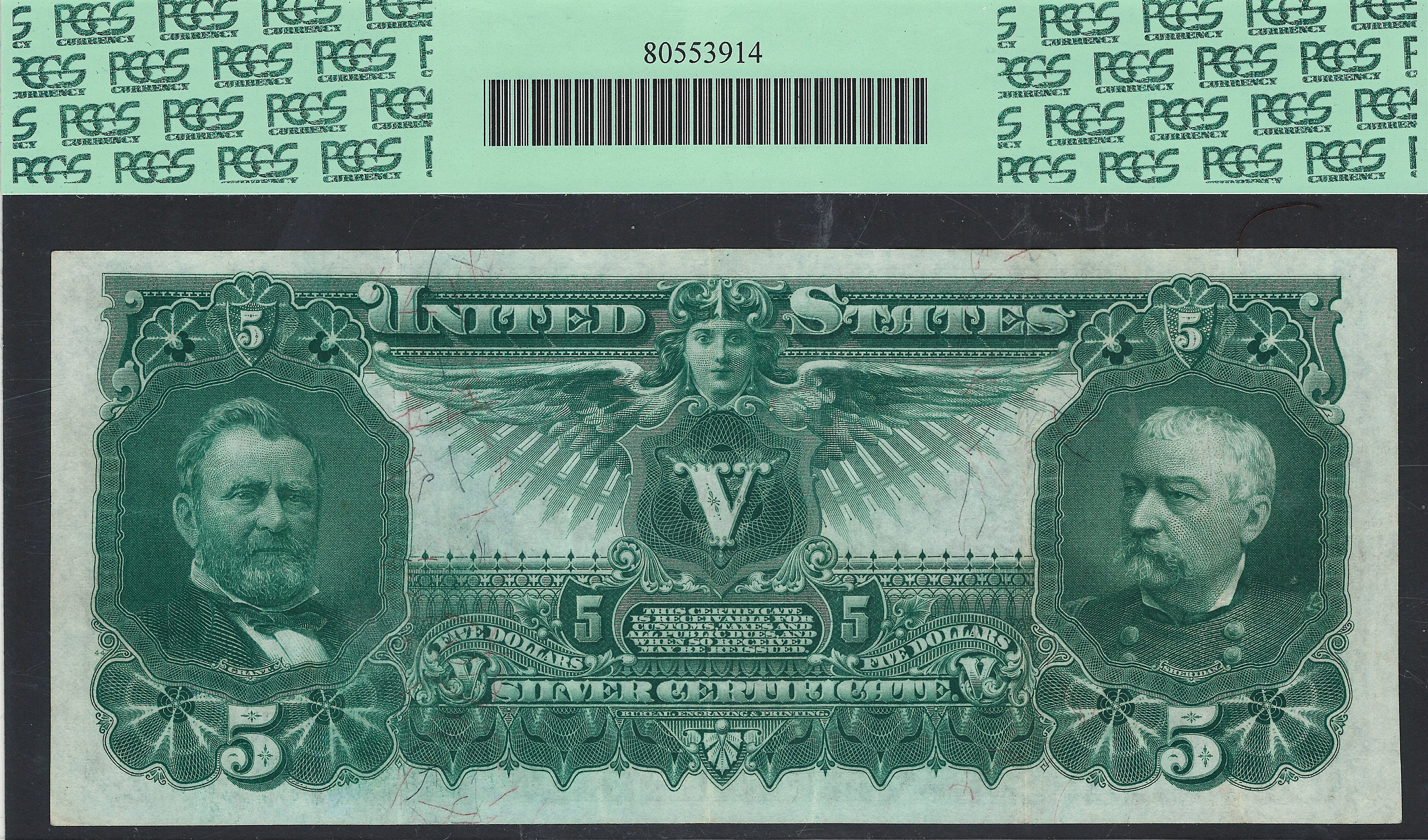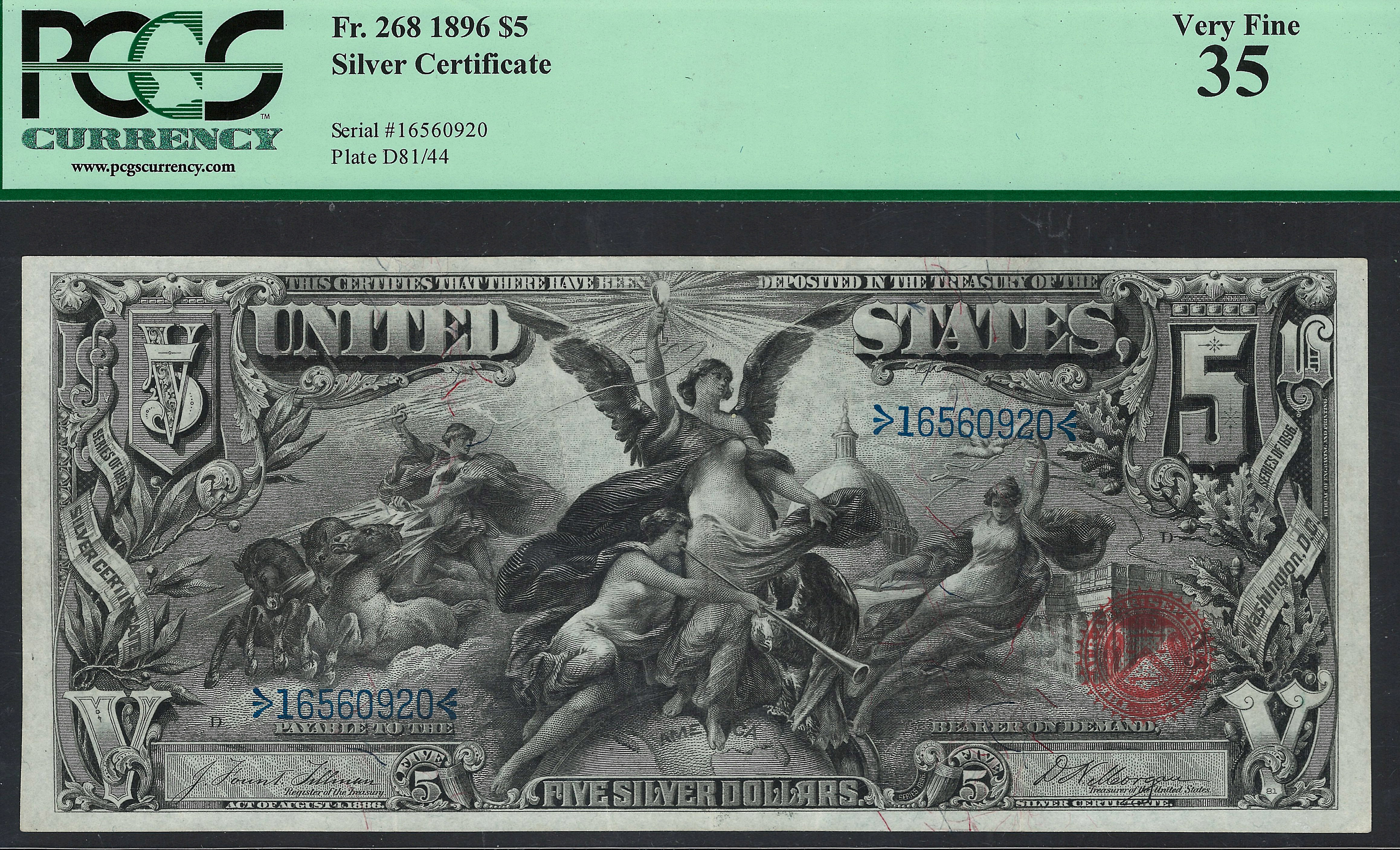 This is a very nice 1896 $5 Education note which was part of a complete set of Educational's I just purchased at the Rocky Mountain Denver show held May 11th, 2014. The $2 Educational lasted just 5 minutes on the website. As you can see by the large scans this is a well centered note with great paper quality and vivid inks. It faces up as a GEM note. There are no rips, tears, pinholes or bank marks. The serial number is 16560920 and it resides in a PCGS VF-35 holder. The $5 Educational note is the most collected note of all US Currency, both large size and small size.The Allegorical group Electricity as the dominant force in the world. It was engraved by the famous engraver C.F.C Smillie. The back shows The head of Ulysses S. Grant and Phillip Sheridan, Union generals during the Civil War. Now you can see why this note is so popular. This beauty was previously in a CGA-64 holder. I have priced it at wholesale prices for some lucky collector. Grab it before it is gone!