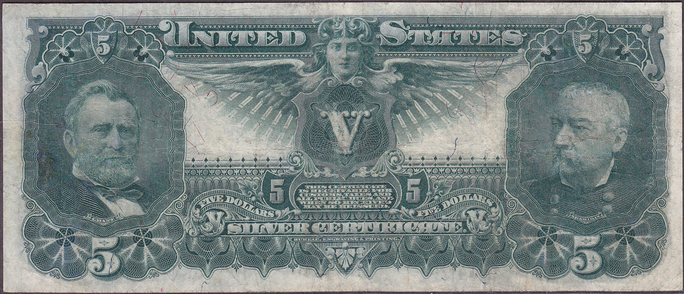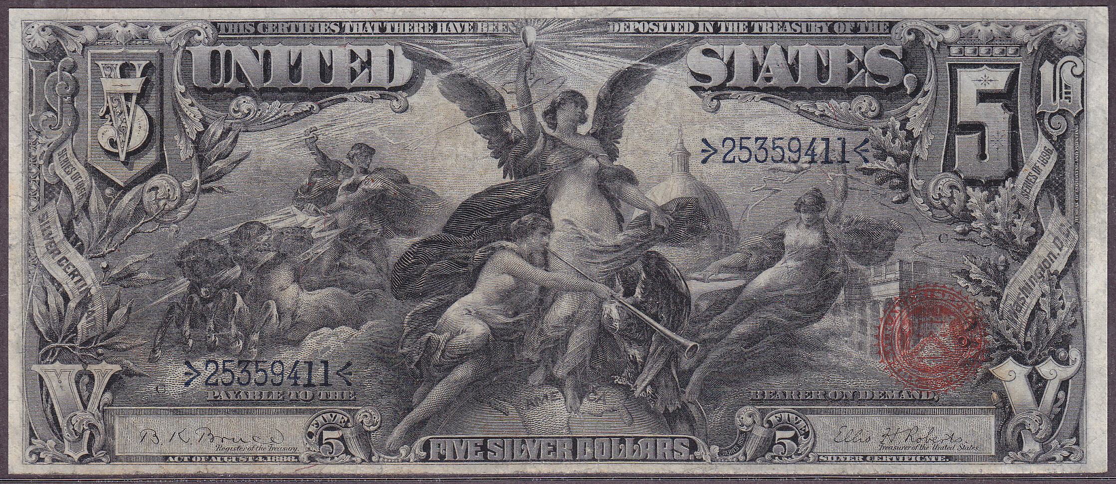 This is a new purchase that I just received. This is a Fr-269 1896 $5 Silver Certificate Educational Note. This Fr-269 is the rarer Friedberg number with the Bruce-Roberts signature combination. The more common Fr-268 is a Tillman-Morgan signature combination. This note was part of a collection i purchased in Chicago. There are no rips, tears, pinholes or bank marks. If you’re looking for a great type note with the scarcer signature combination, this will fit nicely into your collection. it is priced to sell immediately. Do not wait too long as it will sell fast.