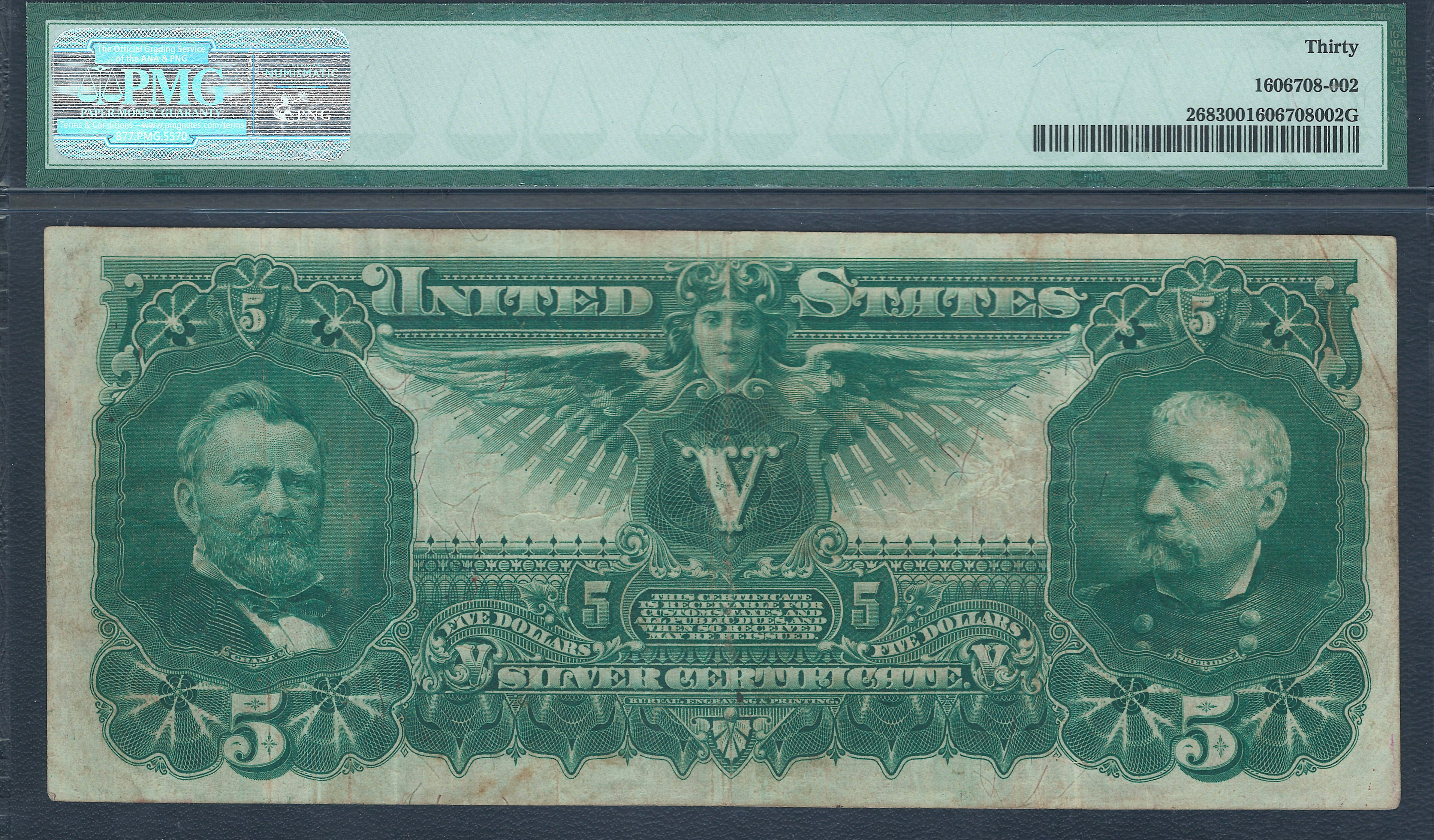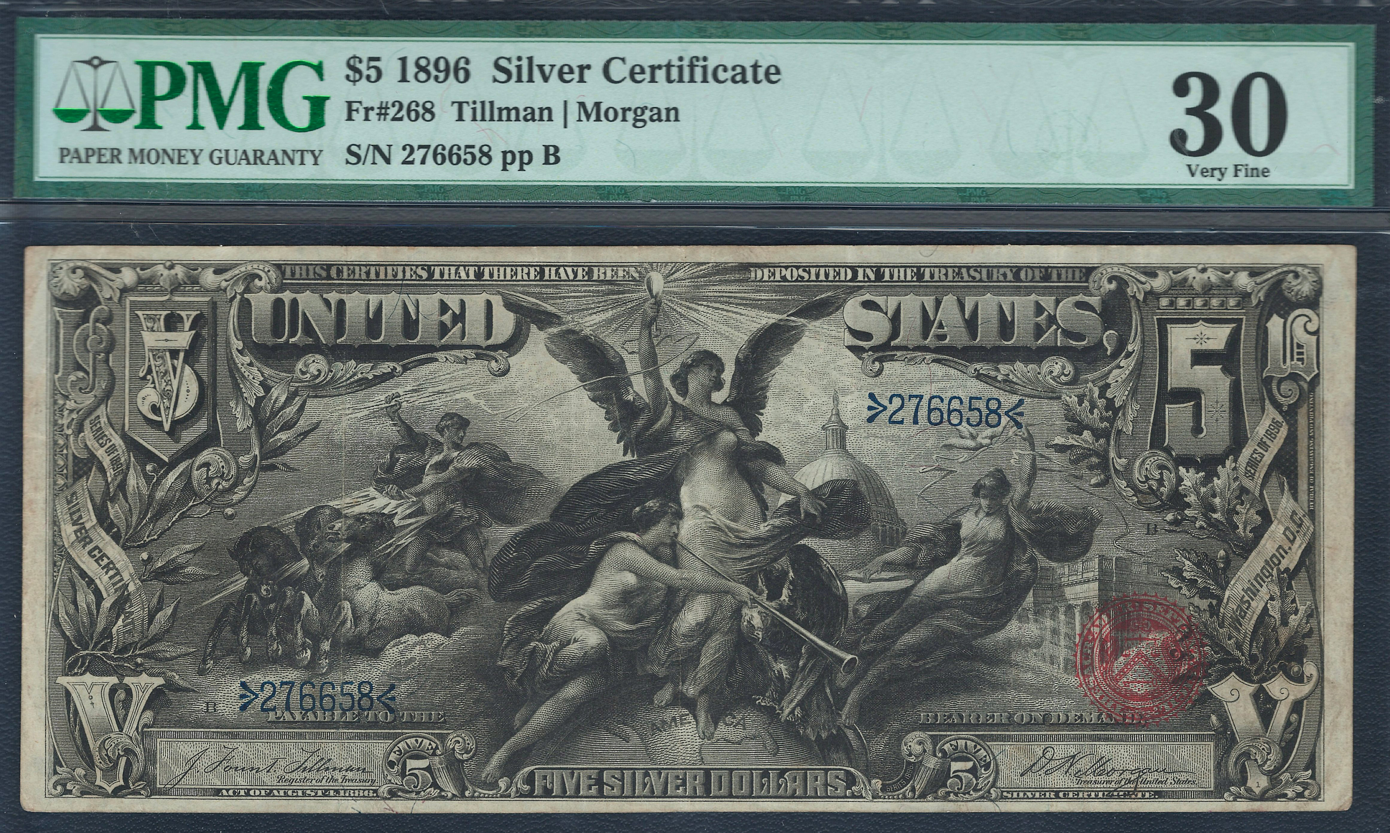 This 1899 $5 Educational Note is considered the most popular and beautiful note ever printed and issued by the US government. The educational series is a must for every collector. It is very difficult to find $5 educational notes in areal PMG-30 with NO PROBLEMS! Why you ask? Simple, because there are many greedy note doctors out there that would love to take this nice and original note clean it and press it flat to hide the folds and get a better grade to sell for more money. Sad but true. I was very lucky to come across this one! The figurines on the front is a bare breasted Electricity showing as the dominate force in the world. Simply Beautiful. The 1899 Educational series is a 3 note set. The one, the two and this one, the five.This is a very good example for the grade and price. The serial number is 276658 and it resides in a PMG-30 holder.