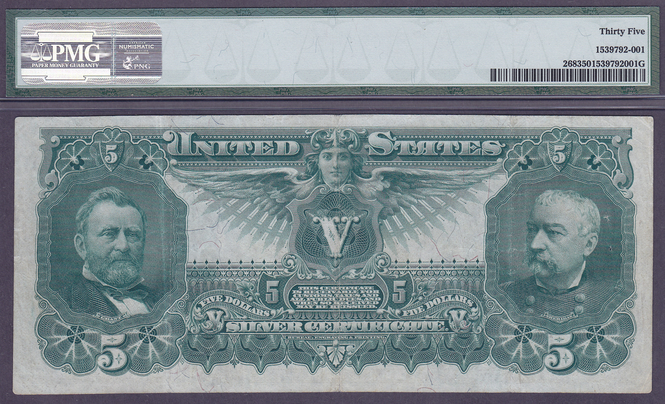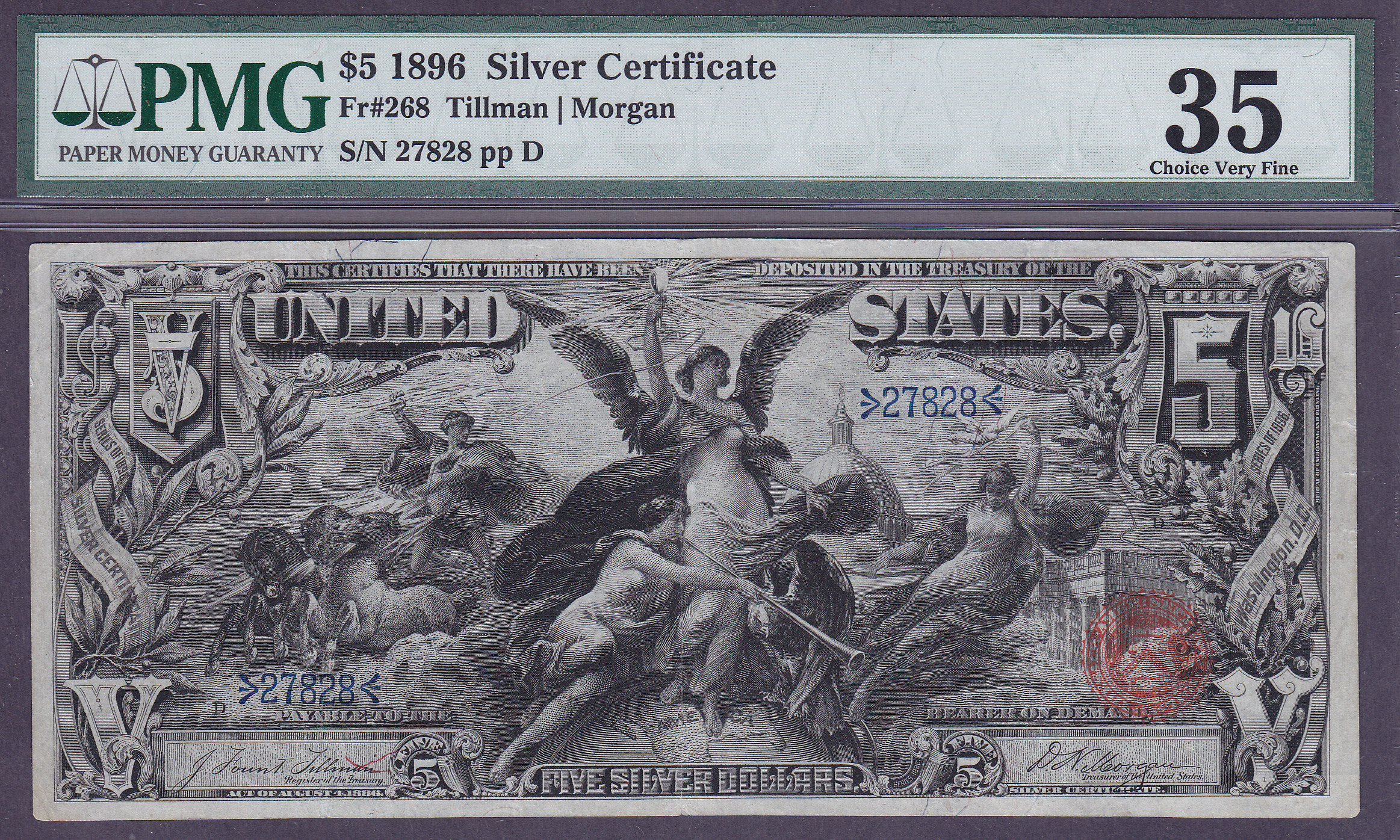 This is a VERY nice undergraded Fr.-268 1896 $5 Silver Certificate Educational Note, serial number 27828 in a PMG-35 holder. The 1896 Educational 3 note series is considered the most beautiful of all US currency ever printed by the BEP. This example has no rips, tears, pinholes or markings. It has all the nice borders and dark blue serial numbers. AND, it is priced to sell. If you are looking for a nice type 1896 $5 Educational that will not set you back $10K, this one may be for you.