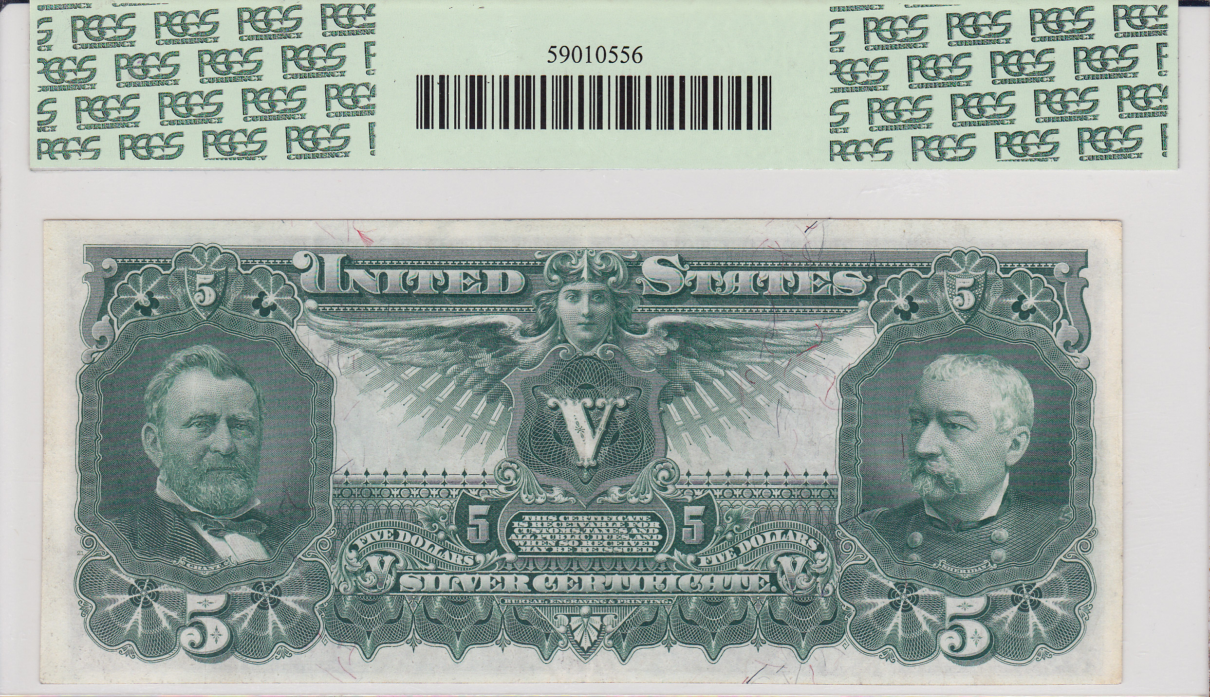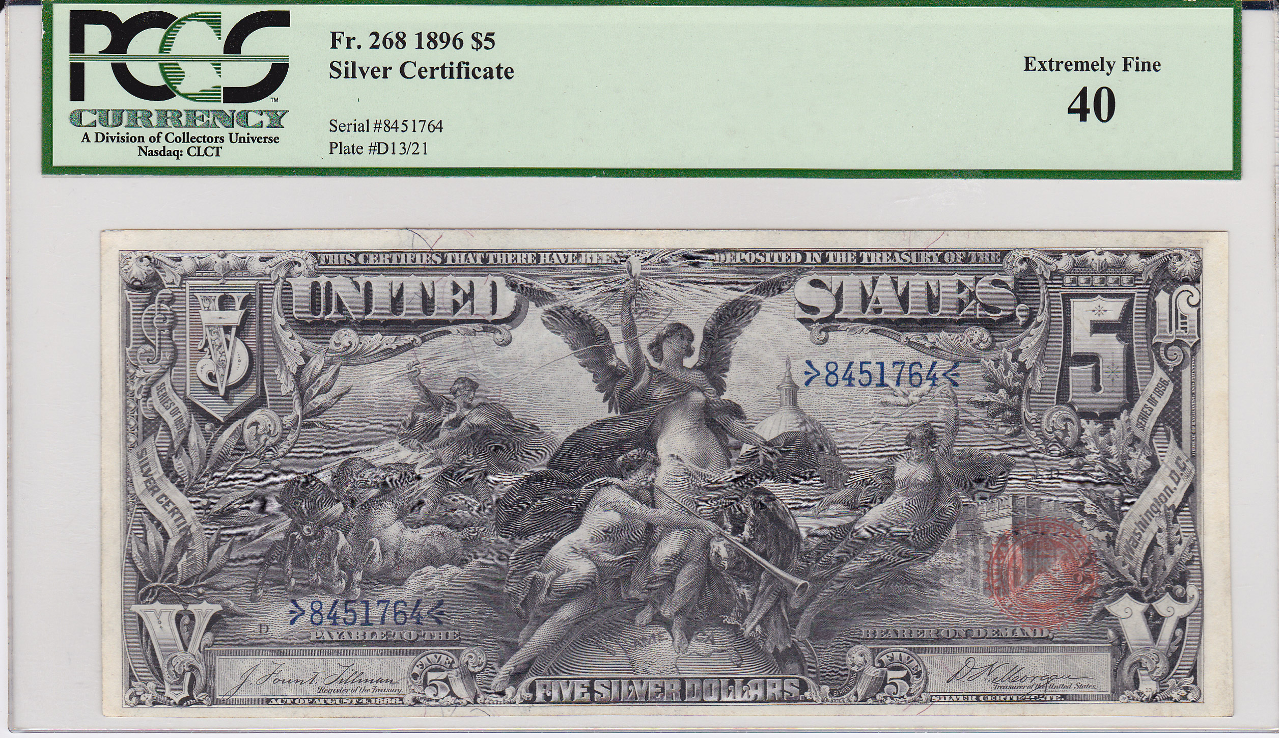 This is an absolute stunning 1896 $5 Educational Note It is the third and last of the Educational series. Allegorical group showing electricity as the dominant force in the world is on the front. The heads of Ulysses S. Grant and Phillip Sheridan Union army generals during the civil war are featured on the back. This is considered the most beautiful of all US large size notes and is always in high demand. This note has no rips, tears, pinholes or markings. It is priced to sell fast. The serial number is 8451764 and it is in a PCGS-40 holder.