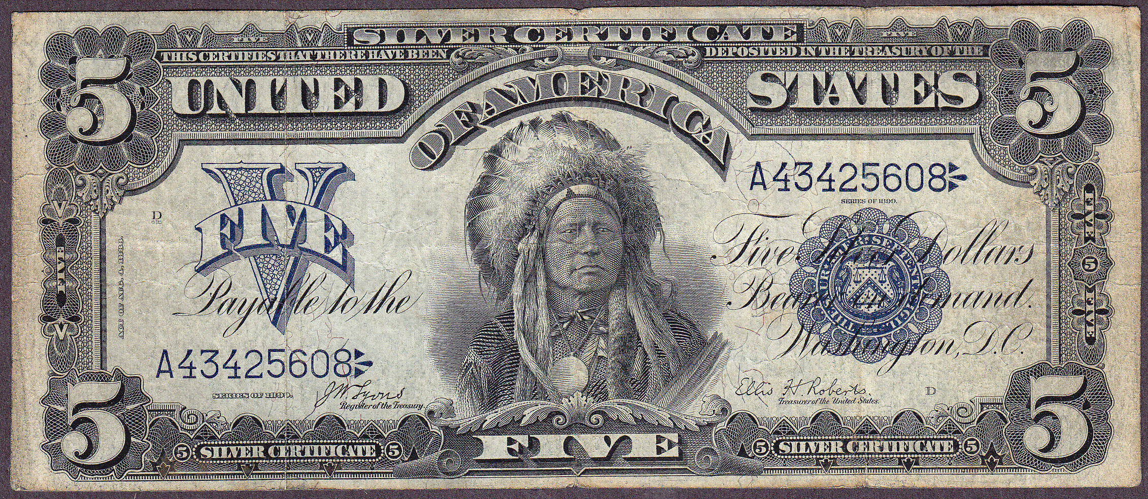 Upside down Chief. Here is another 1899 $5 Chief with a inverted face or back, however you want to call it. Actually since the back is printed first the face is inverted. The serial number is A43425608. This is one of 6 known Chief inverts for this FR#. Although not pictured, This is in a PCGS-15 holder with no rips, tears or pinholes.