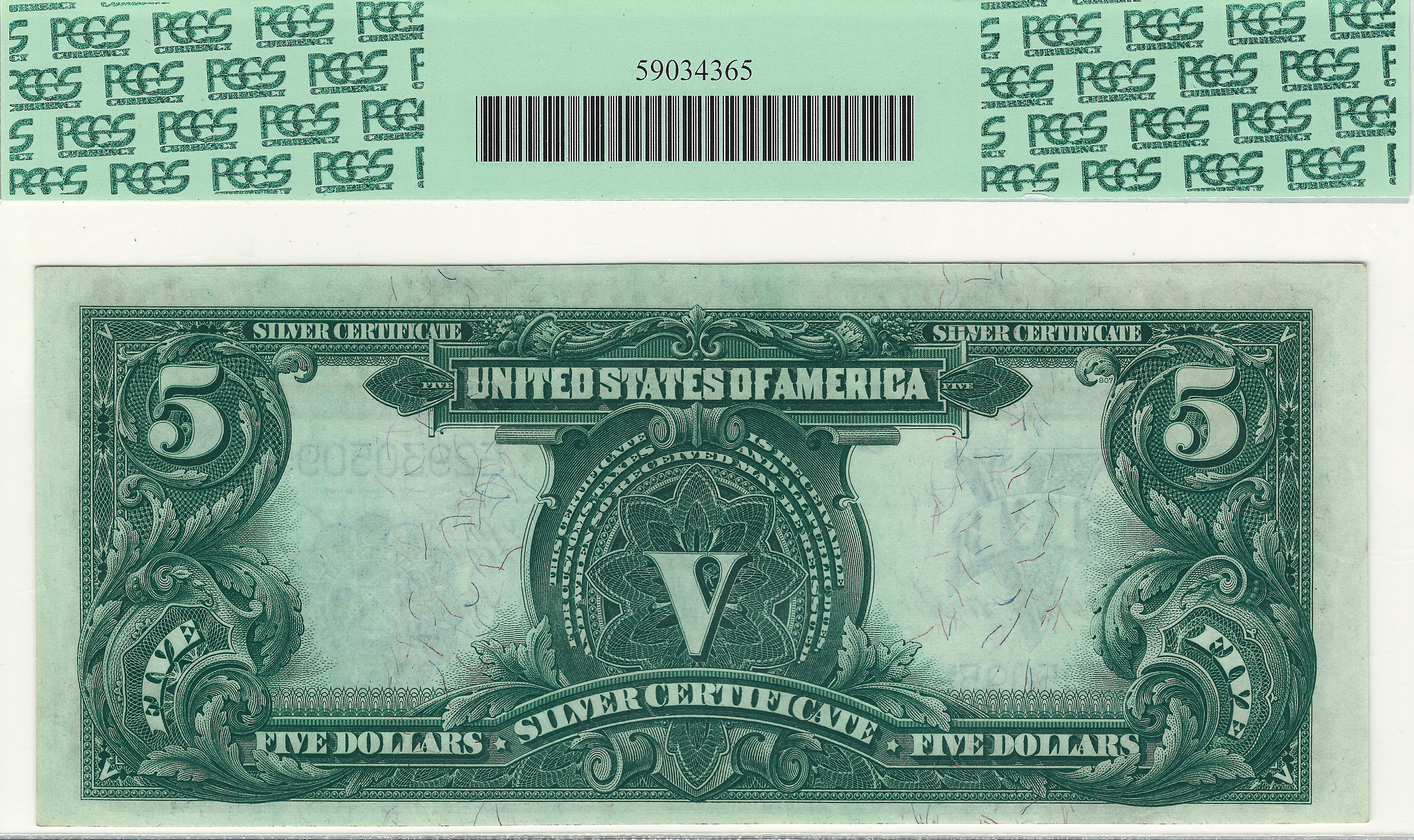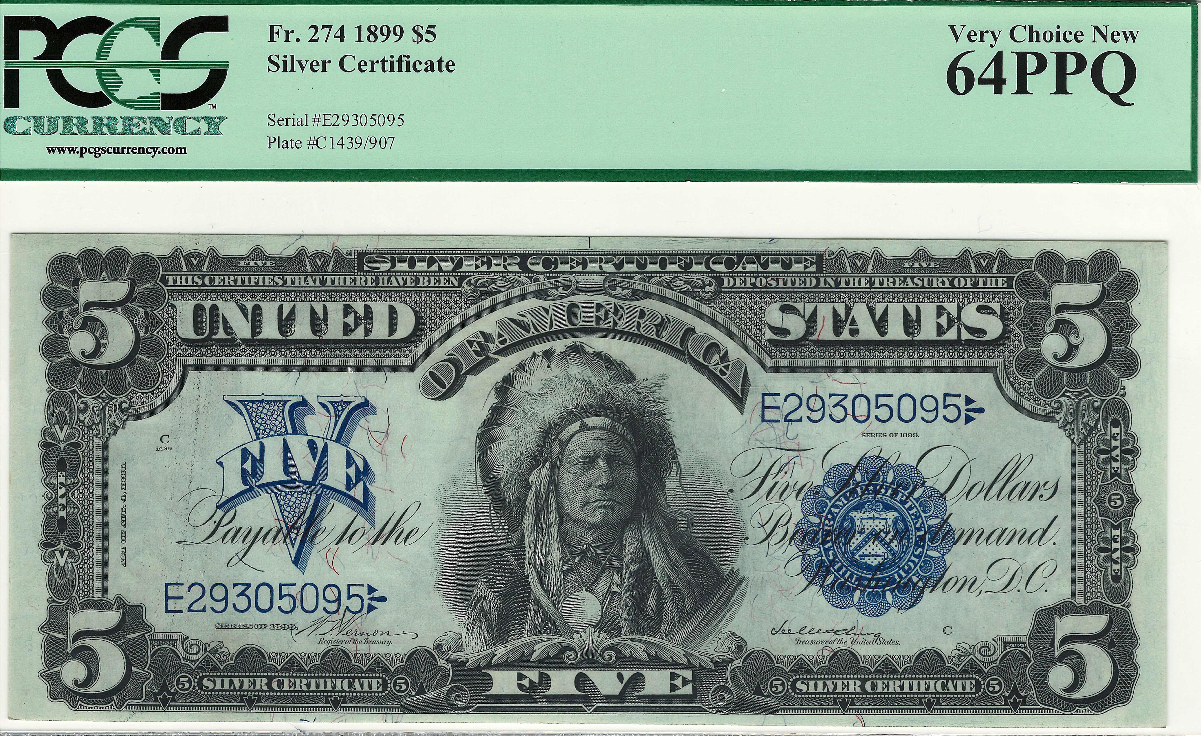 This 1899 $5 Silver Certificate is also known as the Chief Note for obvious reasons. It features the head of Chief Ta-to-ka-in-yan-ka, also known as Running Antelope, a member of the Oncpapa tribe of Sioux Indians. This is the only issue of US paper money that a Native American was selected as the central feature. George F. C. Smillie who engraved the 1896 Educational note also engraved this one. The serial number of this Very Choice Uncirculated PCGS- 64PPQ note is E29305095. It is obvious to see that this is a near GEM note with all the qualities that one would expect. This is one of the finest 64 graded notes you will ever encounter.