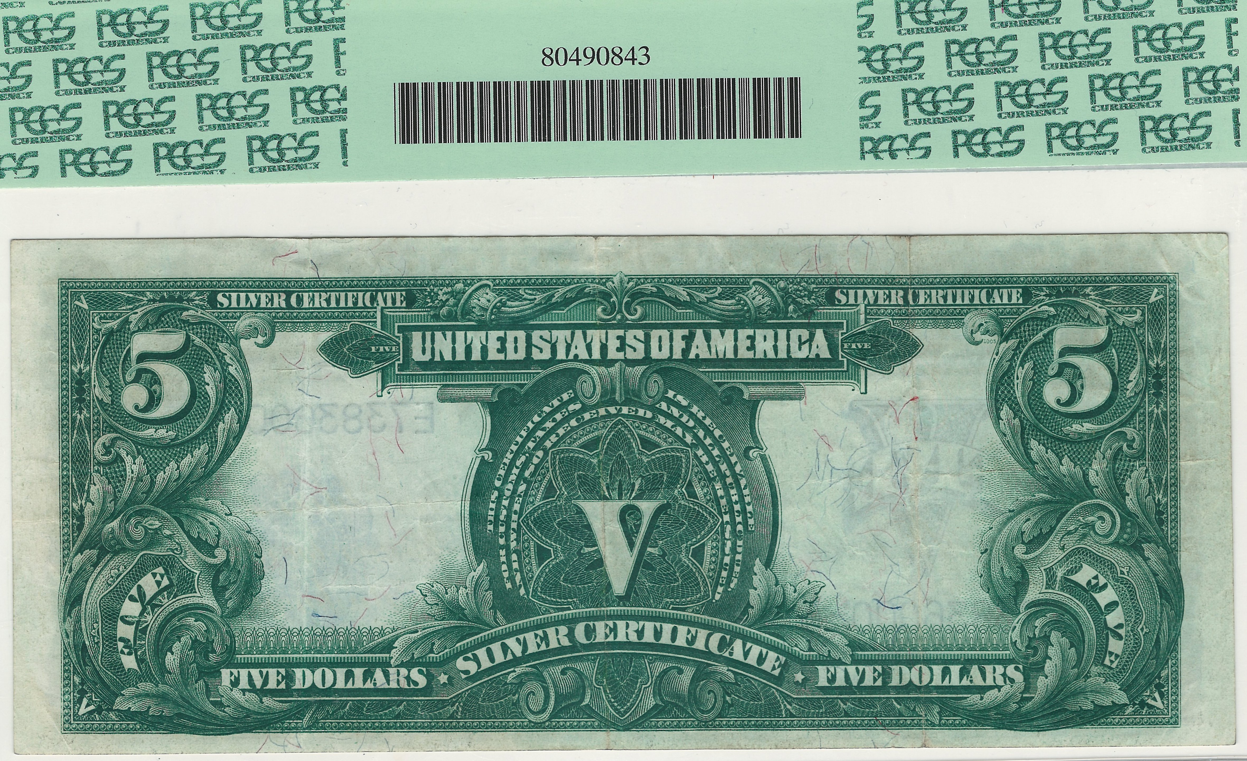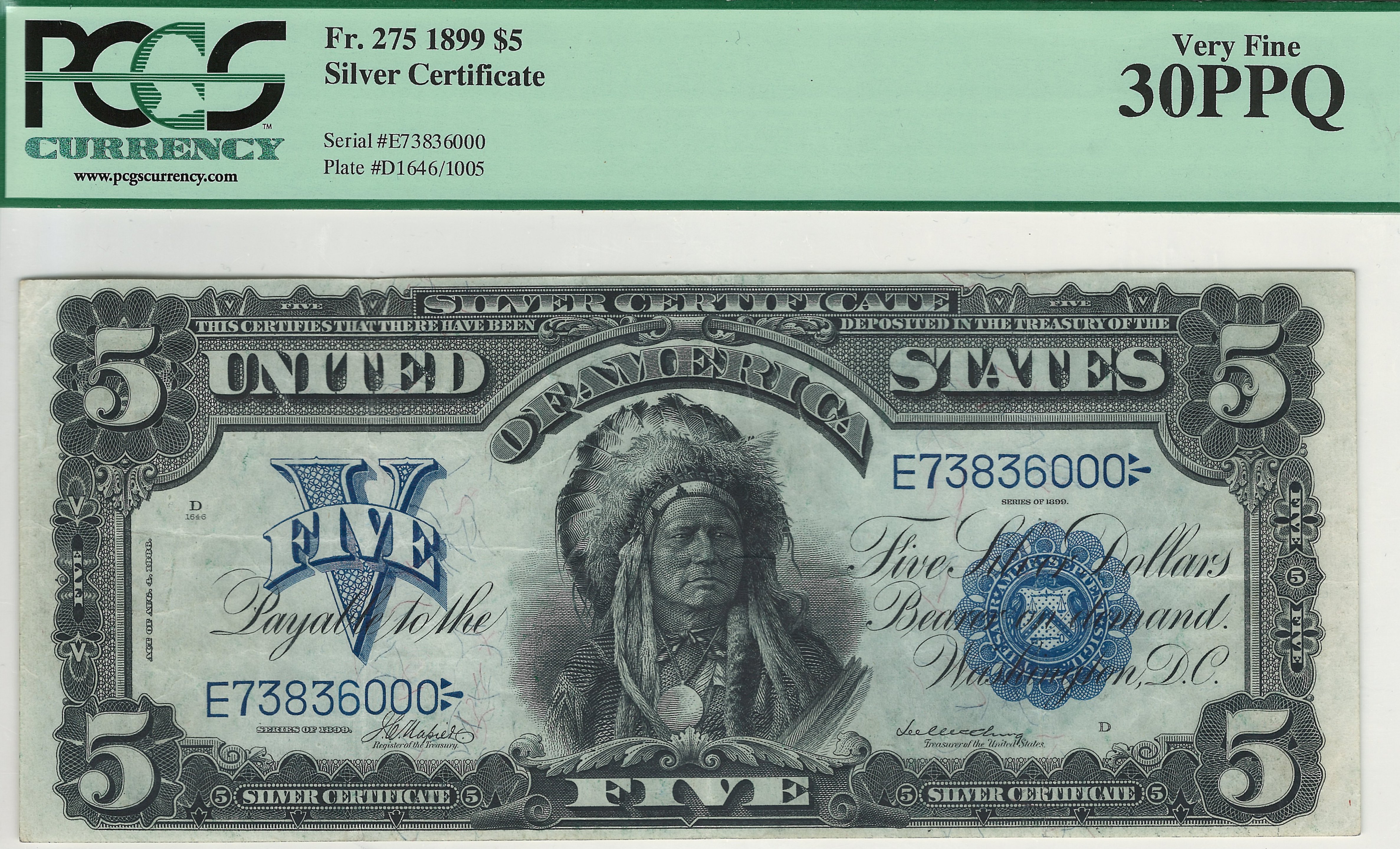 This is the famous 1899 $5 Silver Certificate commonly referred to as the Chief Note. It features the head of Ta-to-ka-in-yan-ka, also known as Running Antelope who was a member of the Oncpapa tribe of Sioux Indians. This is the only issue of US paper money for which a Native American was selected as a central figure. Chief notes are one of the most popular issues of all US currency. This example is a very nice well margined note that is in a PMG-30EPQ holder. This is probably the more stunning PMG-30EPQ note I have. There are NO rips, tears, pinholes, bank marks or anything else wrong with this note. The serial number is E73836000.