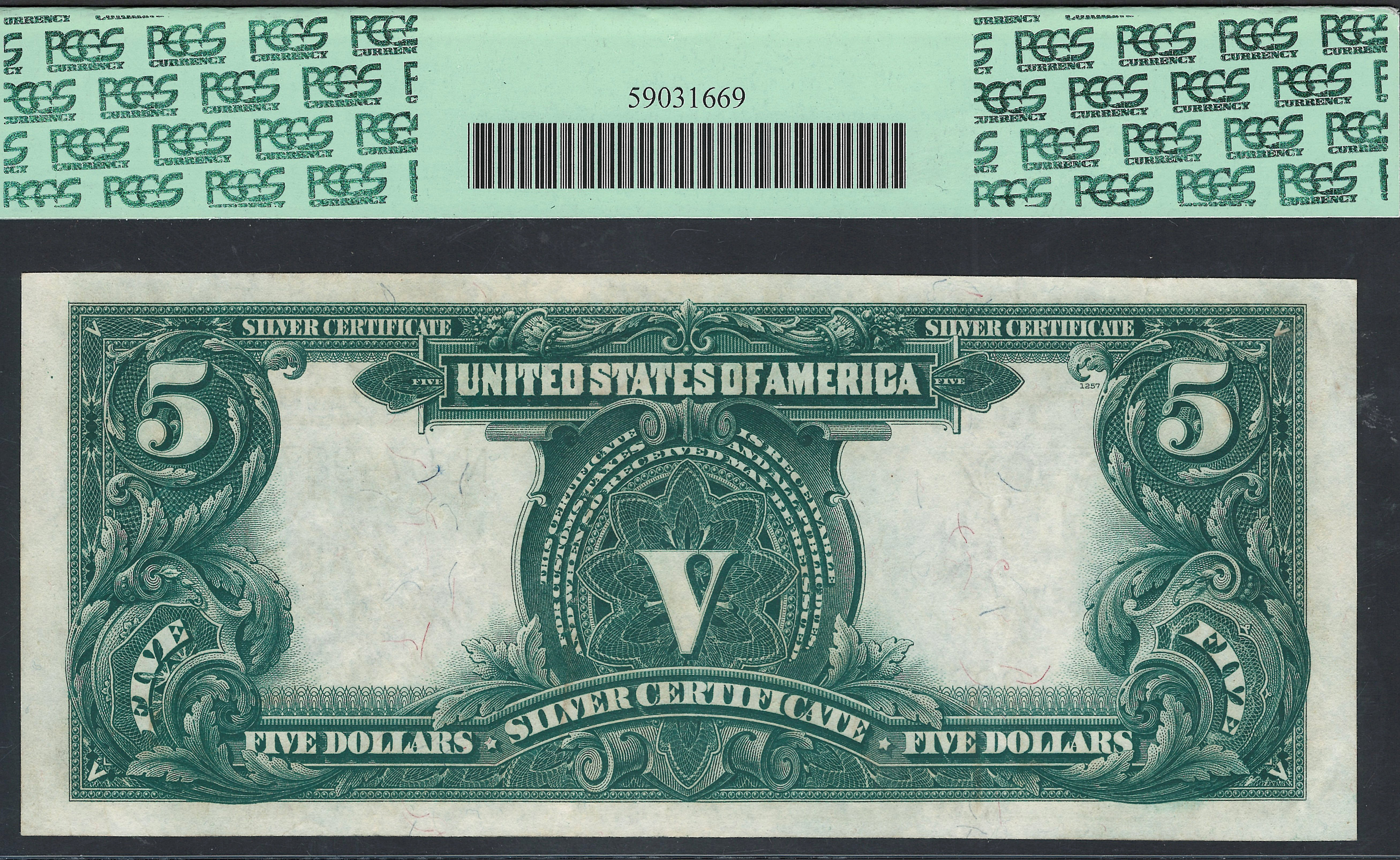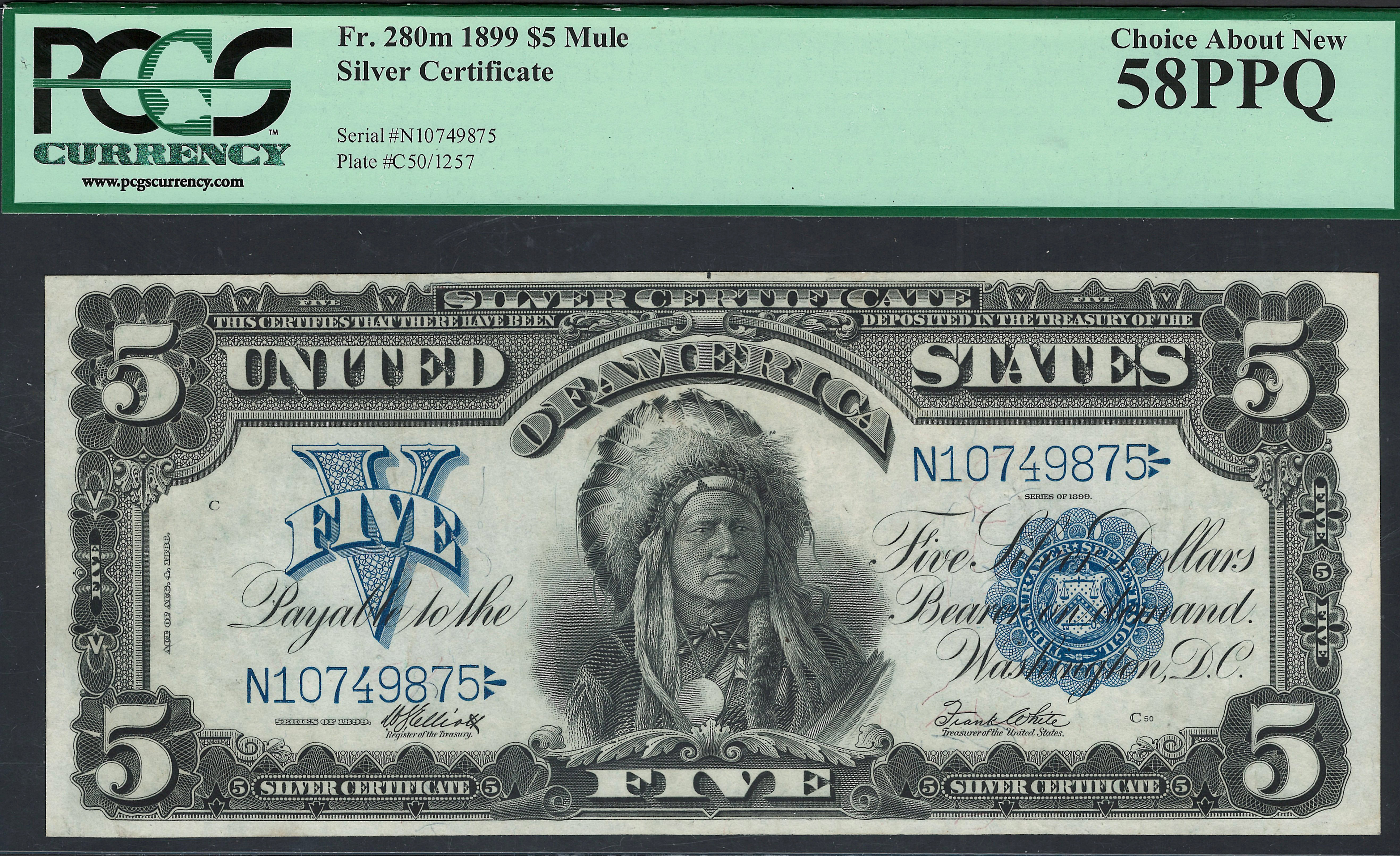 This is a real nice example of the 1899 $5 Silver Certificate commonly referred to as the Chief note. The serial number is N10749875 and it is in a PCGS-58PPQ holder. This note was just a small paper bend away from a GEM-66 holder. The front faces up like a GEM-66 note with the even margins on the front and back. Check out the beautiful blue inks on the scalloped seal and serial numbers. It is totally original through out with no problems. It is also a mule note. Simply put it had two different plates that it was printed on. Not the two original front and back plates were used.