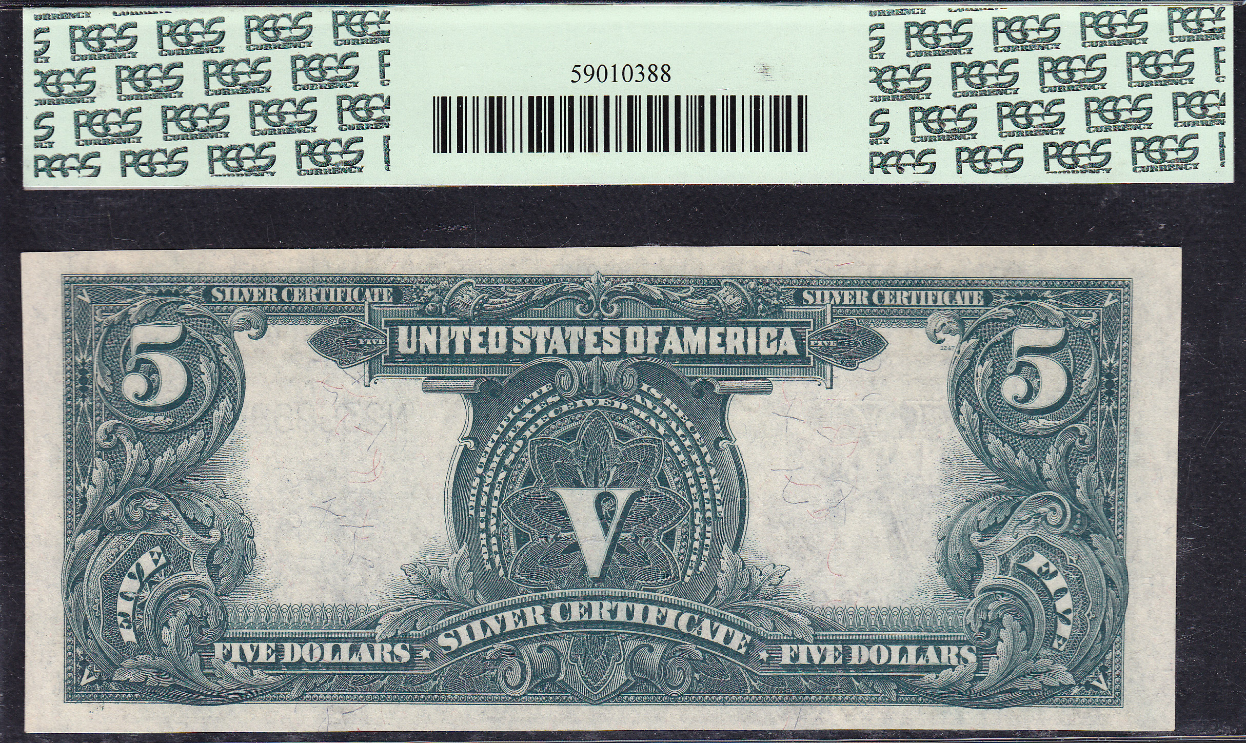 This is a beautiful $5 SC Chief Note that would have easily qualified for full GEM status if it had a tiny bit more bottom margin on the left. However, its a GREAT PRICE for the grade. The serial # is N2369684.