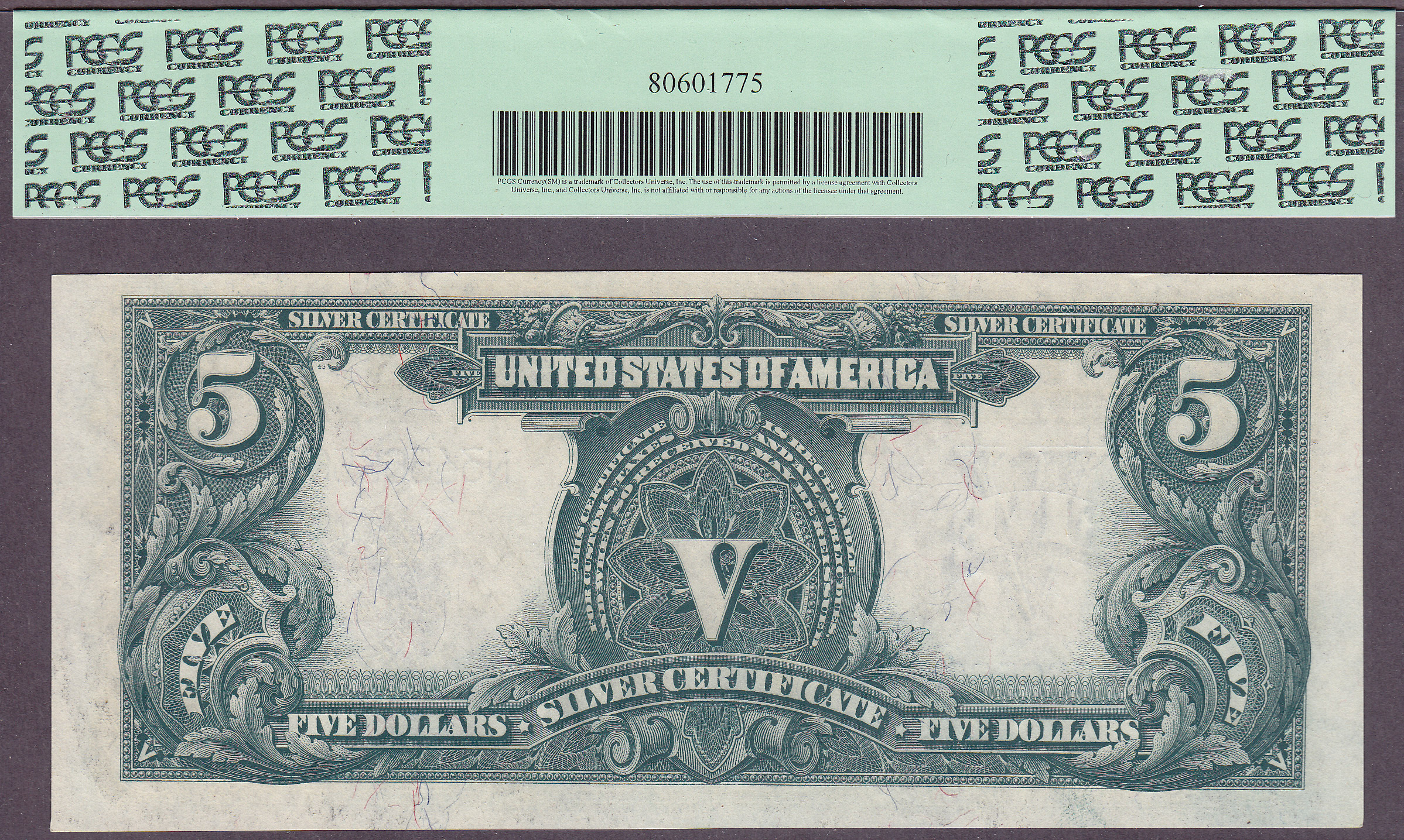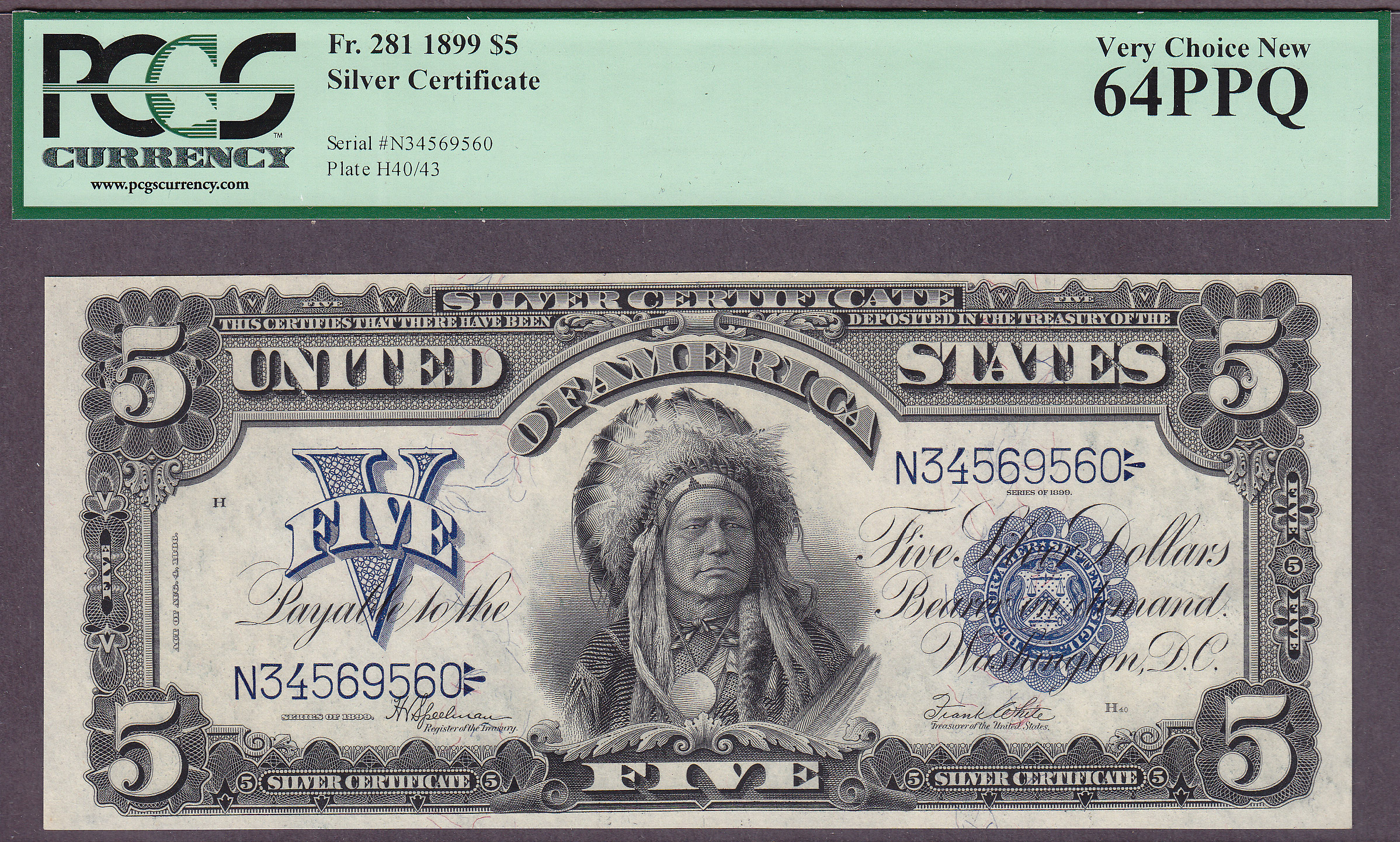 How about a near GEM-65 1899 $5 CHIEF Silver certificate. The serial number is N34569560 and is in a Choice Uncirculated PCGS-64PPQ holder. A un-noticable back margin top to bottom barely keep this example from a $8K GEM note. At any rate it is totally original and has no issues what so ever. The Chief note is one of the most popular notes for all collectors.