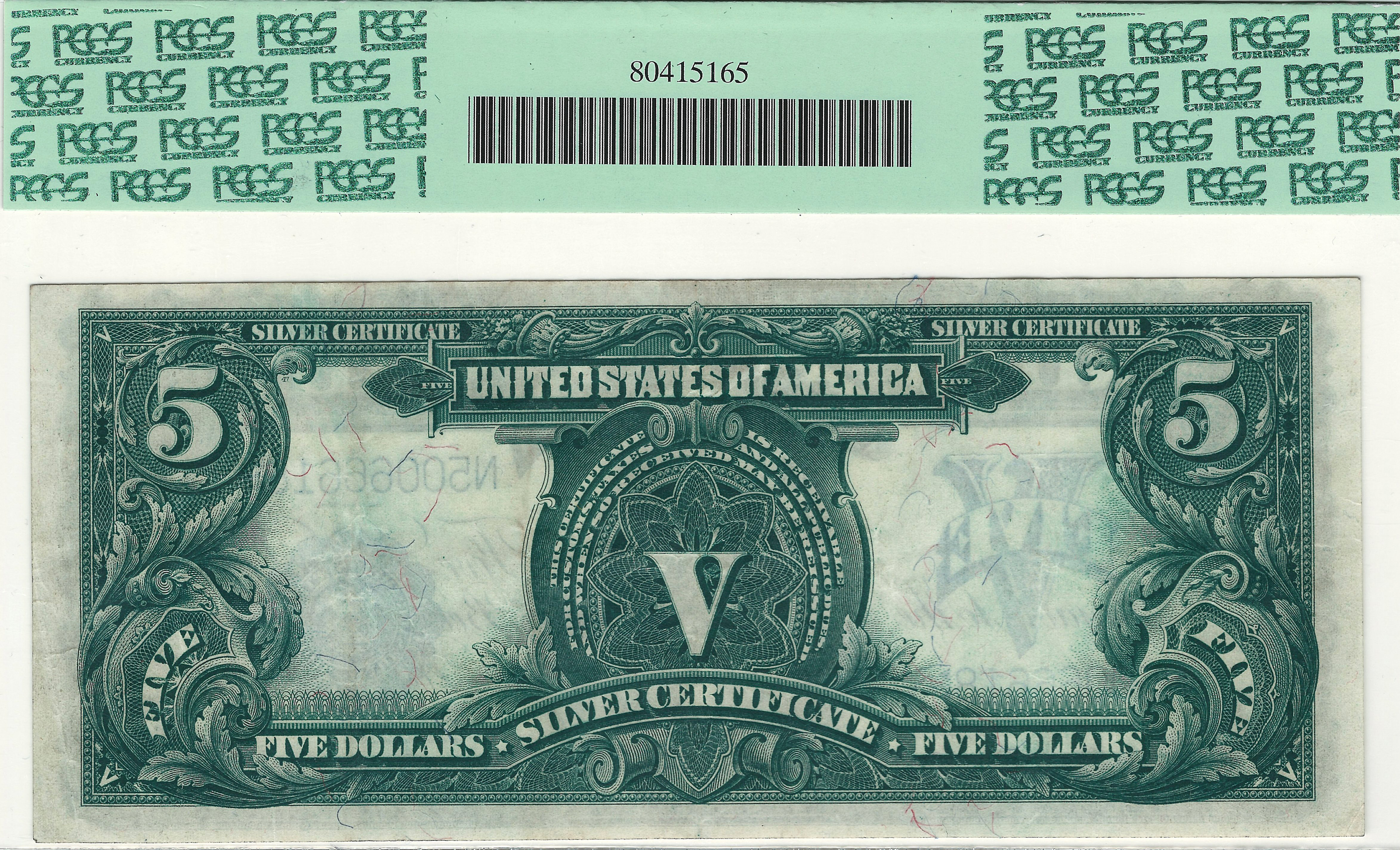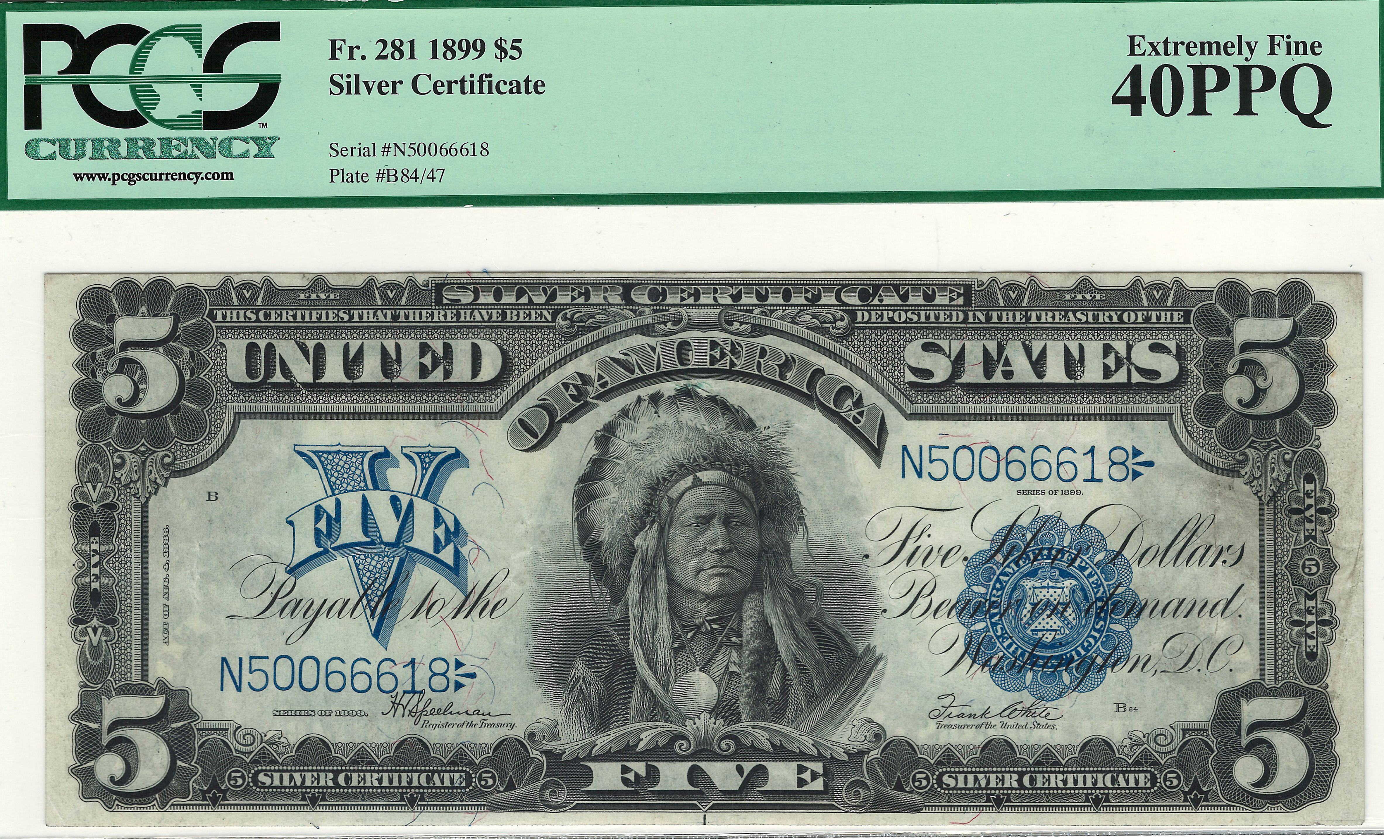 Here is another great example of the ever popular 1899 $5 Silver Certificate commonly reffered to as the Chief Note. It is totally original and has never been doctored. There are no rips, tears, pinholes or bank stamps. The four corners are squared and the centering is dead on. There are no hard folds with soil and the color is as bright and vivid as one would expect for a PPQ note. The origionality is effident in the paper and the embossing is easy to see from the holder. If you need a GREAT example of a real nice mid-grade note, this is the one. The serial number is N50066618 and is housed in a very nice PCGS-40PPQ holder.