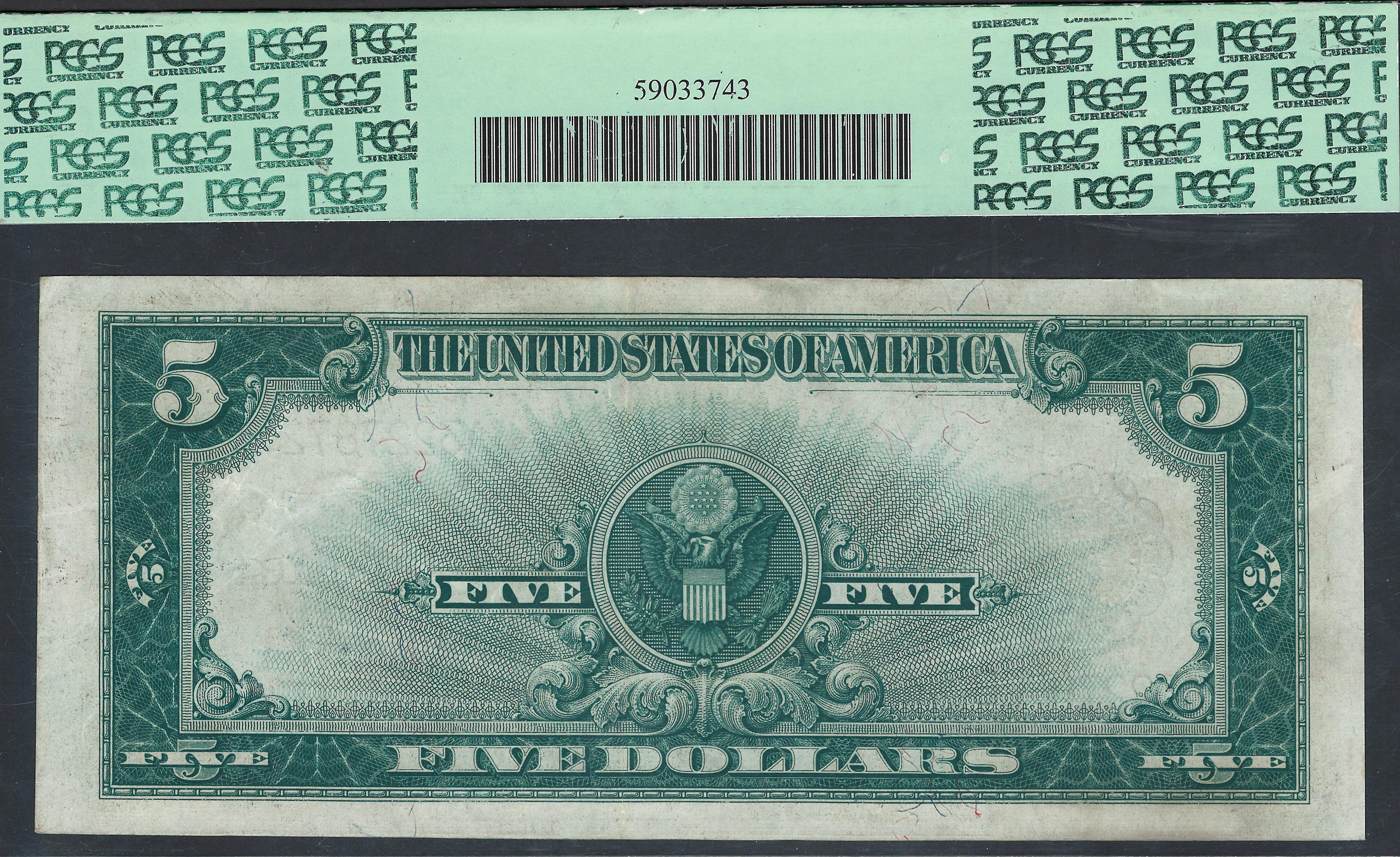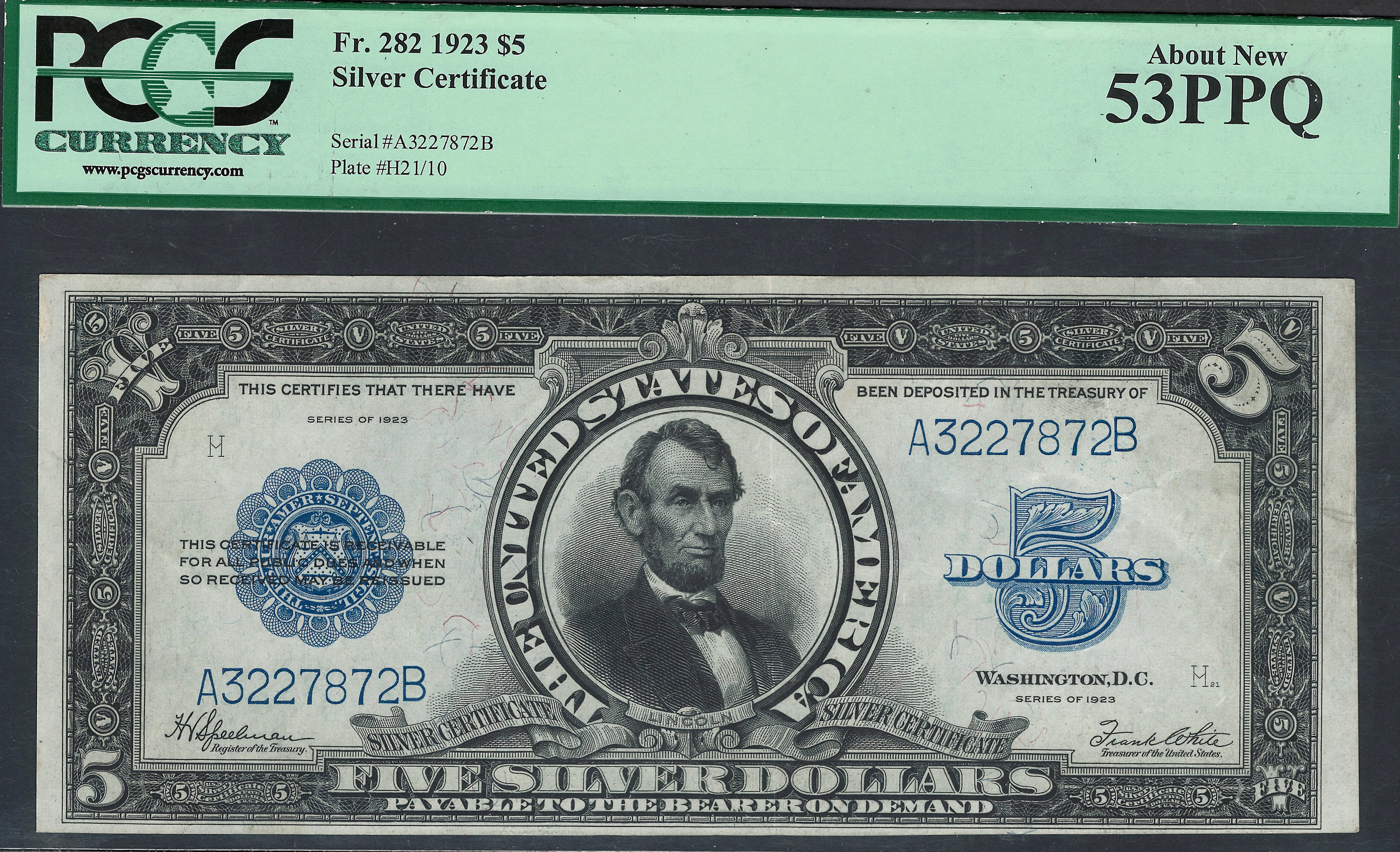 This is the famous 1923 $5 Silver Certificate commonly referred to as the Porthole Note because of the circular design around Abraham Lincoln's head. This is one of the real popular designs that is highly collected along with the Chief and Bison notes. the serial number is A3227872B and it is in a PCGS-53PPQ holder. This one has real a beautiful and fresh blue seal and serial numbers with nice broad walk margins on the back. You can still see the embossing from the serial numbers. This is a totally original porthole note with no rips, tears, markings, or anything else. Grab this one as you do not find many AU/PPQ notes in the porthole.