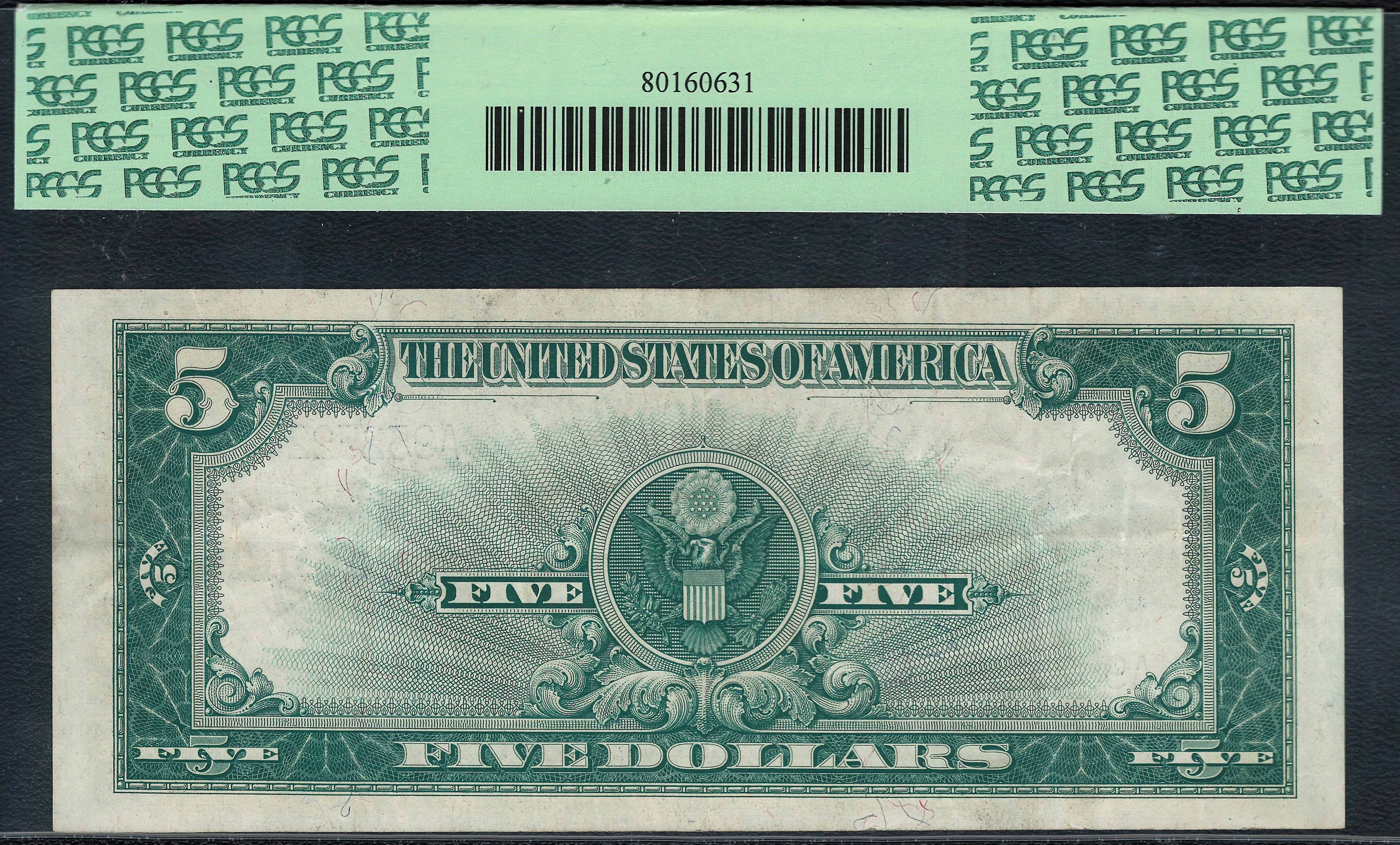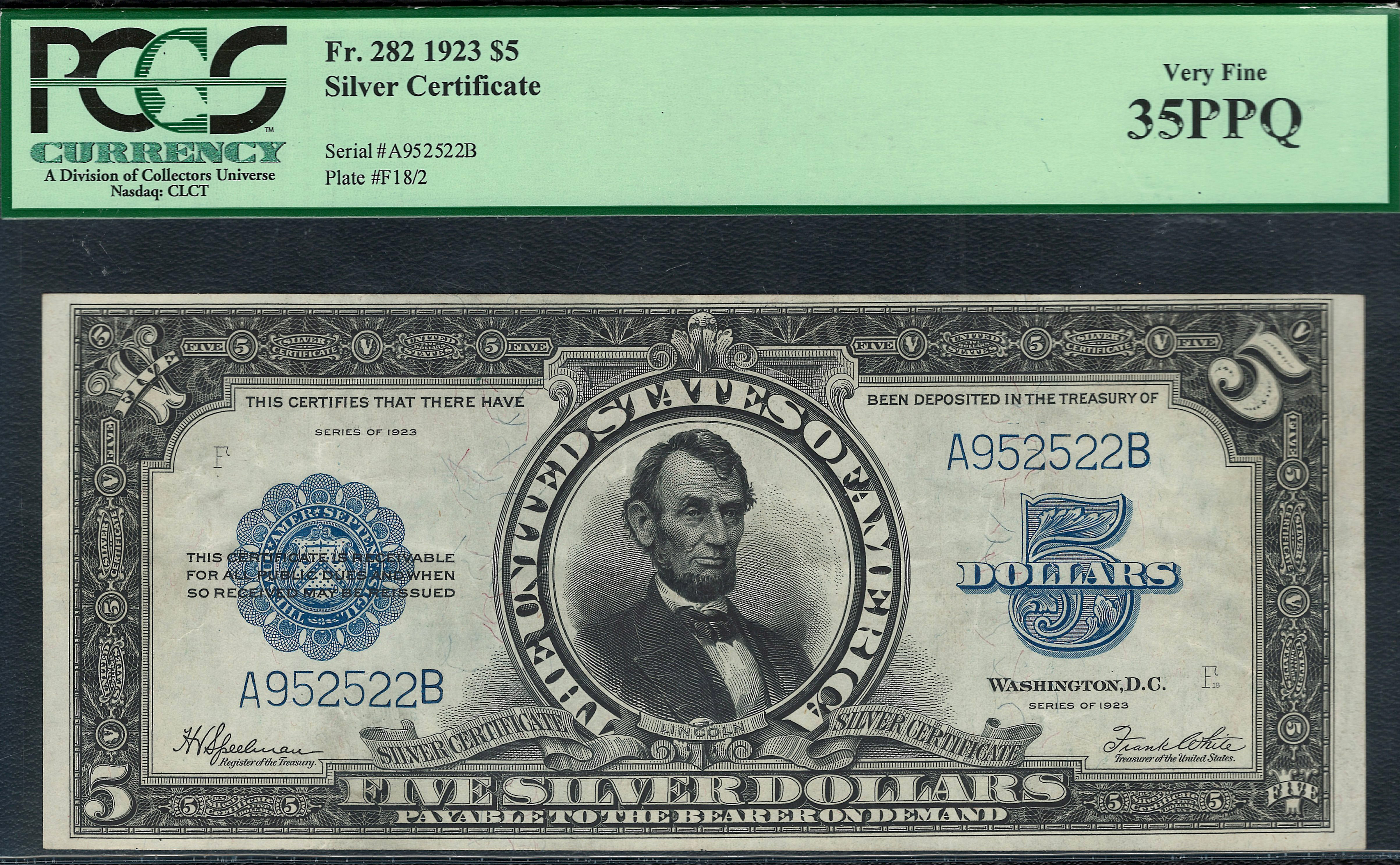 This is the famous 1923 $5 Silver Certificate also known as the Porthole Note because of a portrait of President Abraham Lincoln inside of a circular porthole. The serial number is A952522A and resides in a PCGS-35PPQ holder. There are NO rips, tears, pinholes, stains or marks. It is totally original. The price I am offering is wholesale price. A nice addition to a mid grade original collection.