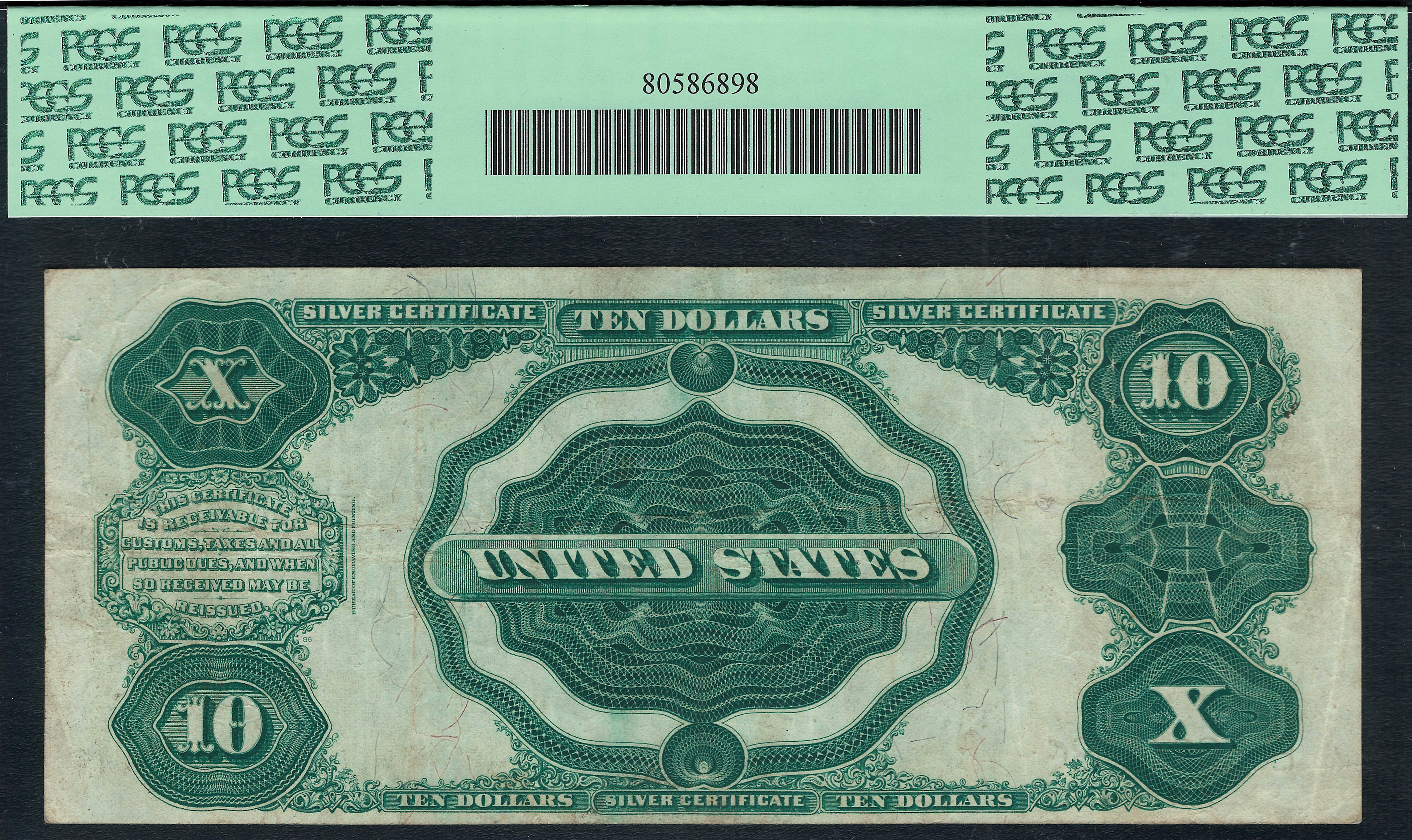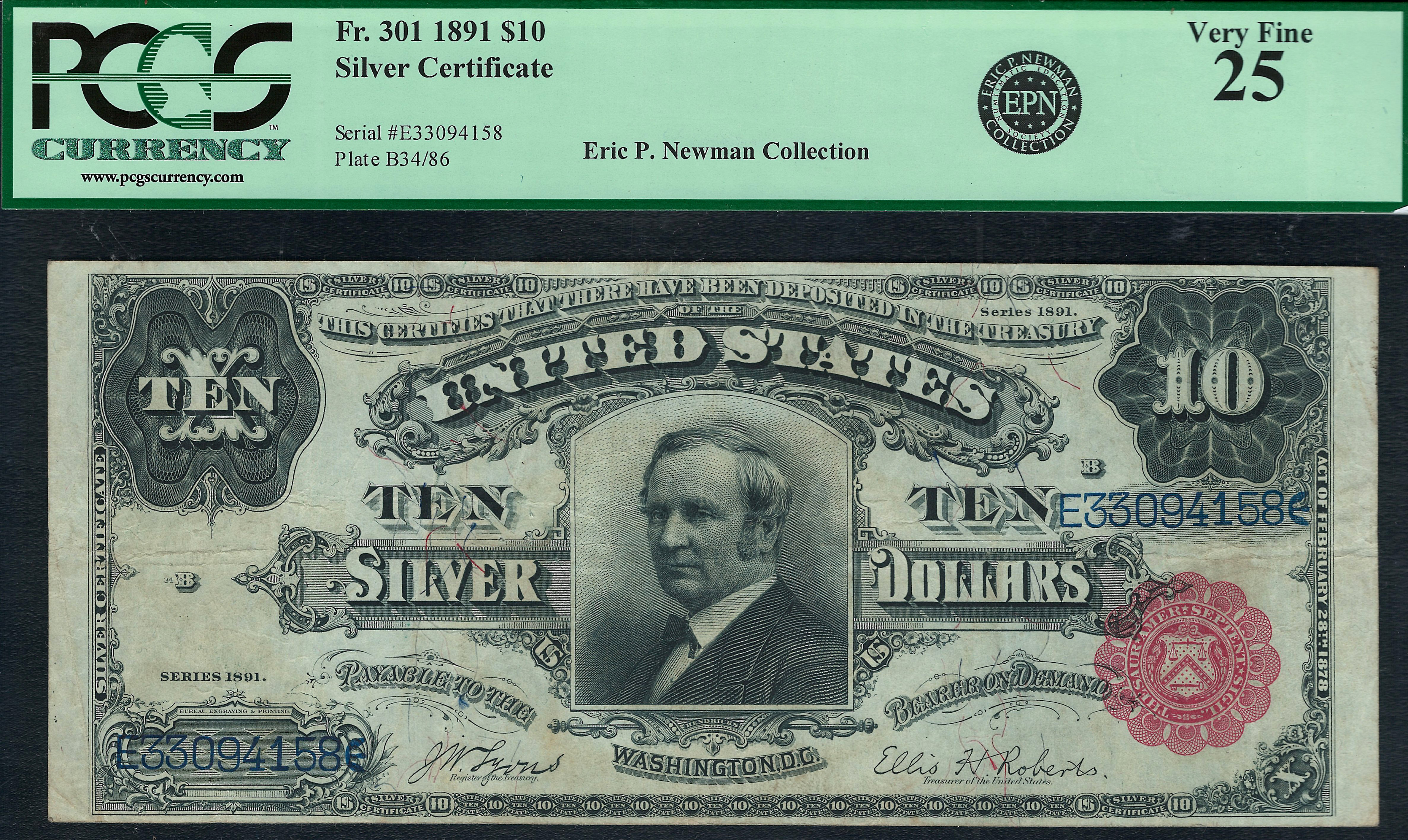 This is a Fr.-301 1891 $10 Silver Certificate commonly referred to as the TOMBSTONE note. The serial number is E33094158and it resides in a PCGS VF-25 holder. I normally do not put a non PPQ/EPQ not on my website, but this was an exception. I look the note over very closely and found no issues with it all, and most importantly it was such a great deal I could NOT pass it up. To be able to offer to you a nice Very Fine problem free 1891 $10 Tombstone at less than $1400 was just incredible. For those who do not know, the 1891 $10 L.T. Tombstone got its name because Thomas Hendricks, who was Vice President of the United states from March 4th, 1885 to November 25th, 1885...died in office. Not sure if his portrait was deliberately put inside a tombstone design, or was it purely coincidental? However you will have to admit, it fits!