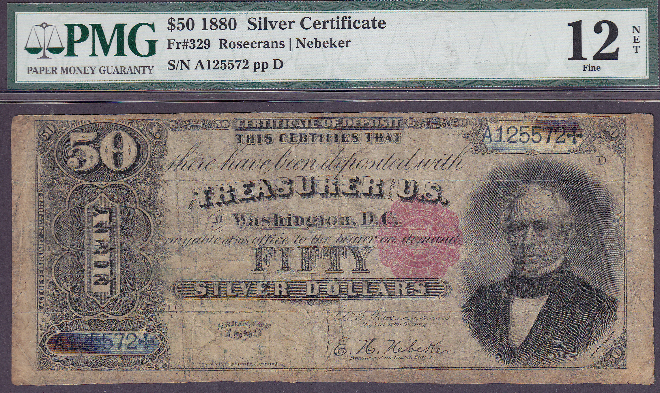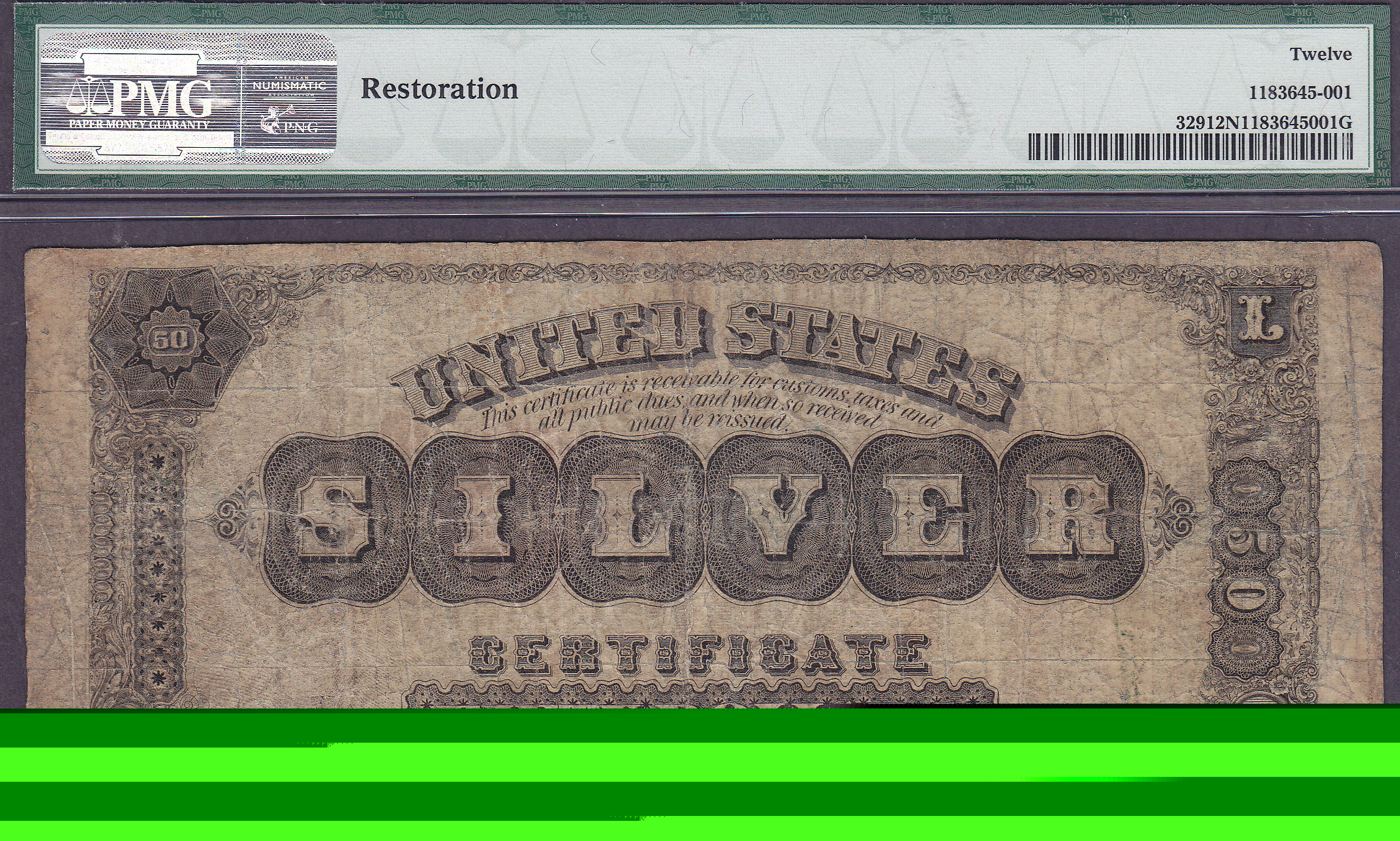 This is one of those notes that I have never owned. It is the famous 1880 $50 Silver Certificates. This note is new to the census as it was just recently discovered by someone out of New York. It was stuck away in a shoe of an elderly lady who passed away. Keep in mind there are only 27 know 1880 $50 Silver Certificates known. This is not a high grade one but it also wont set you back over $100,000 either. It is in a PMG Fine-12 holder with a NET connation. The bottom center margin has some minor restoration that was performed by one of the best in the country. You probably would not even notice it if it was not disclosed. I am so happy that it was done properly to preserve this rare note for future generations to appreciate. Believe it or not, there are no rips, tears or pinholes. It has survived quite well, in a shoe. I am very happy and pleased to be able to offer this rarity to the collecting community. You may never ever again get an opportunity to own one at this price. Check the large scans.