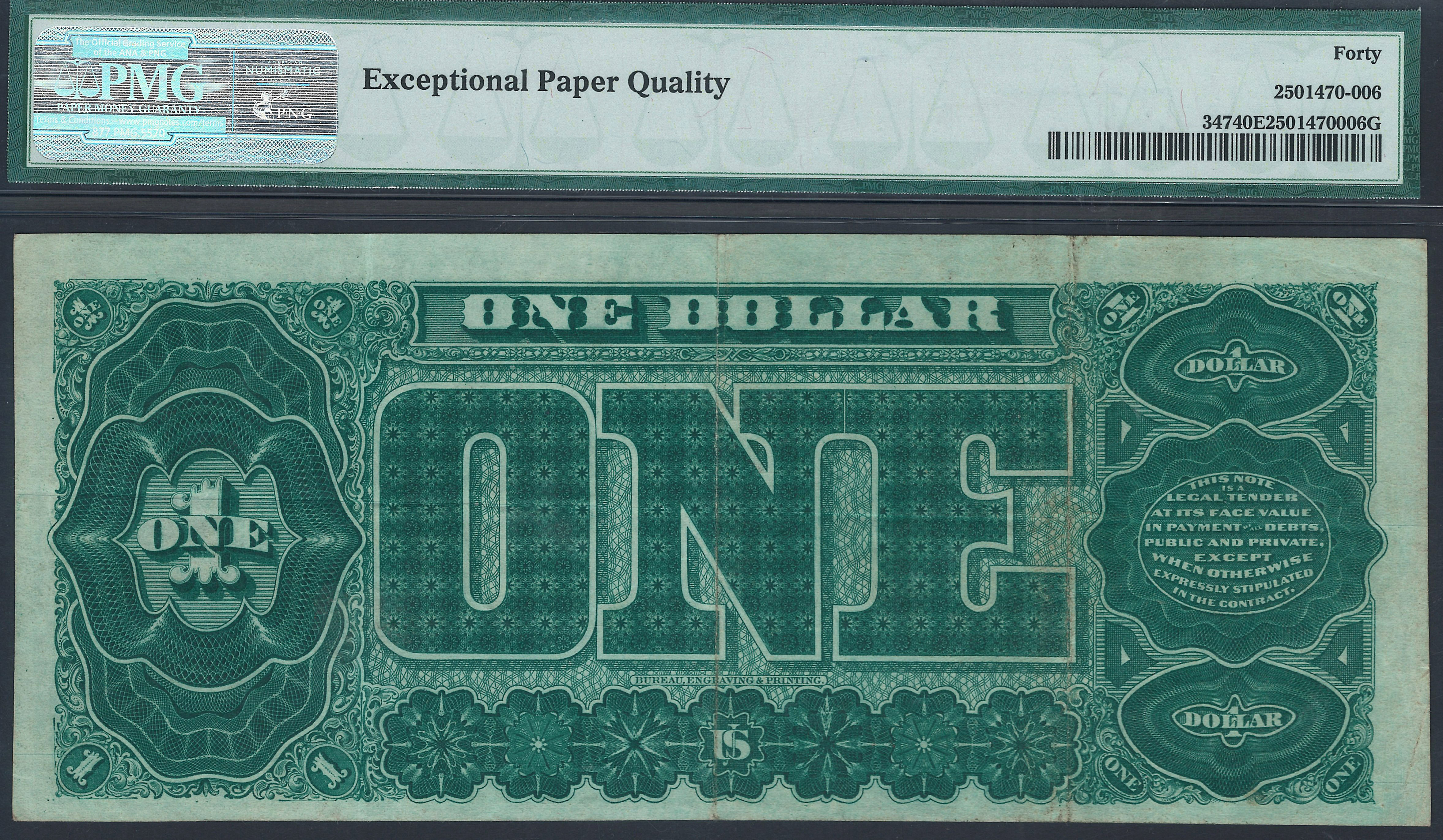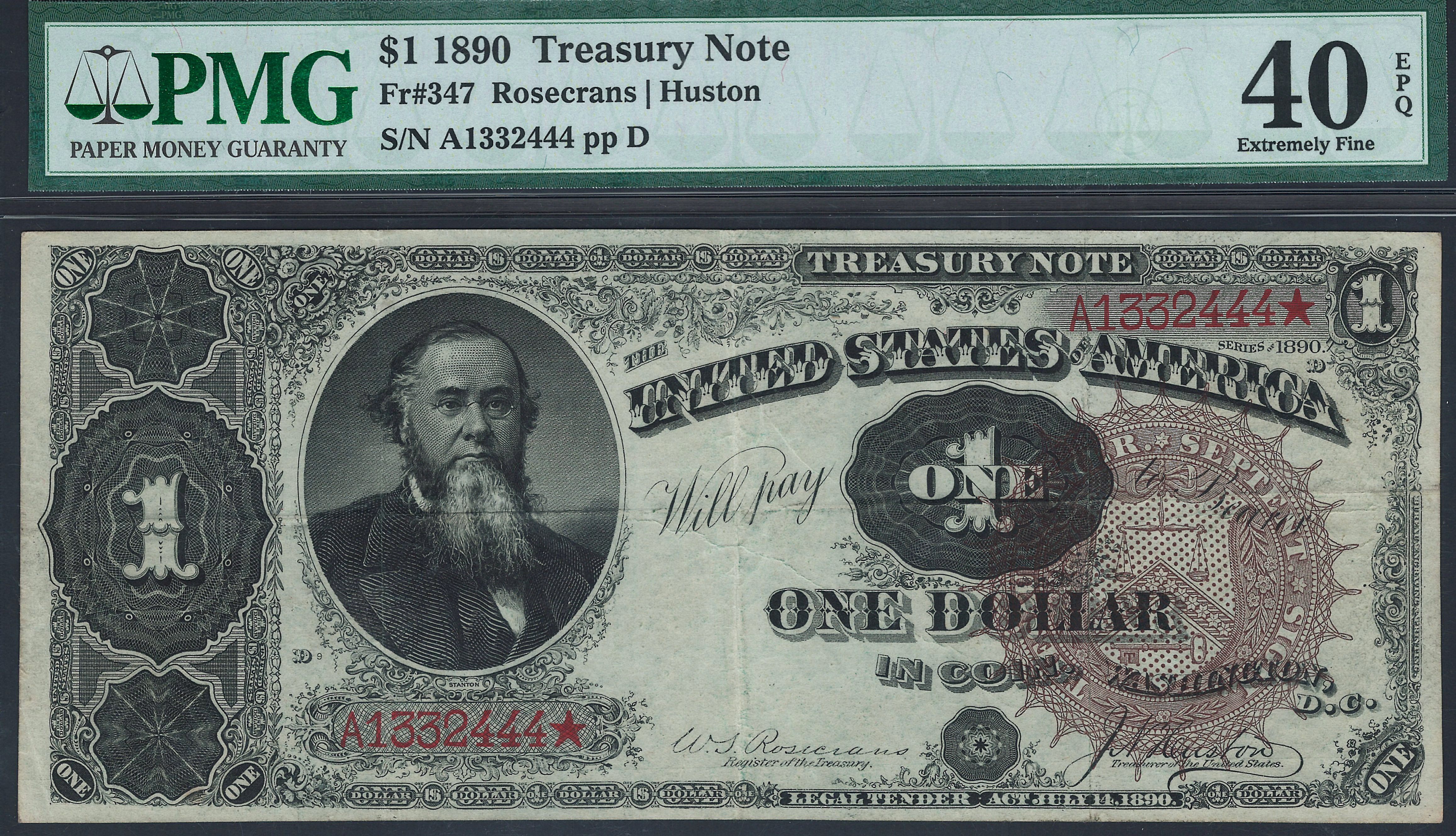 This is the famous 1890 $1 Treasury note with the popular large brown spiked seal. The serial number is A1332444 and it resides in a PMG XF-40EPQ holder. It is very difficult to find these notes mid grade that are in EPQ/PPQ holders. Most of them have been pressed and cleaned. The face of the note shows the head of Edwin M Stanton who was the Secretary of War under President Abraham Lincoln from 1862-1865 and Andrew Johnson from 1865 to 1868.The back features one of the many intricate designs used at the time. All Treasury notes were the result of the Legal Tender Act of July 14th, 1890 and were back by silver bullion which was purchased by the Treasury Department.