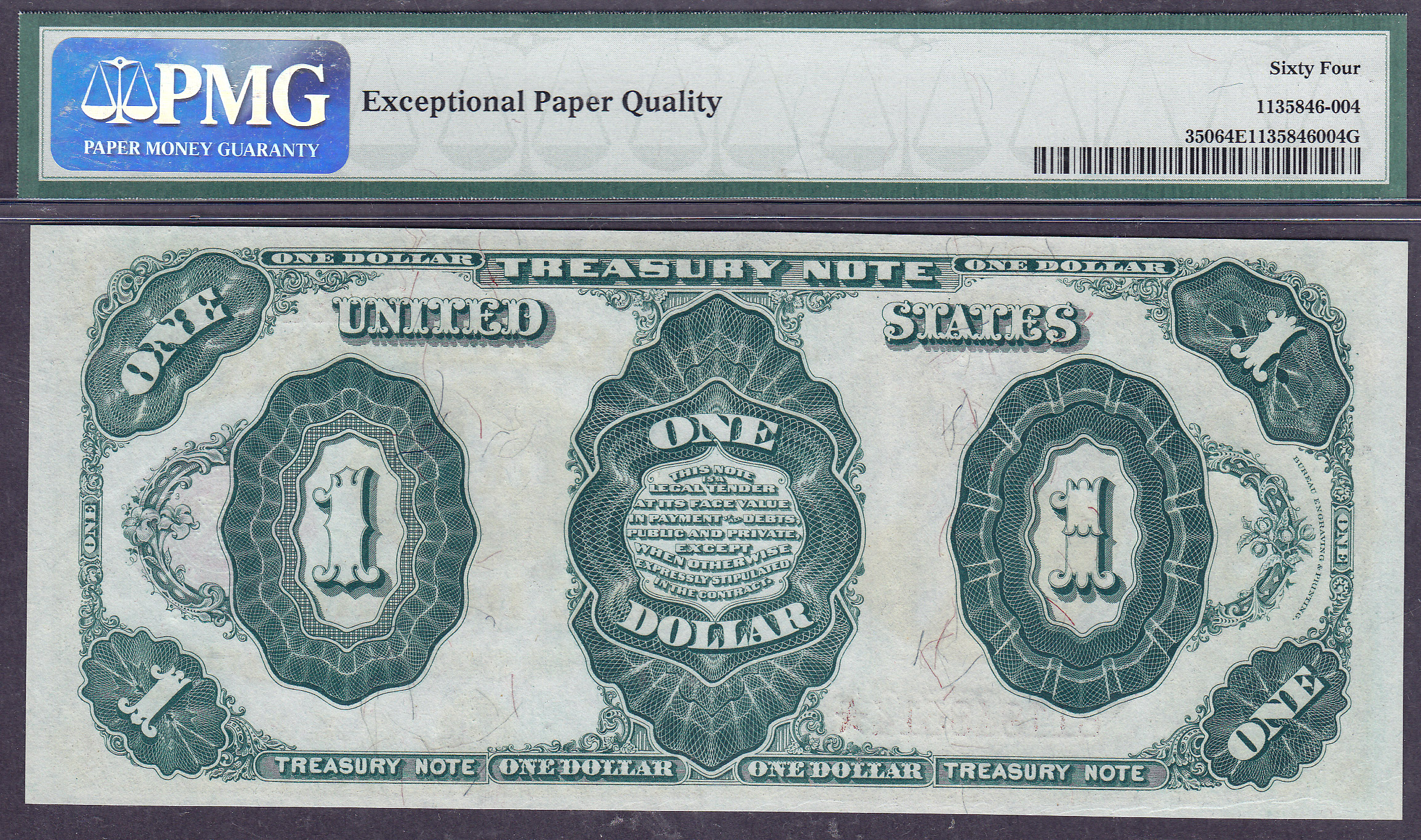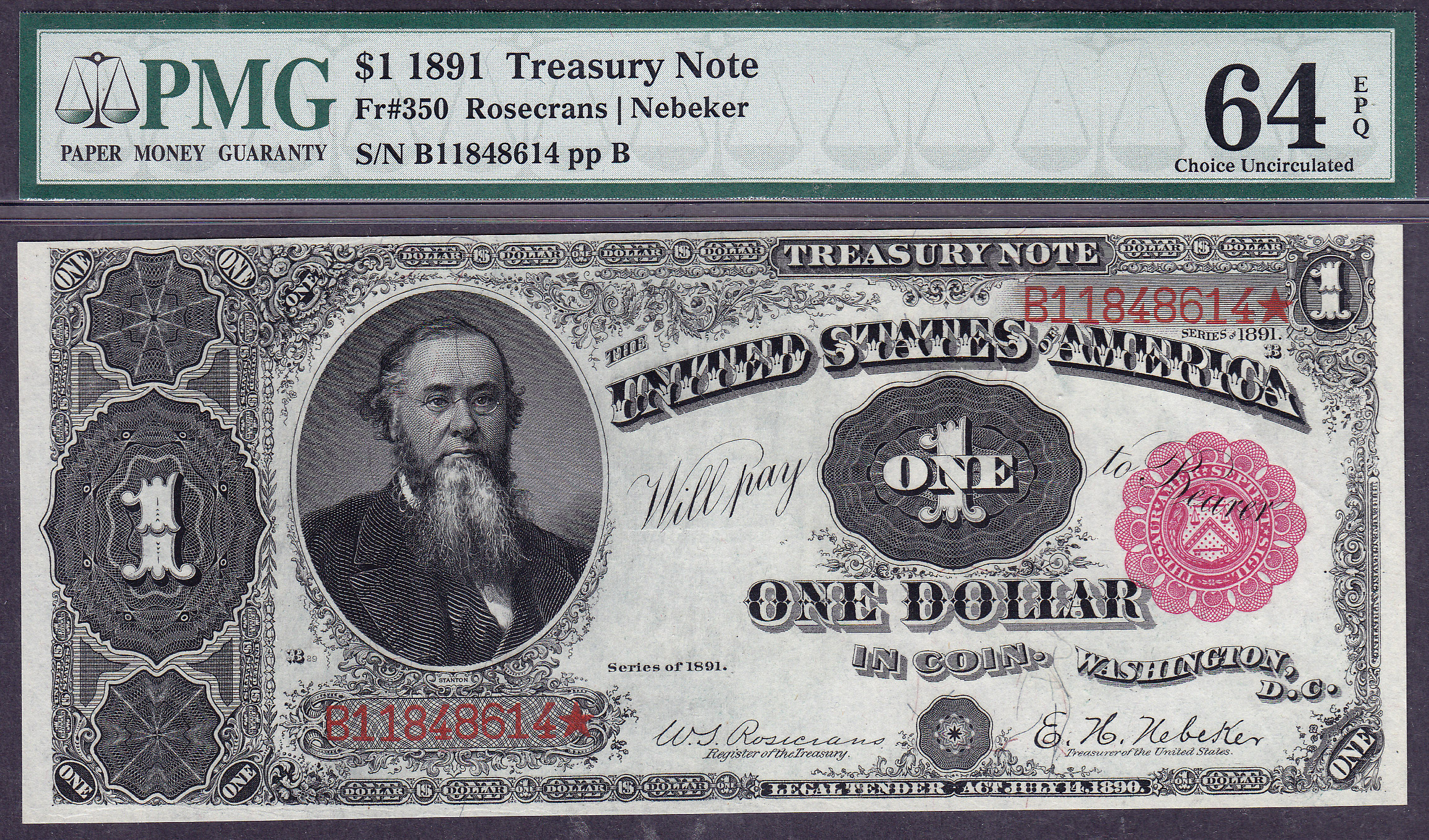 This is a 1891 Treasury Note with the small red scalloped seal. Youve got to check out the Ruby-Red Lipstick color of the seal. It is so vivid it shows through to the reverse. Superb embossing with no folds, tears or rips. Missing SUPERB GEM by the tiniest of margins, top vs bottom on the obverse. A totally original as the EPQ designates