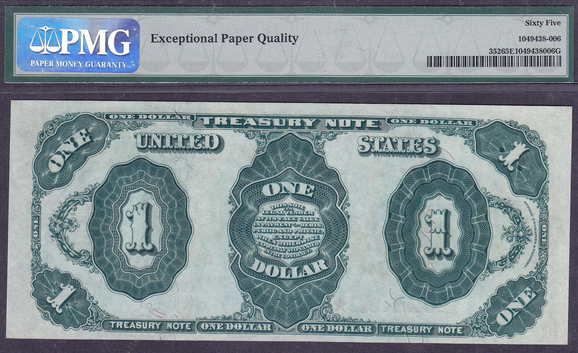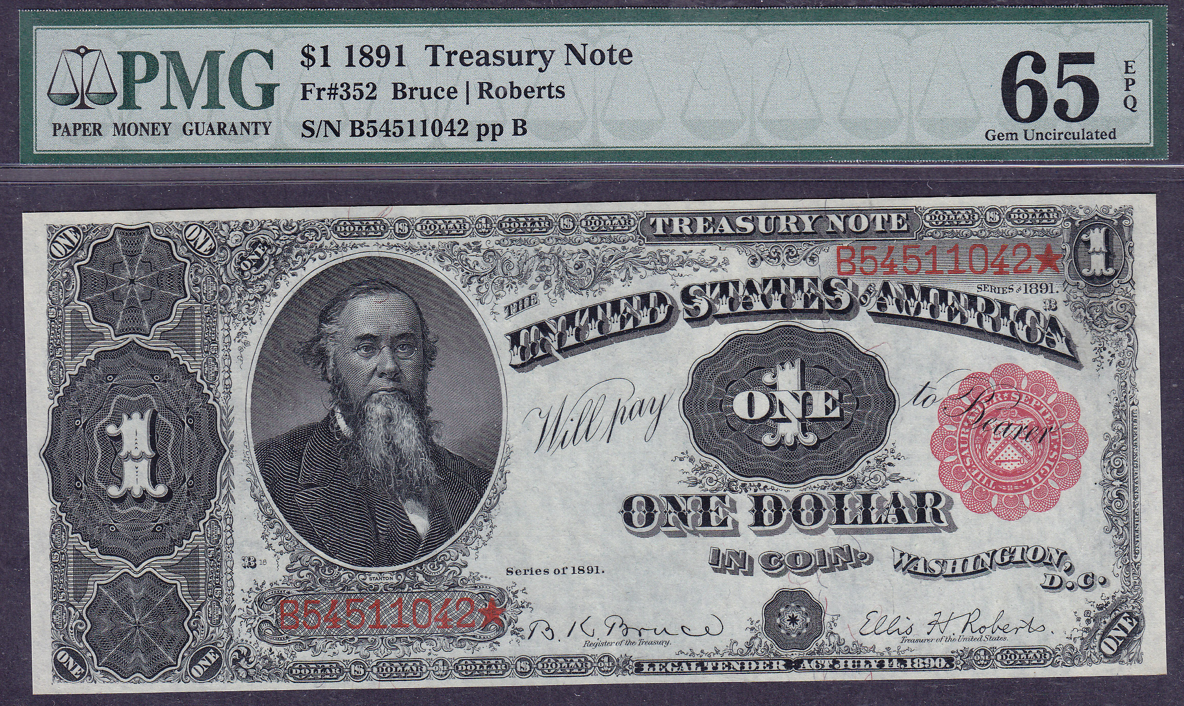 This is an exceptional example of the 1891 $1 Treasury Note commonly referred to as the Stanton note because Edwin M. Stanton, who was Abraham Linclons Secturary of War is pictured on the front. These notes were used in payment for silver bullion purchases.