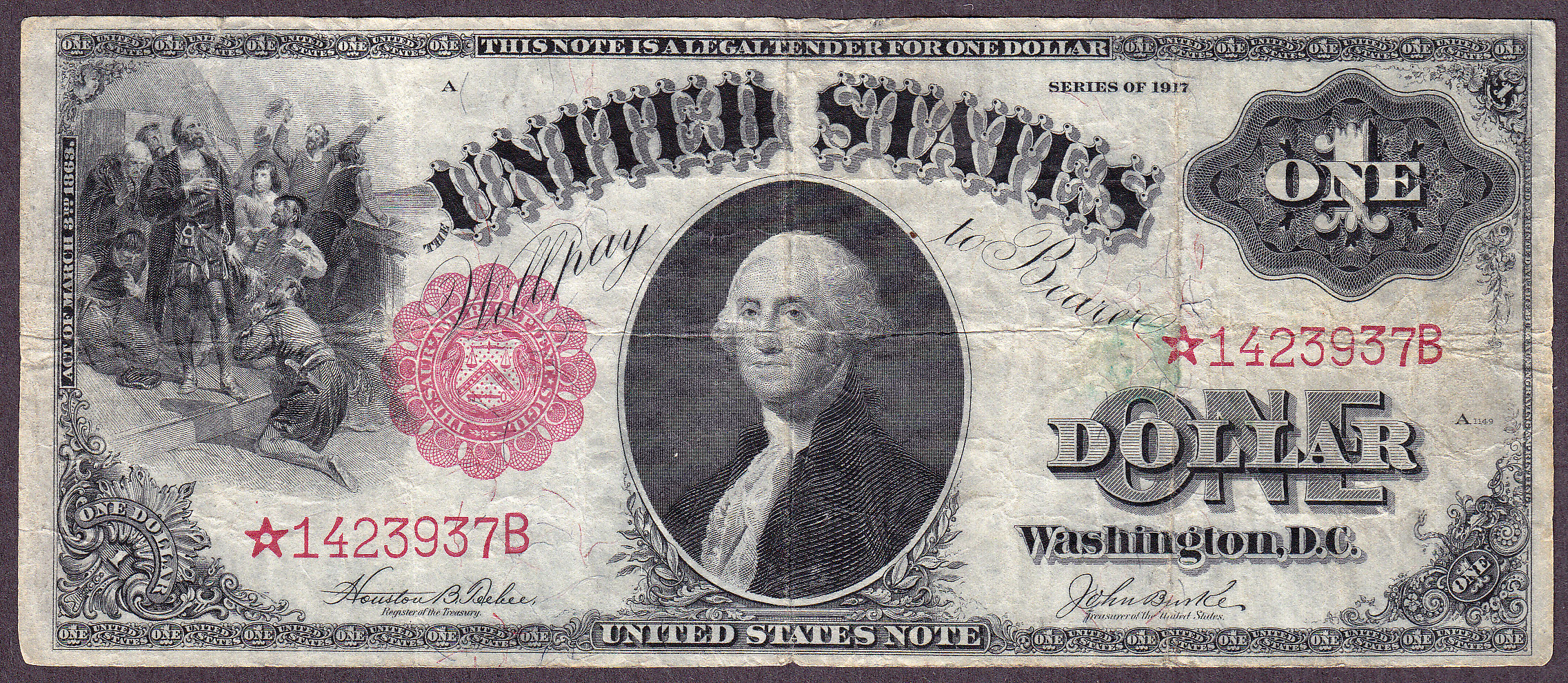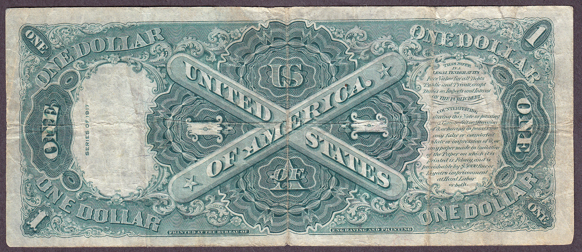 Here is a very nice Fr.-36* or a 1917 $1 Legal Tender star note. This type of note is commonly refered to as the Saw Horse note because of its back design. I actually like the intricate design on the back. There is a small split on the top left margin which you cannot see, however it is there. There are no pinholes or missing pieces. This is a good circulated type note for the star collector who does not want to spend a lot of money. I would call this a Fine Plus to a Very fine. The serial number is *4123937B. Check the large scans.