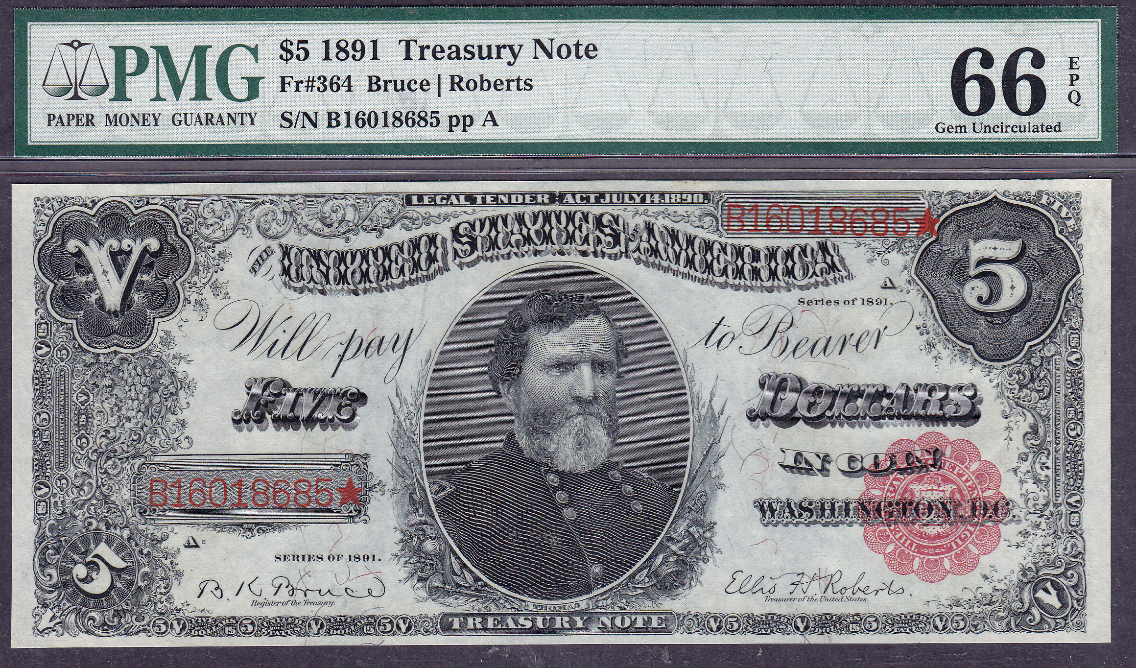 This is one beautiful 1891 $5 Treasury Note. Perfectly squared ,corners and even margins all the way around. The multi-colored fibers are easily seem. The embossing jumps out at you. The red seal and serial numbers are bright as the day it was printed. No rips, tears, folds, pinholes, bank stamps, missing pieces or anything else. It is in total pristine condition. Serial # B16018685.