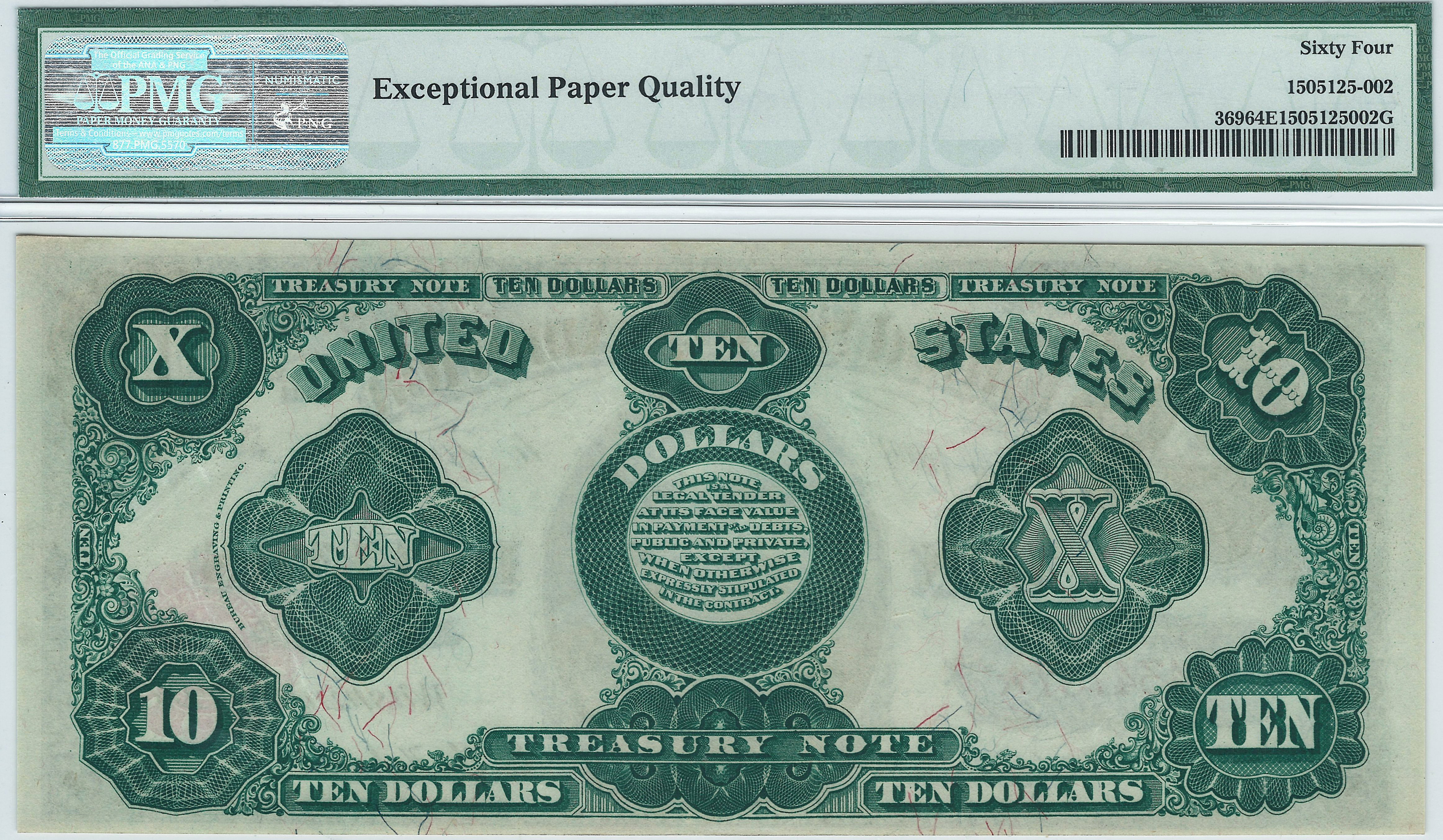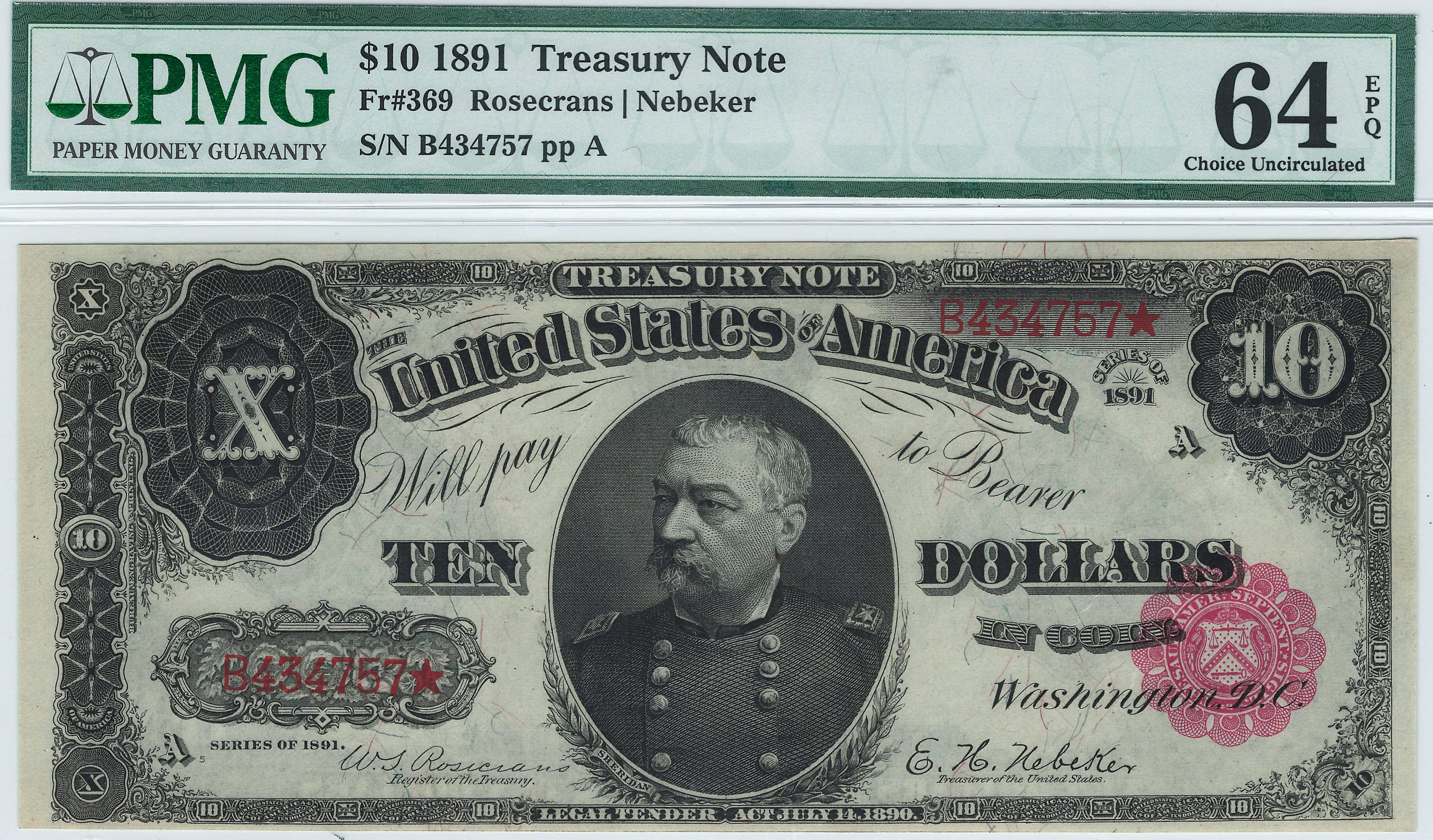 This is a very nice Fr-369 or 1891 $10 Treasury note. The serial number is B434757 and is in a PMG-64EPQ holder. This is sometimes refereed to as the Sheridan Note. In the center of is the bust of General Phillip H Sheridan of Cival War fame who succeeded General Sherman as Commander in Chief of the US Army in 1884. Also featured on the front is the small red scalloped seal to the right. The two serial numbers displays the lipstick red inks. This is an outstanding example of an almost GEM-65EPQ note. There are no rips, tears, pinholes or marks of any kind. This is one $10 Treasury Note that many type collectors would want to add to their collection, especially at this price.