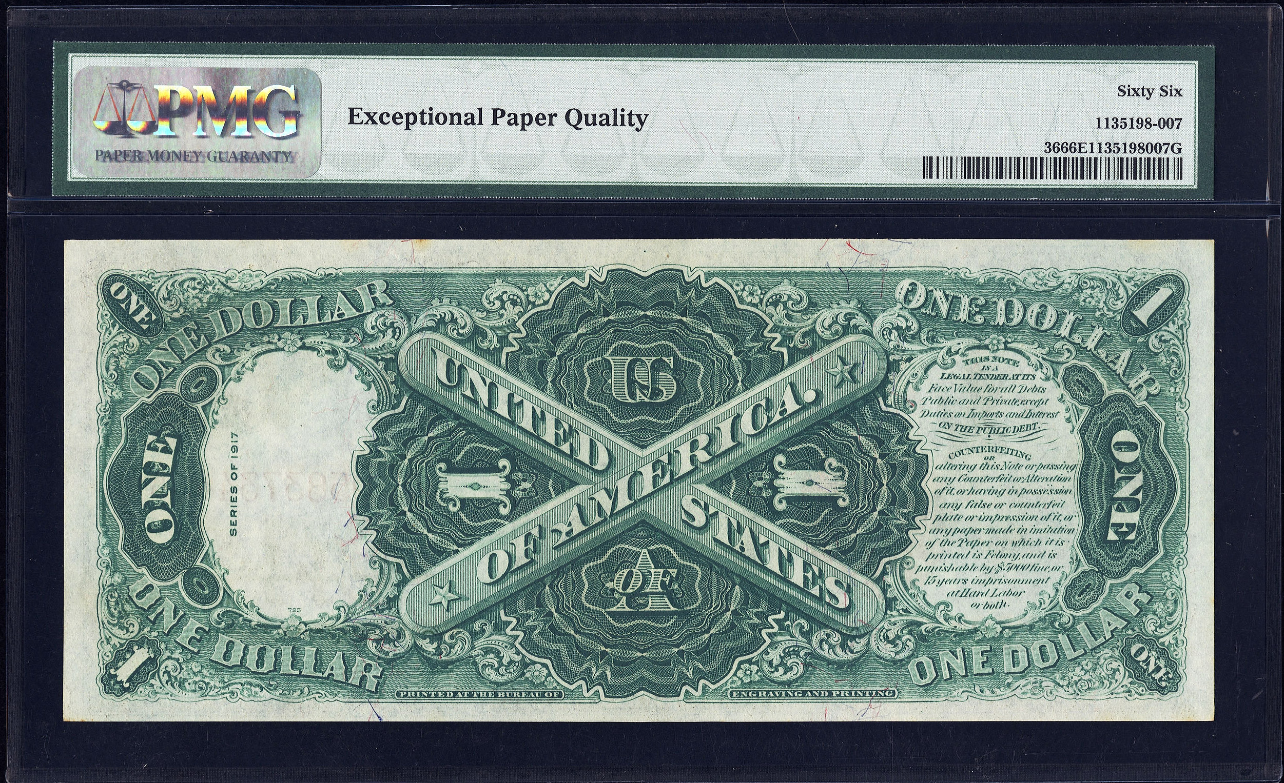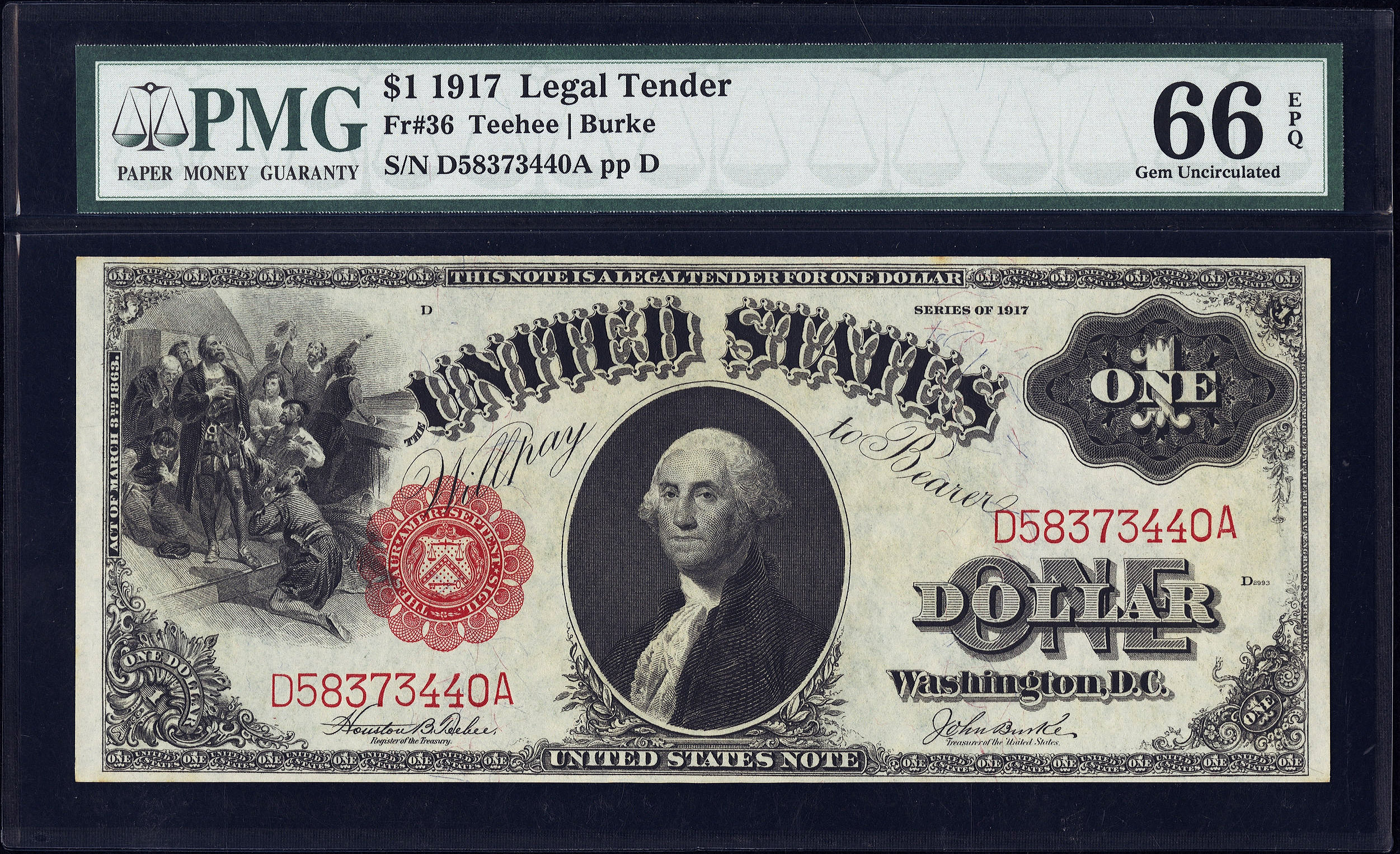 This is a pristine example of a 1917 $1 Legal Tender. This spectacular note features perfect margins and centering with embossing that can be seen through the third party holder. The vibrant lipstick red seal and serial numbers enhance this superb GEM Example. It resides in a PMG-66EPQ Holder. Destined for a GEM collection of type notes.