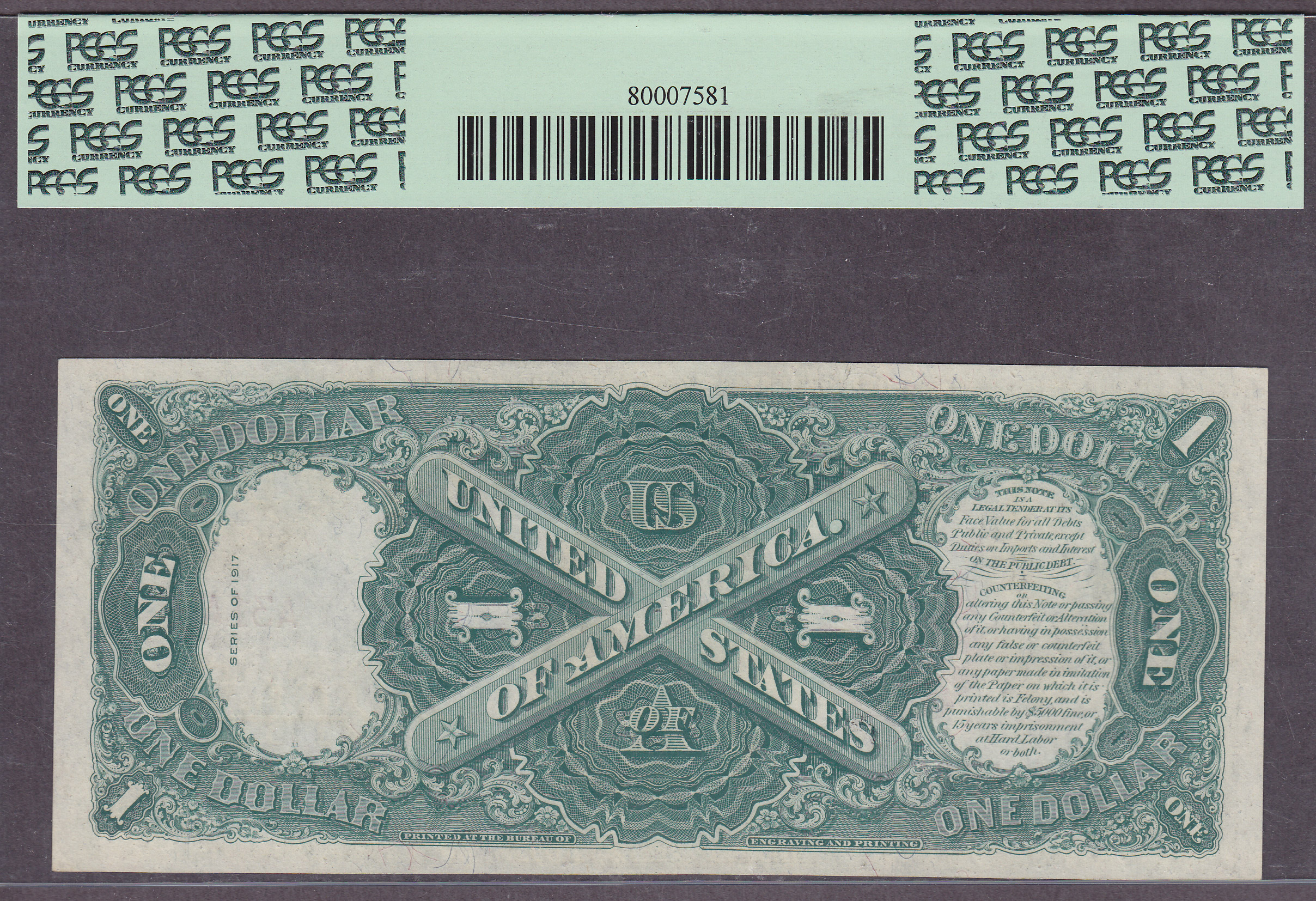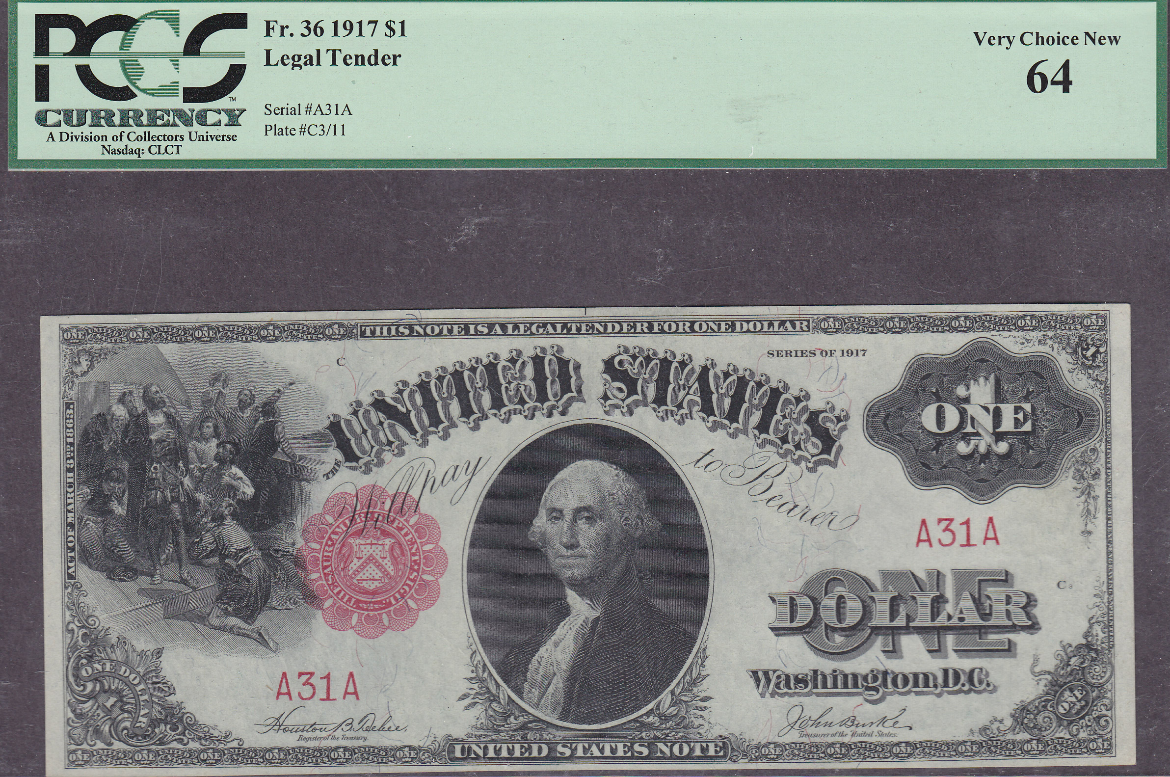 This is a very nice and clean 1917 $1 Legal Tender in a PCGS-64 grade. Serial # A31A.IT WAS FORMALLY A CGA-67 holder. However, everybody grades differently in todays market. Anytime you find any large size note from the A-A block....BUY IT...Fast!