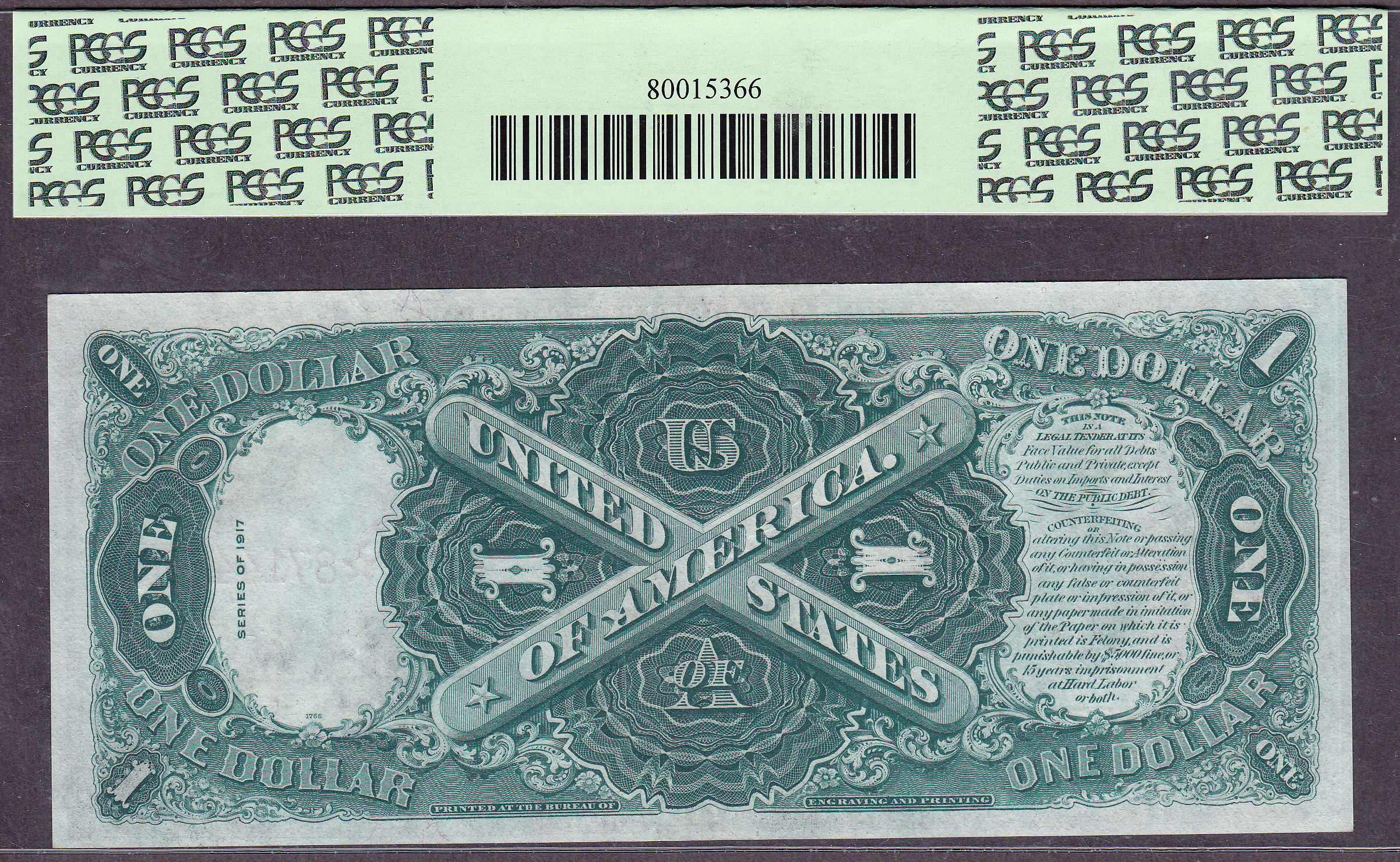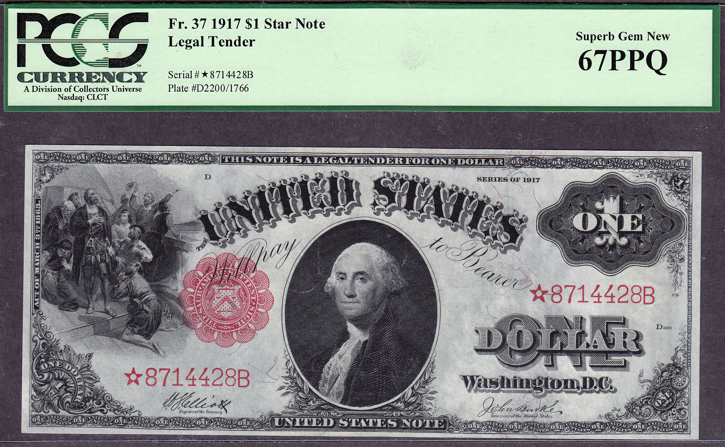 PCGS POP 1/none finer. PCGS-67PPQ for a Large Size Star Note? This is the finest 1917 $1 Legal Tender Star note, or for that matter any Large Size Star Note, that I have ever seen by either PMG or PCGS. The next highest PCSG grade in this star note is a PCGS-64PPQ. That is three grades lower. You have never seen a large Size star note in this type of unreal grade. It is a freak of nature! The serial number on this one is *3325479B. This is one of two notes just like this one. They are consecutive serials. It has been graded as a PCGS-67PPQ. The serial number is *8714418B. This is the TOP DOG of all large size star notes by any grading company. You may think that this is a lot of money for this note and you may be right...however remember when you are fortunate enough to have the ability and you are lucky enough to have the opportunity to acquire the finest known of anything....you do it! You only get one chance on this one.