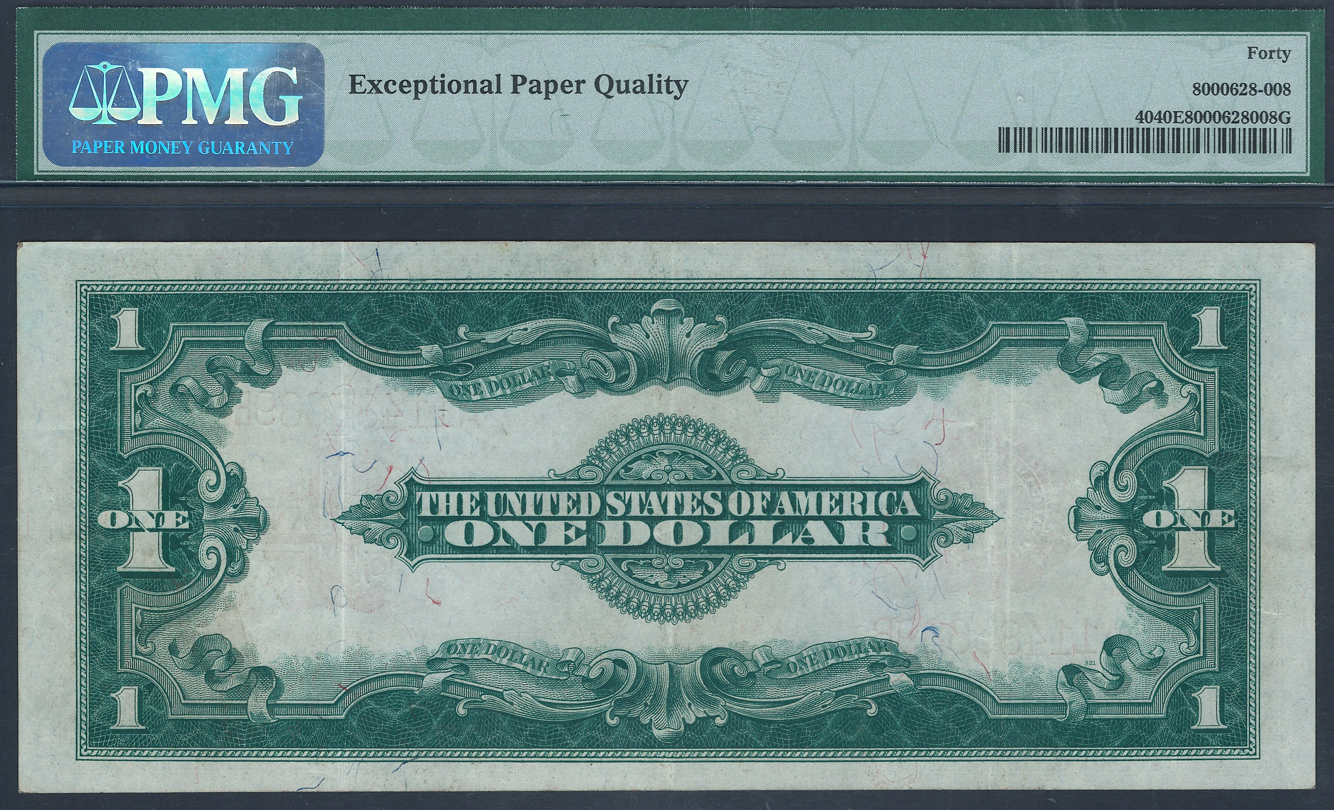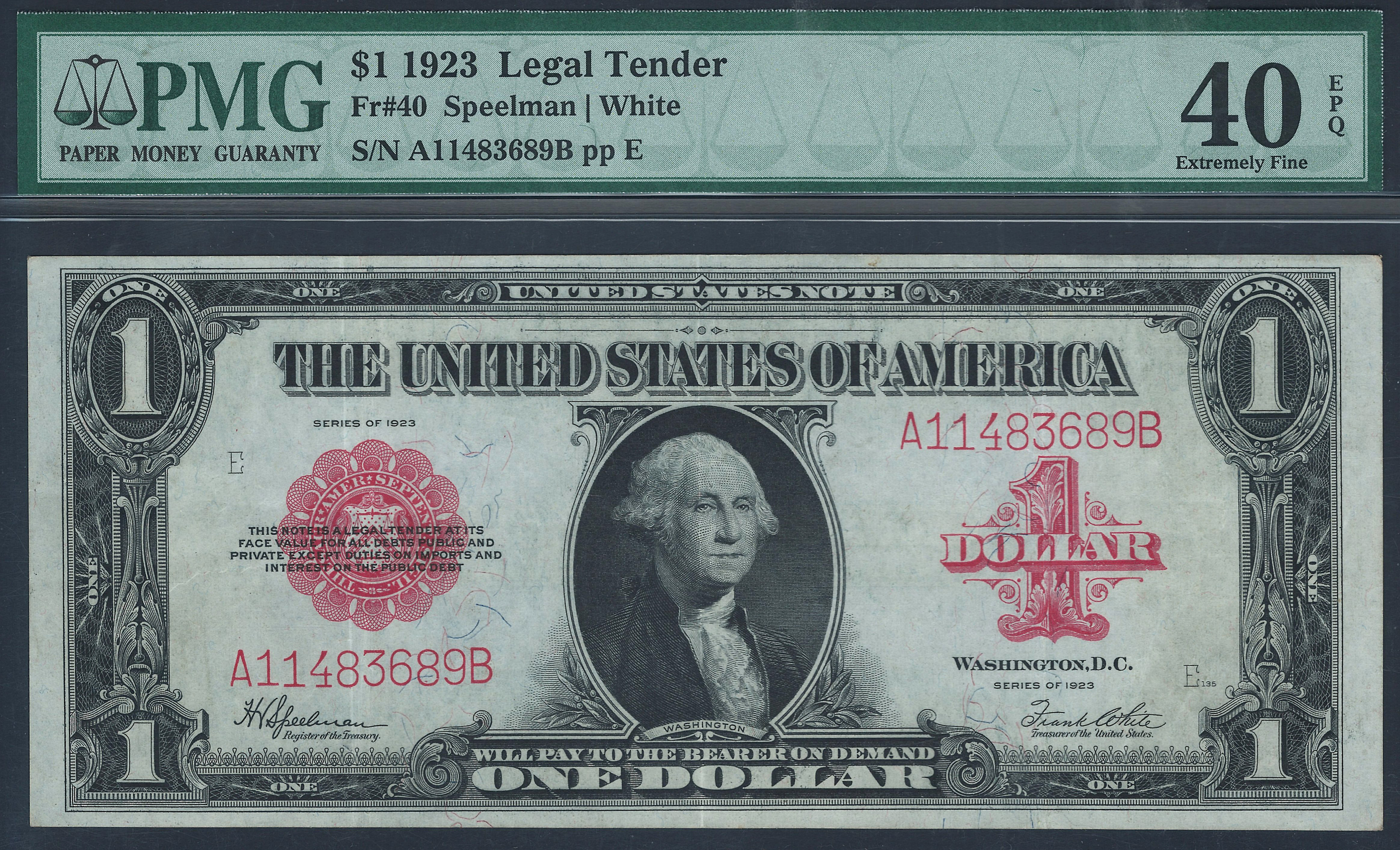 This is a very nice example of the 1923 $1 Legal Tender, which was the last of the large size notes. It features the red scallop seal to the left along with red serial numbers. George Washington is on the face. What make this note so unusual is that it is an EF-40PPQ. Most of the mid grade notes like this have been pressed out by note doctors to try and get a higher grade. This note is totally original with no rips, tears, pinholes or issues of any kind. That’s unusual. It faces up like a GEM with the perfect margins. You can see the three folds on the back. Someone put this note away a long time ago. The serial number is A11483689B and is in a PMG-40EPQ holder.