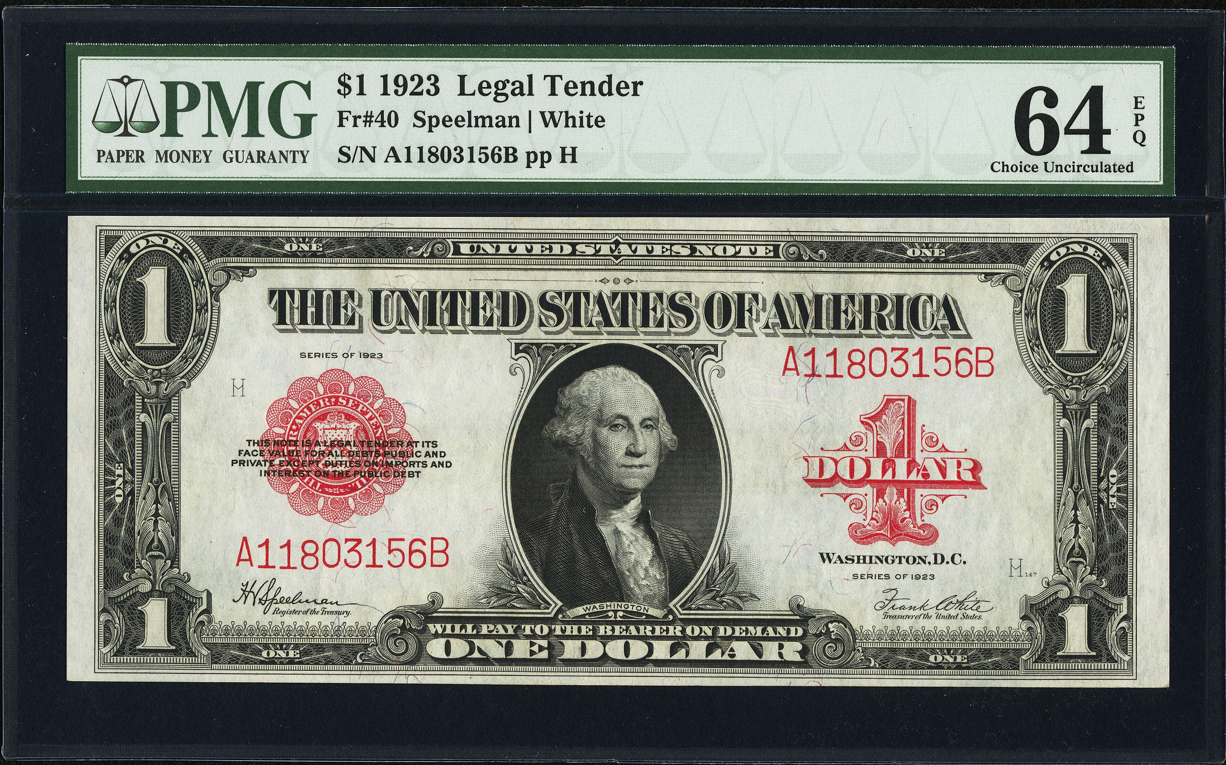 It is hard to see why this is a PMG-64EPQ and not a 65EPQ. The EPQ qualification tells us it is fully prigional and the margins and color certainly seem to support the full GEM grade. Weather choice or gem, this certainly is a nice 1923 ace. It is in a undergraded PMG-64EPQ holder. This is from the Menlo Park Collection.