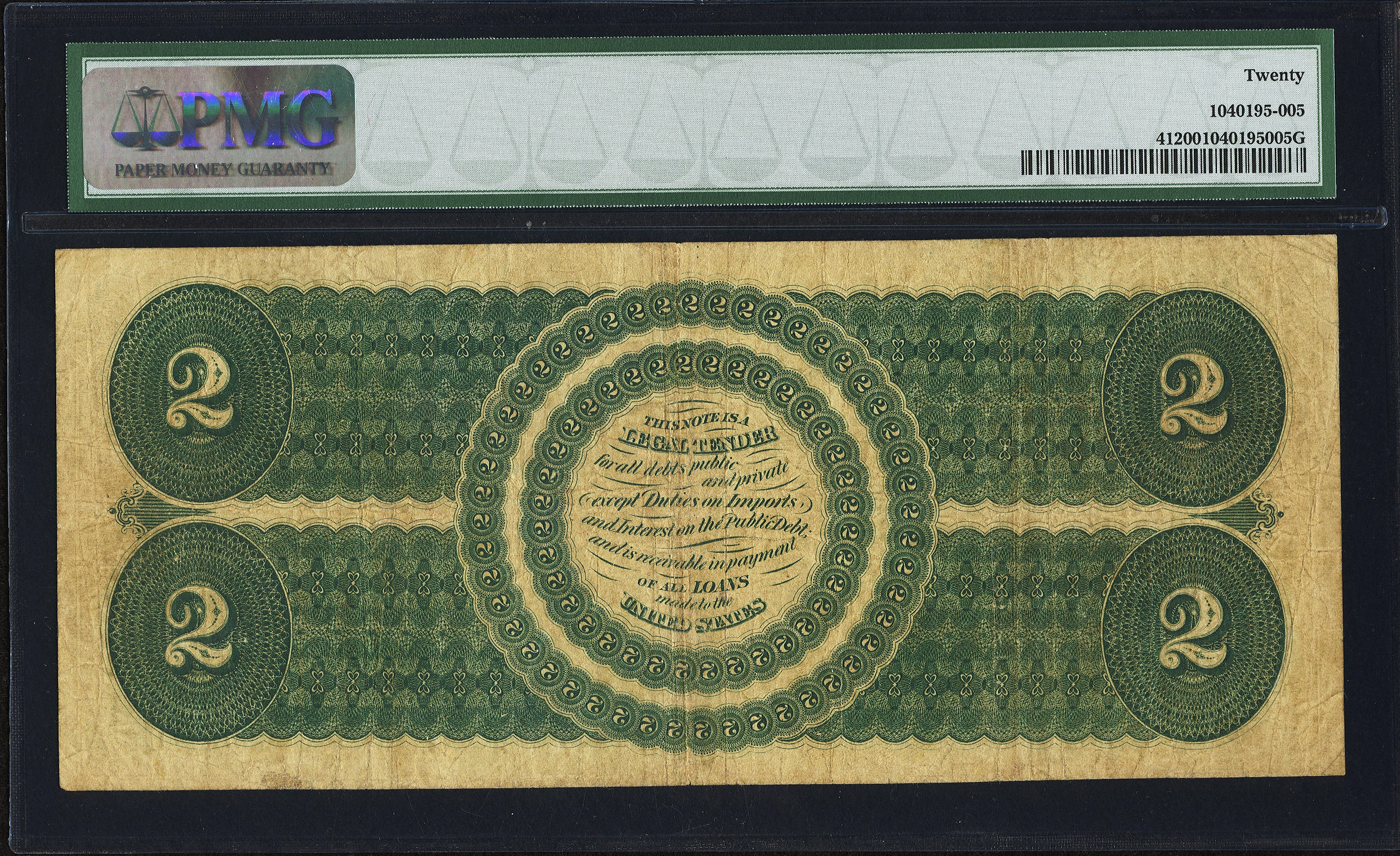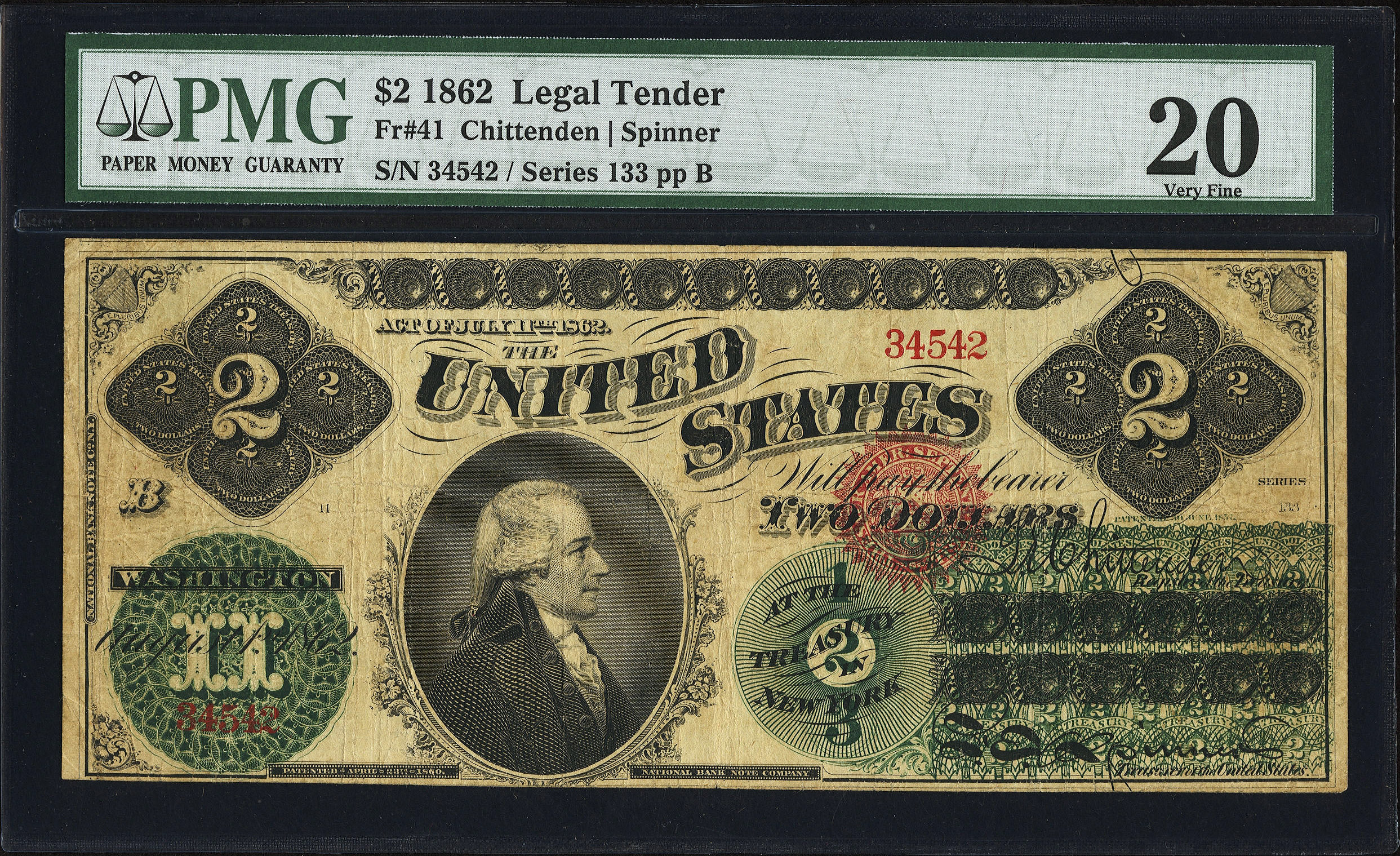 This is a really cool no problem mid grade 1862 $2 Legal Tender with solid paper and a bold overprint. The red seal show plenty of color for the grade. This scarce note is for the type collector who does not want to spend a bundle on a higher grade type. It is in a PMG VF-20 holder. No rips, tears, pinholes or missing pieces. A solid buy for the grade.