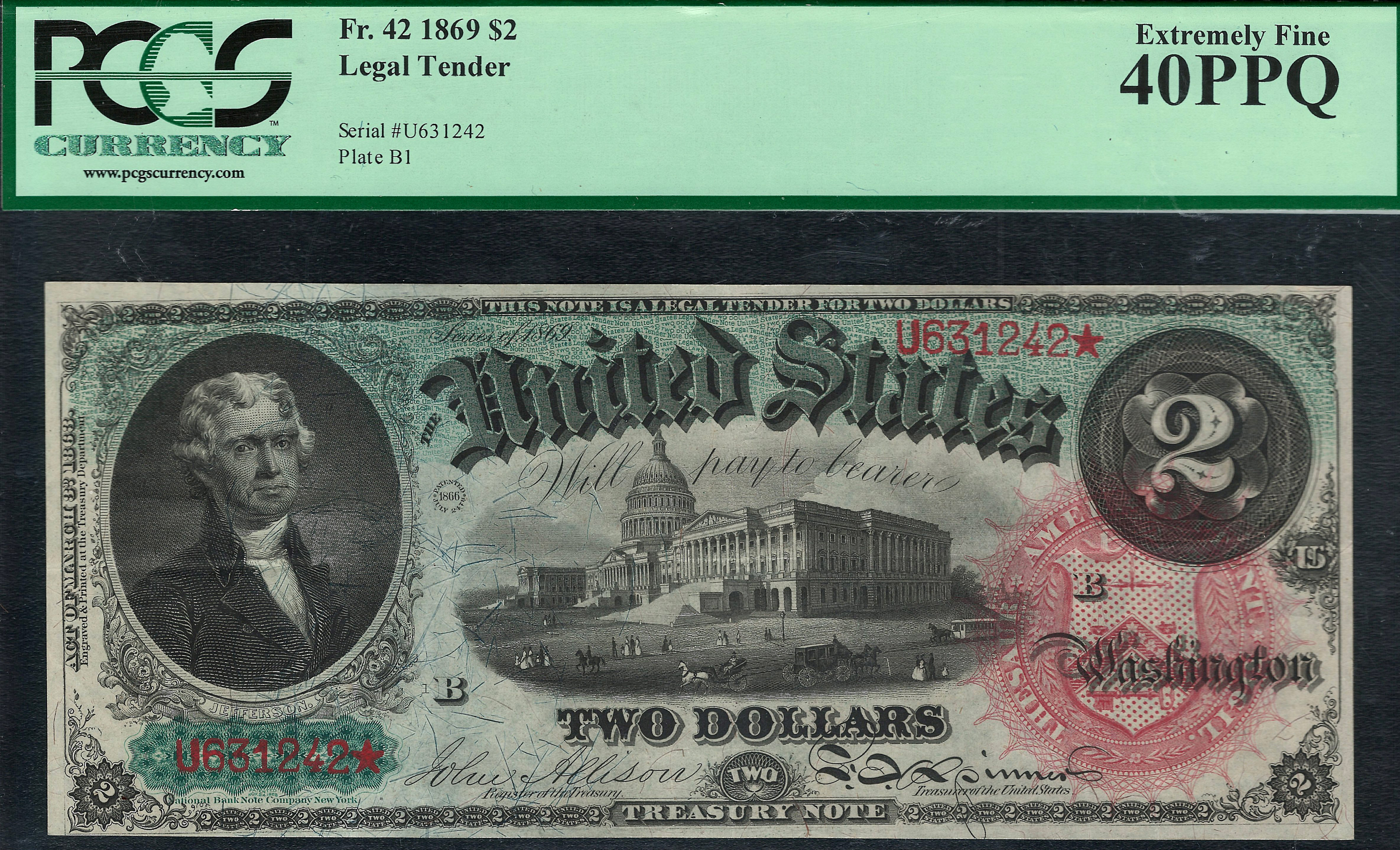 This is one beautiful 1869 $2 Legal Tender. It is commonly referred to as the Rainbow note because of the beautiful multicolored spectrum of rainbow colors that permeates across its face. The serial number is U631242 and it resides in a PCGS-40PPQ holder.