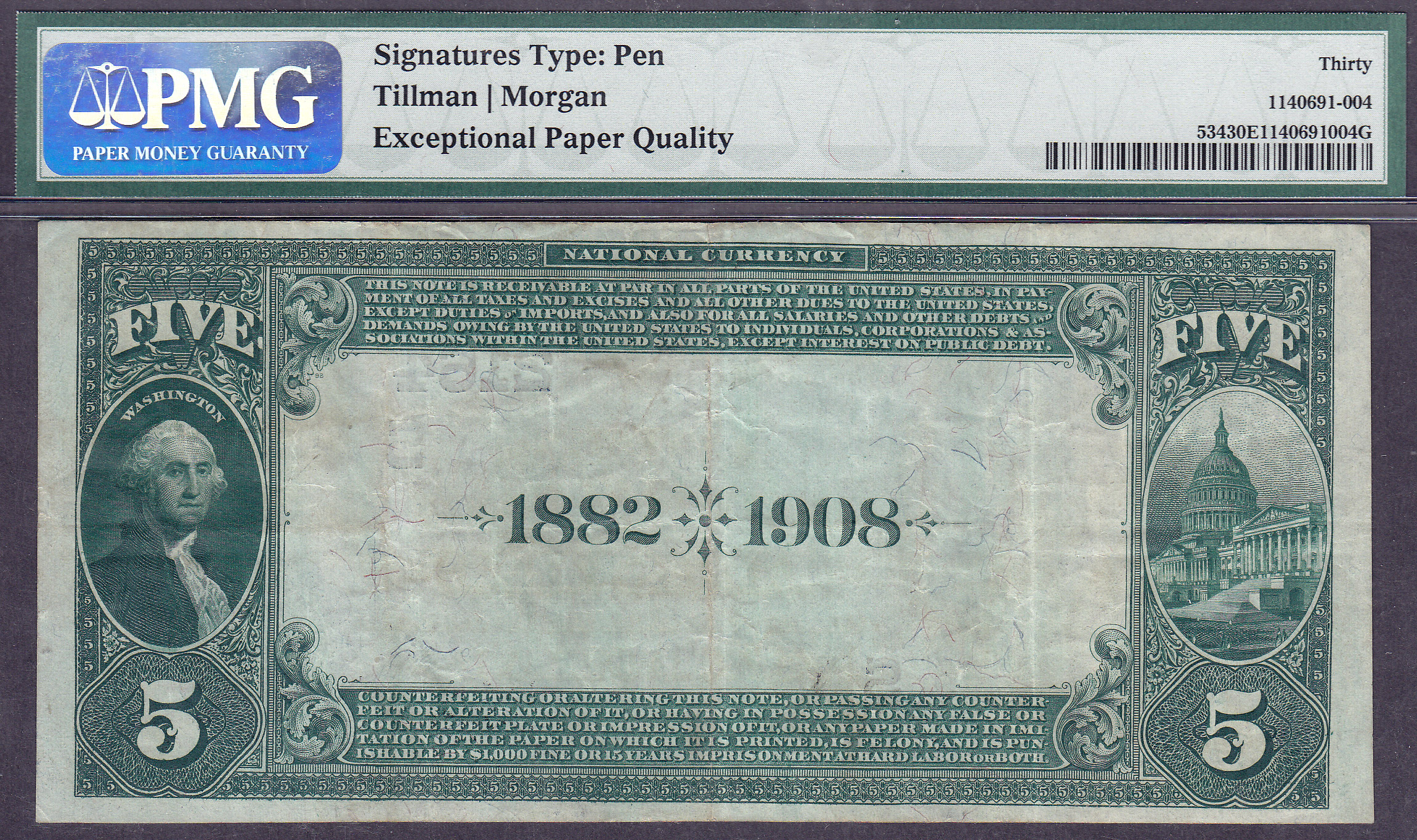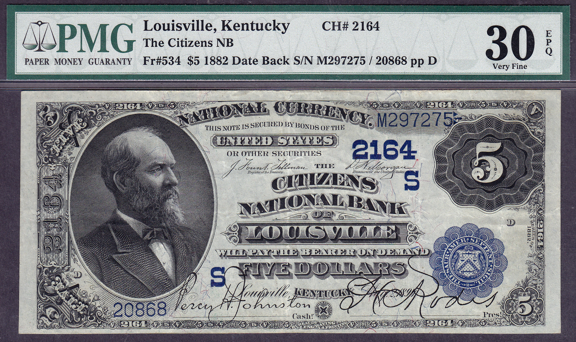 Kellys new book only list 4 1882 $5 Date Backs, charter # 2164, serial number 20868. There are only 5 1882 $5 Date Backs known from this Bank. Not many for the collecting community. This is one of the finest known. There are not any rips, pinholes, tears or missing pieces. This is the second issue of 1882 with the BLUE SEAL. You just dont see many Nationals of any kind with the PMG "EPQ" designation on them.