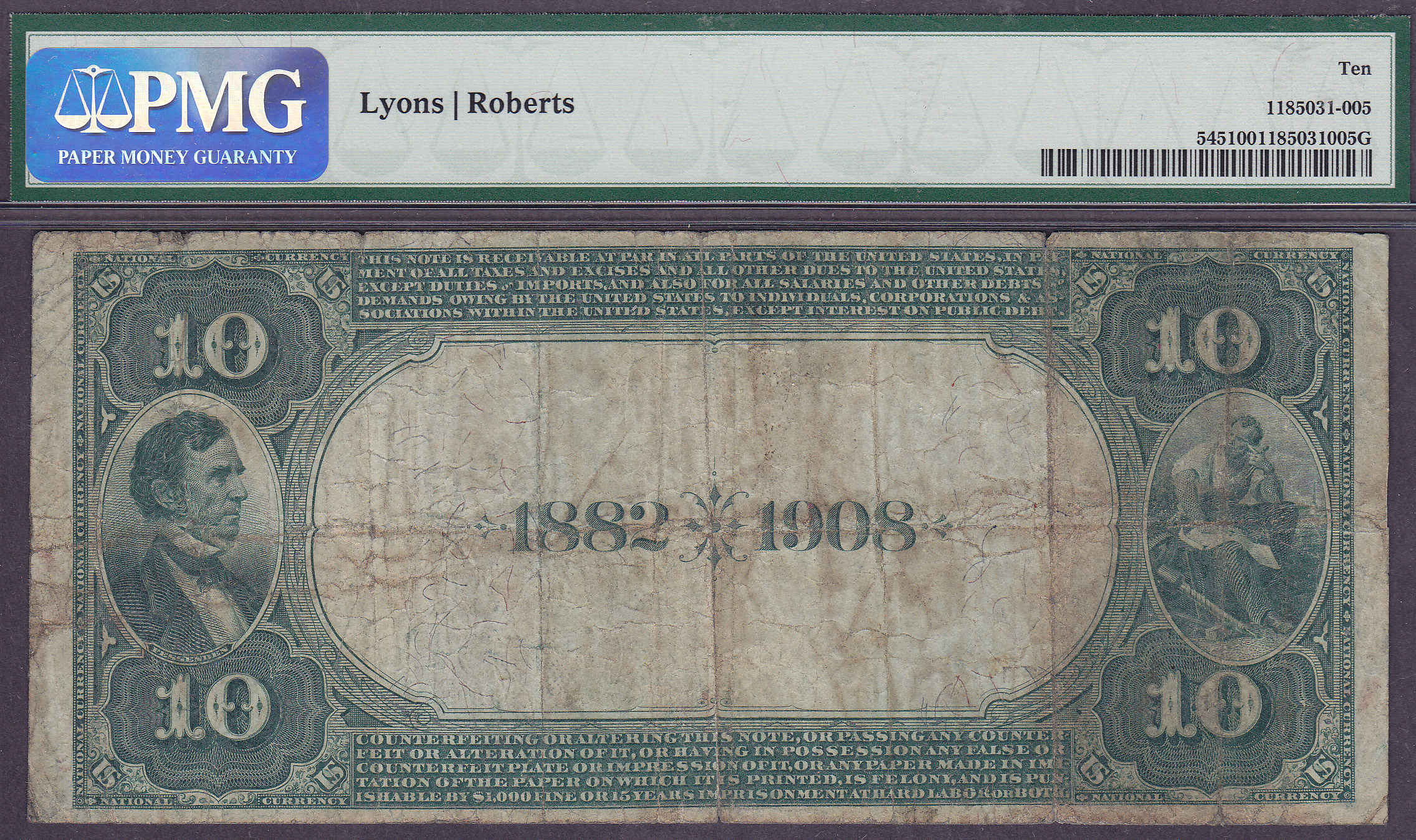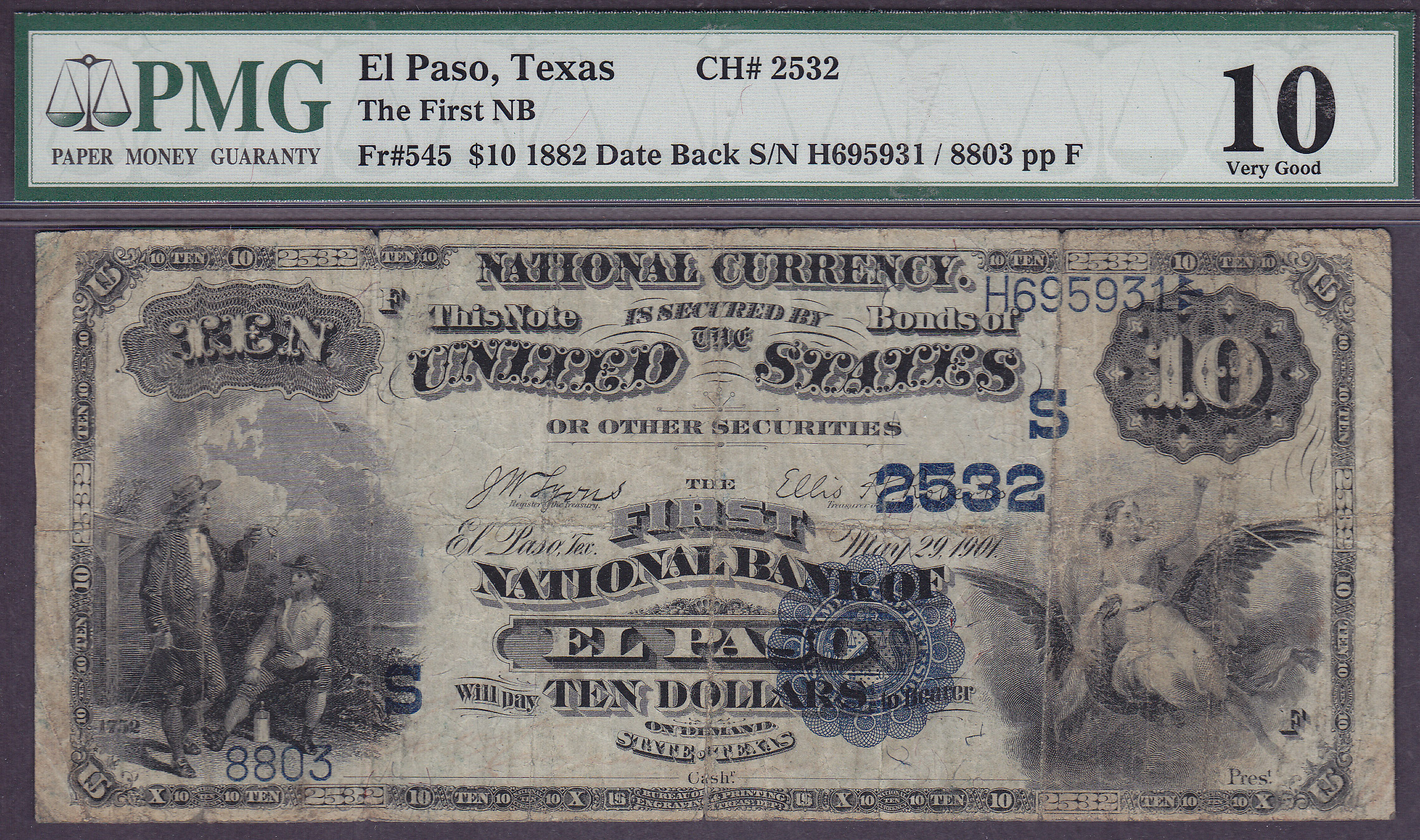 Here is a Fr.-545 or a 1882 $10 Date Back. The Chtr # is 2532 and is from The First National Bank of El Paso, TX. It has been graded as a PMG F-10. There are only 9 of these 1882 $10 Date Backs know form this bank.
