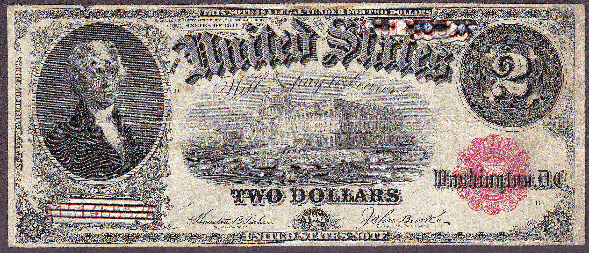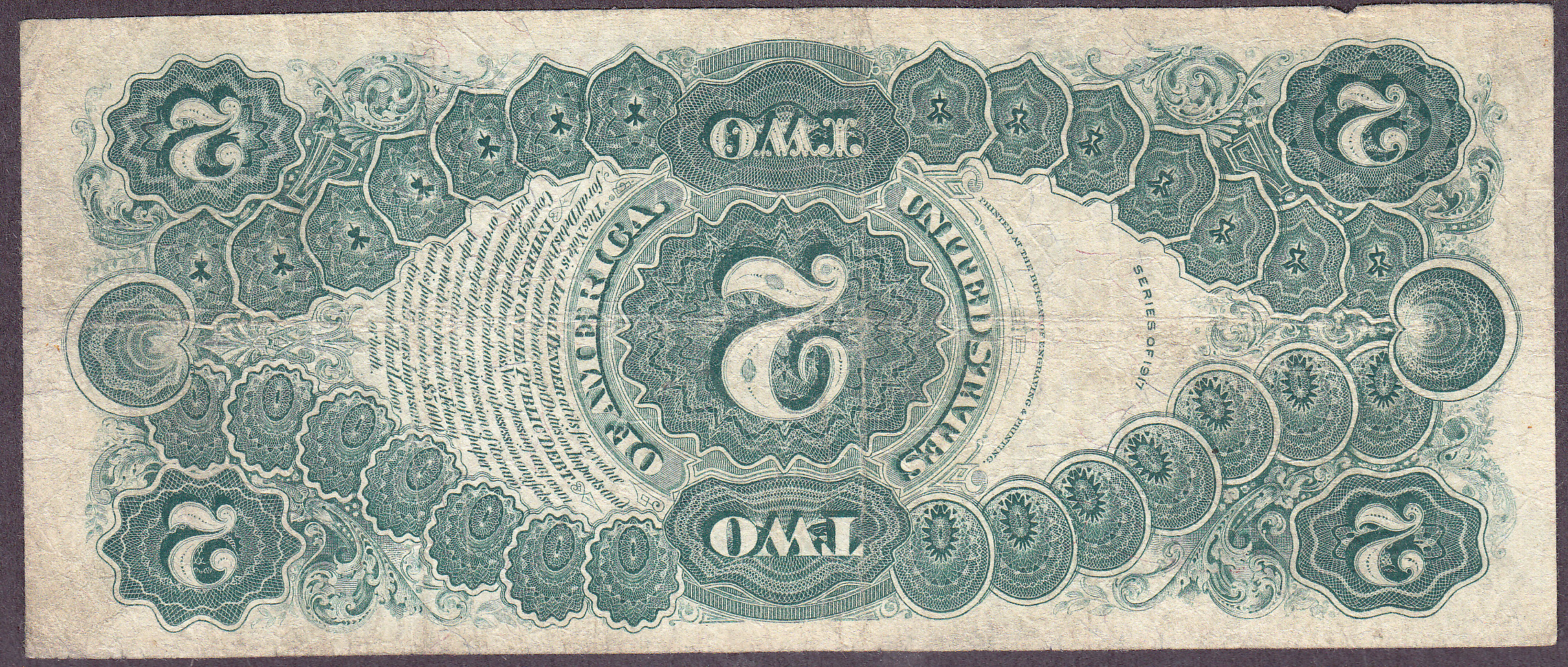 This is a very rare 1917 $2 Legal Tender (FR-57) with an Inverted Face. Any error on a large size $2 bill is very rare. Although circulated I do not see any pinholes, rips or tears. This not was purchased in May 2002. it is one of my favorite $2 Invert errors.