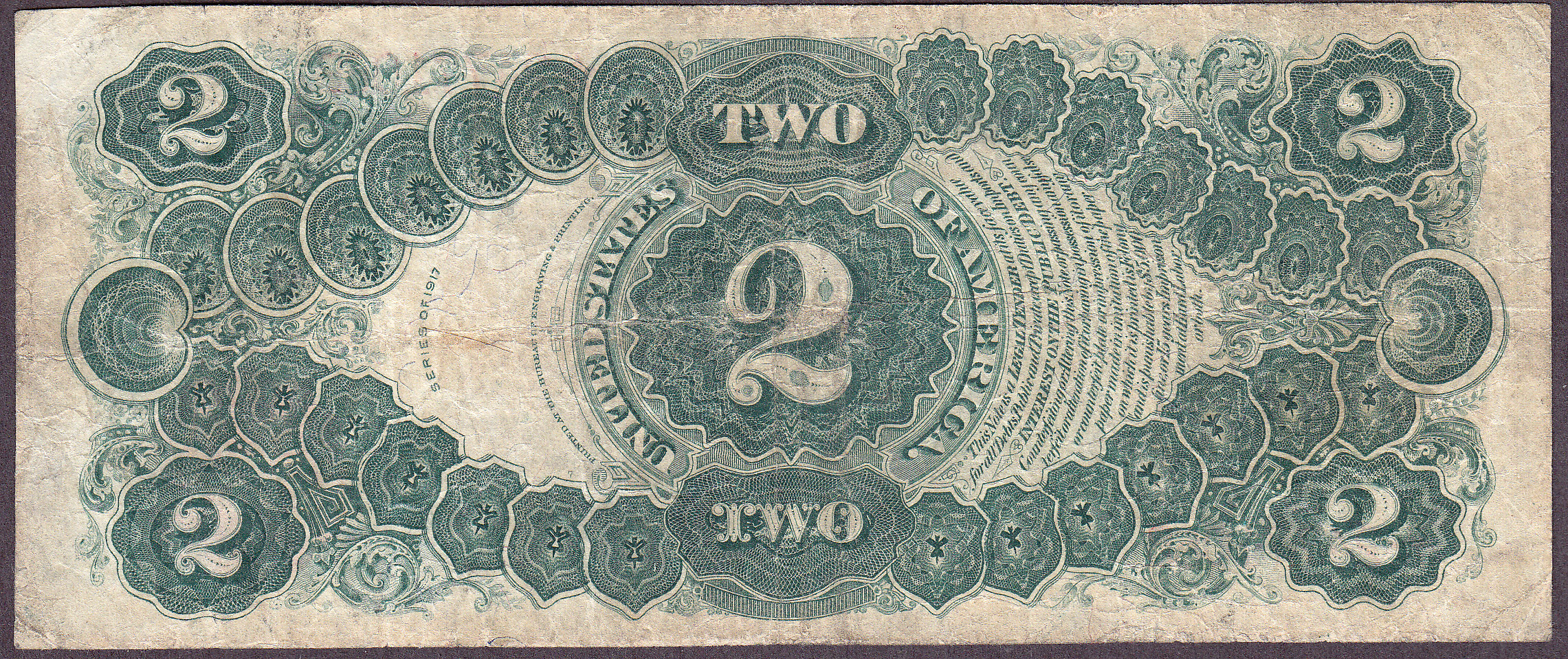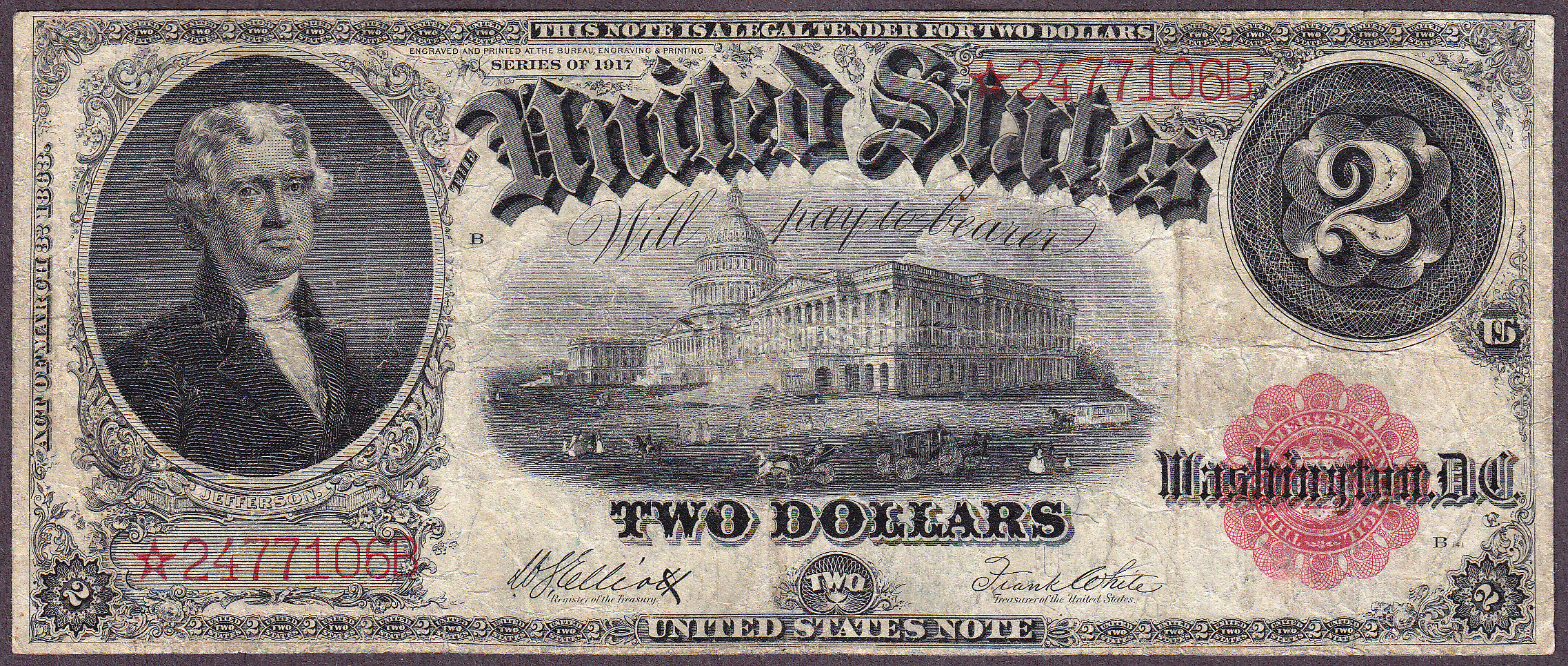 Here is a very collectible Fr-59* or a 1917 $2 Legal Tender star. It is commonly referred to as the bracelet note because of its back design. It is a solid Fine/Very Fine. No rips, tears or pinholes. The serial number is *2477106B. Only 18 non-mules known to exist.