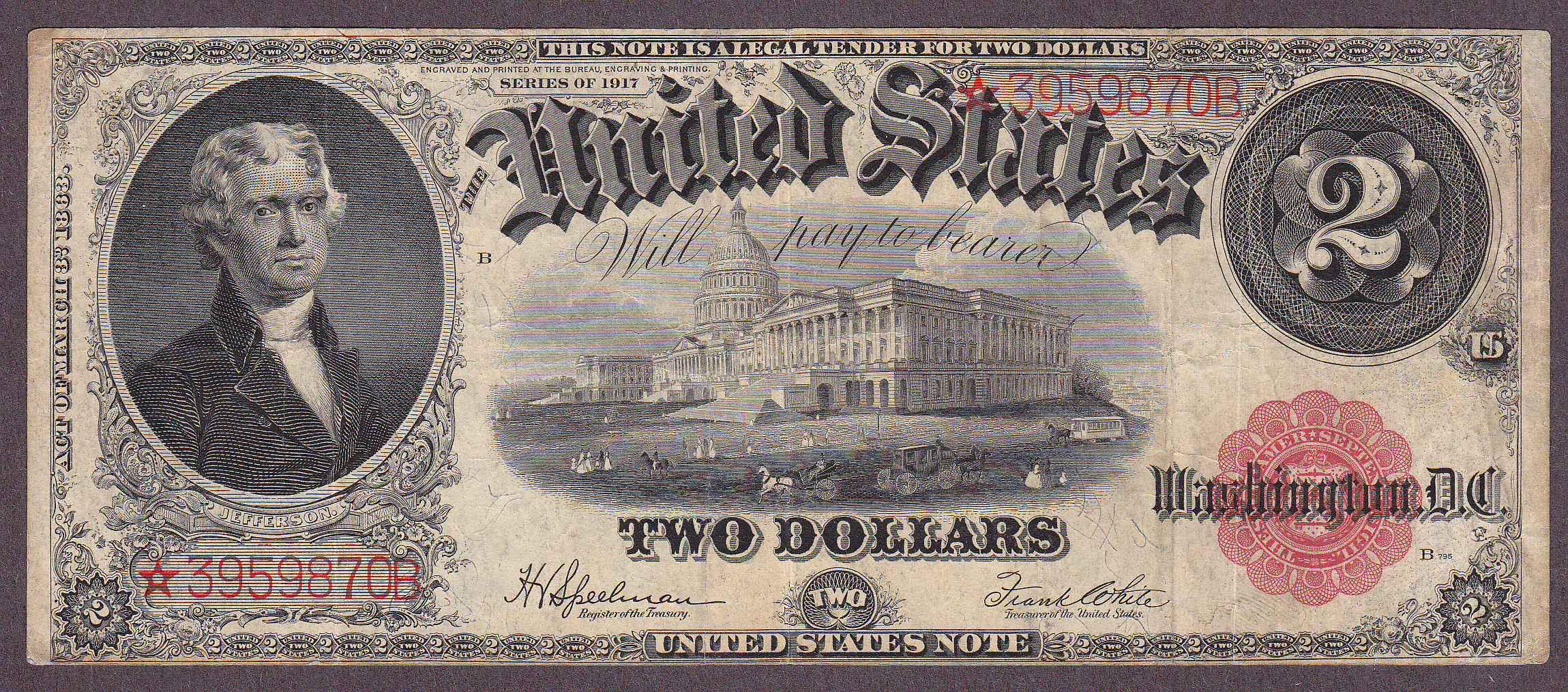 Fr.-60* 1917 $2 Legal Tender Star Ser. # *3959870B VF-Raw