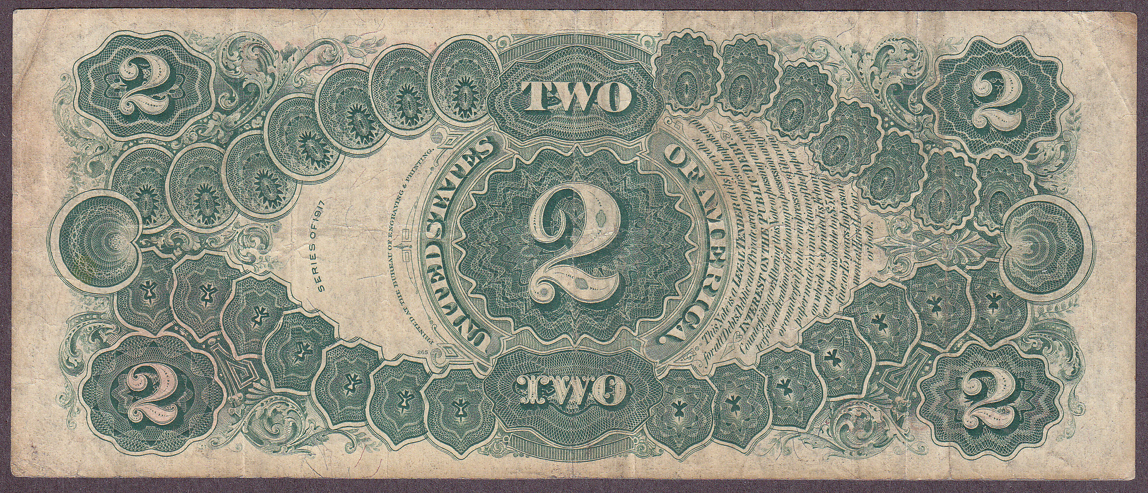 Here is a circulated example of the 1917 $2 legal tender that has not been graded. Although circulated I don't see any rips, tears or pinholes. The serial number is *3959870B. priced to sell for the type collector. I would grade this as a VF note.