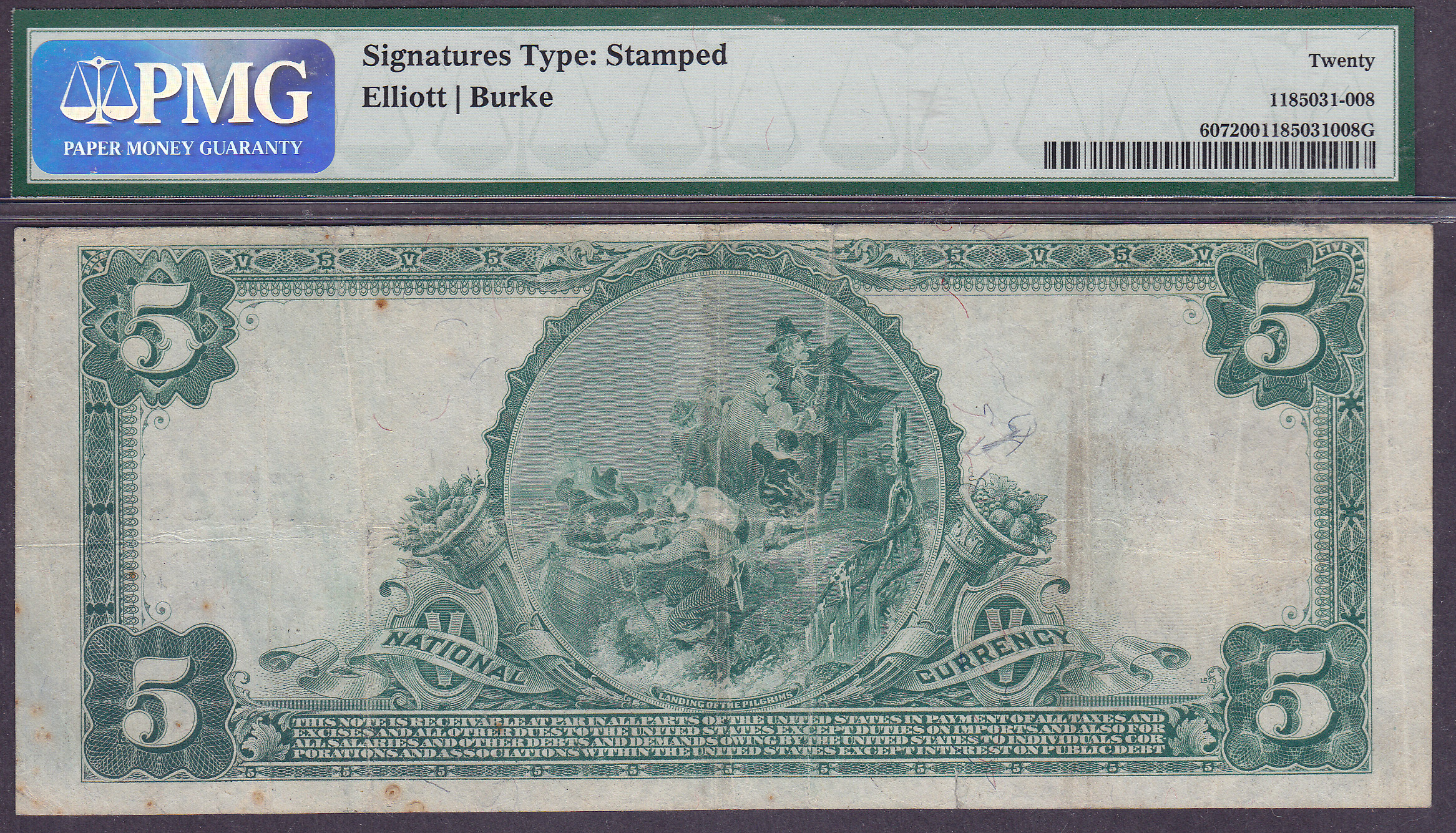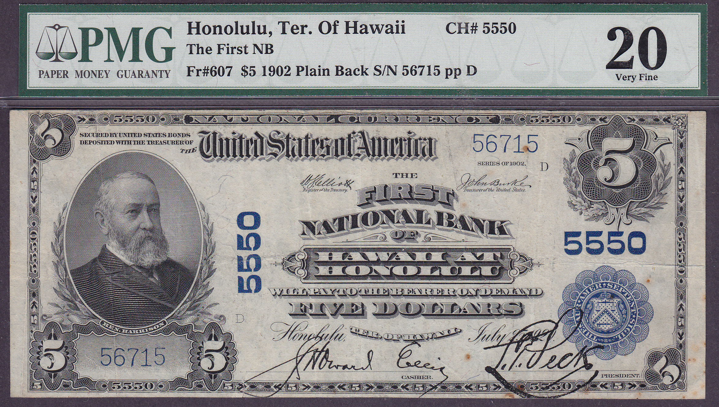 Here is a Fr.-607 or a 1902 $5 Plain Back. The Chtr. # is 5550. It is from the First National Bank of Hawaii at Honolulu. The Ser. # is 56715 and it is graded as a PMG VF-20. All Hawaii notes are very popular and hard to get when they are problem free.