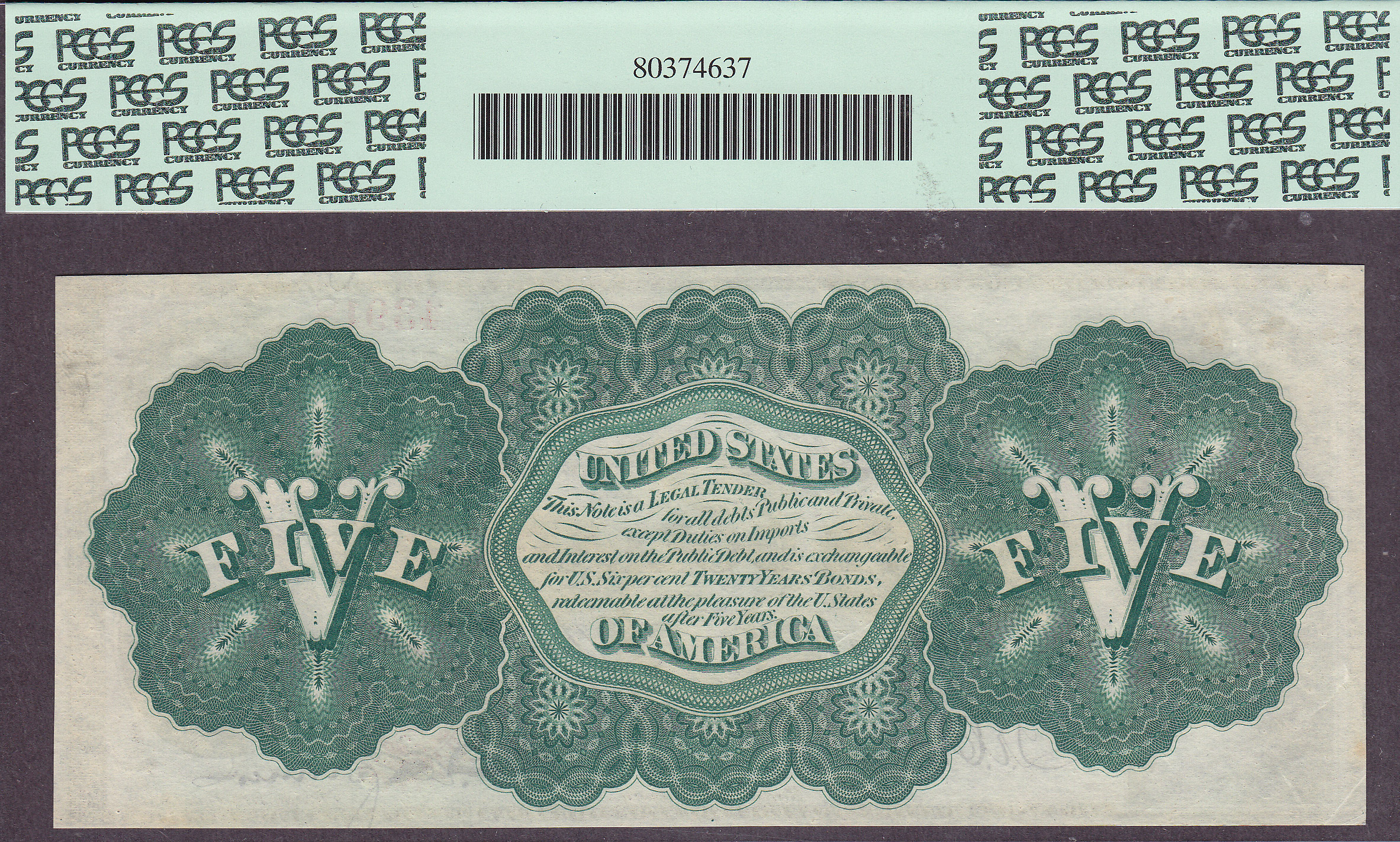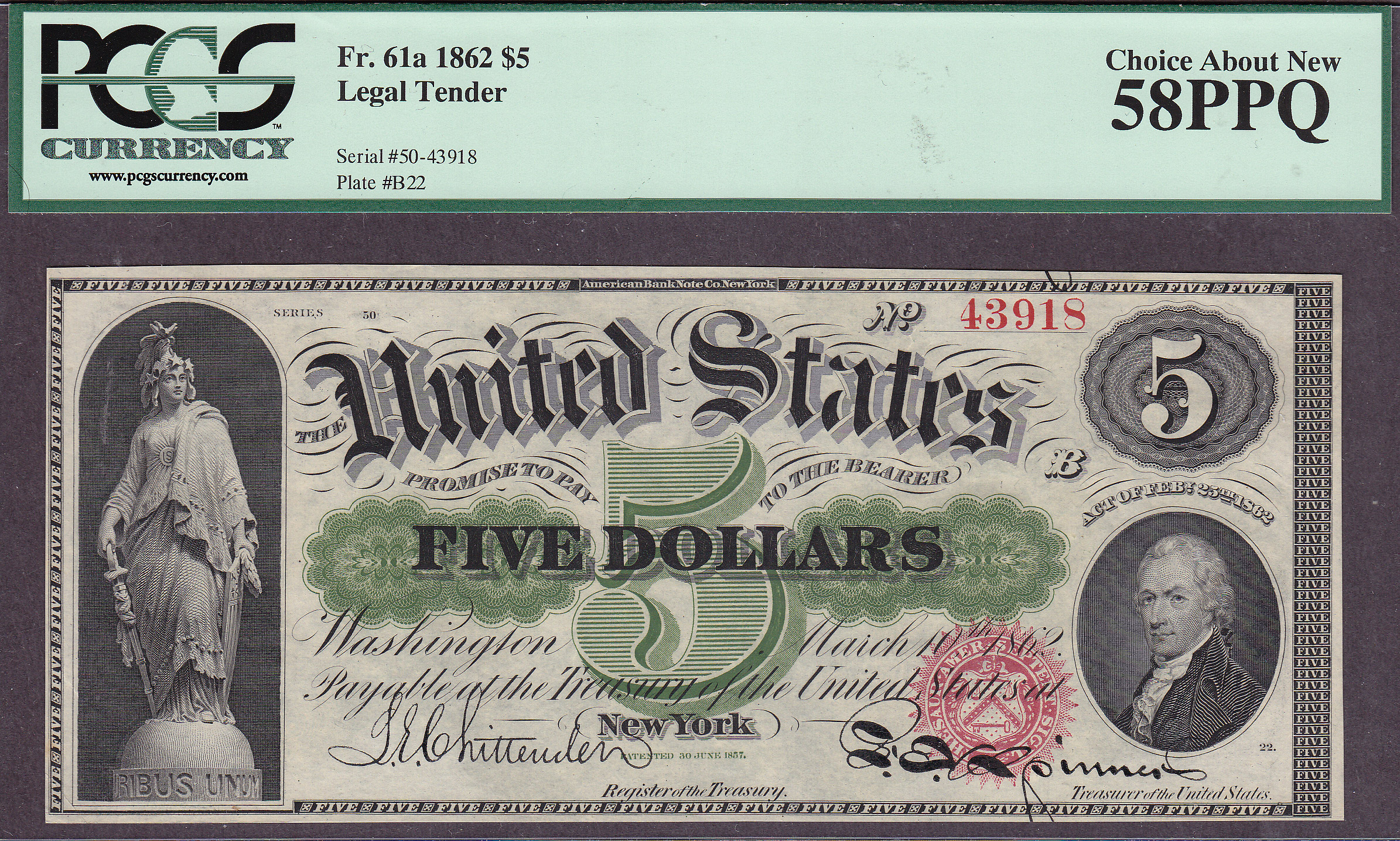 This is one of two consecutive Fr.-61a or 1862 $5 Legal Tenders notes that I bought in Memphis. The other one is serial number 43919 and is in a pCGS-65PPQ holder. This one should have been in a PCGS-65PPQ holder, but because there is a small, I mean very small corner tip fold in the left bottom. Someone is going to get a heck of a super deal on the GEM with a corner tip fold note. It has everything going for it. It also features perfect margins, perfect centering and stunning green colors on both sides. The serial number is 43918 and it is in an almost uncirculated PCGS-58PPQ holder.