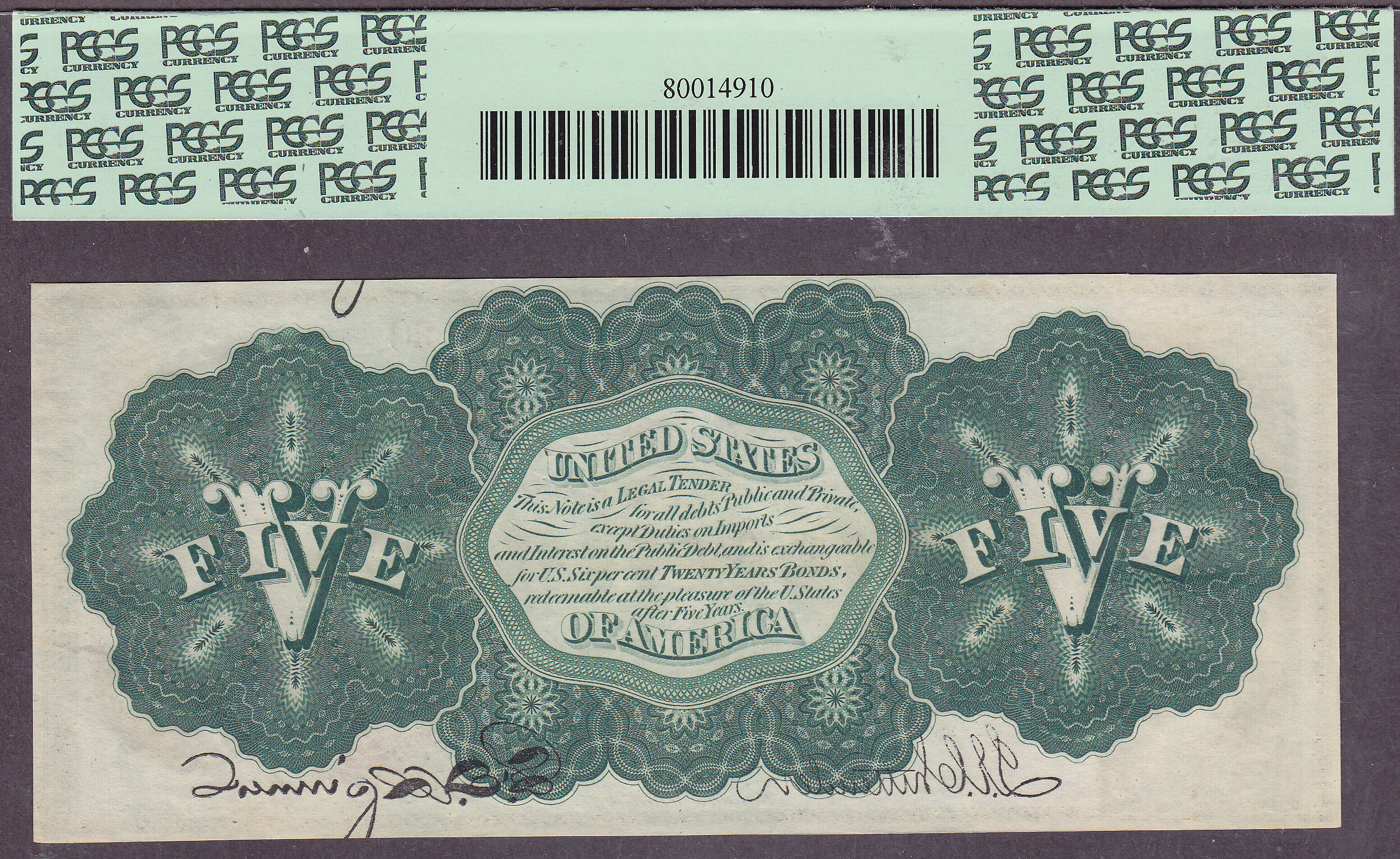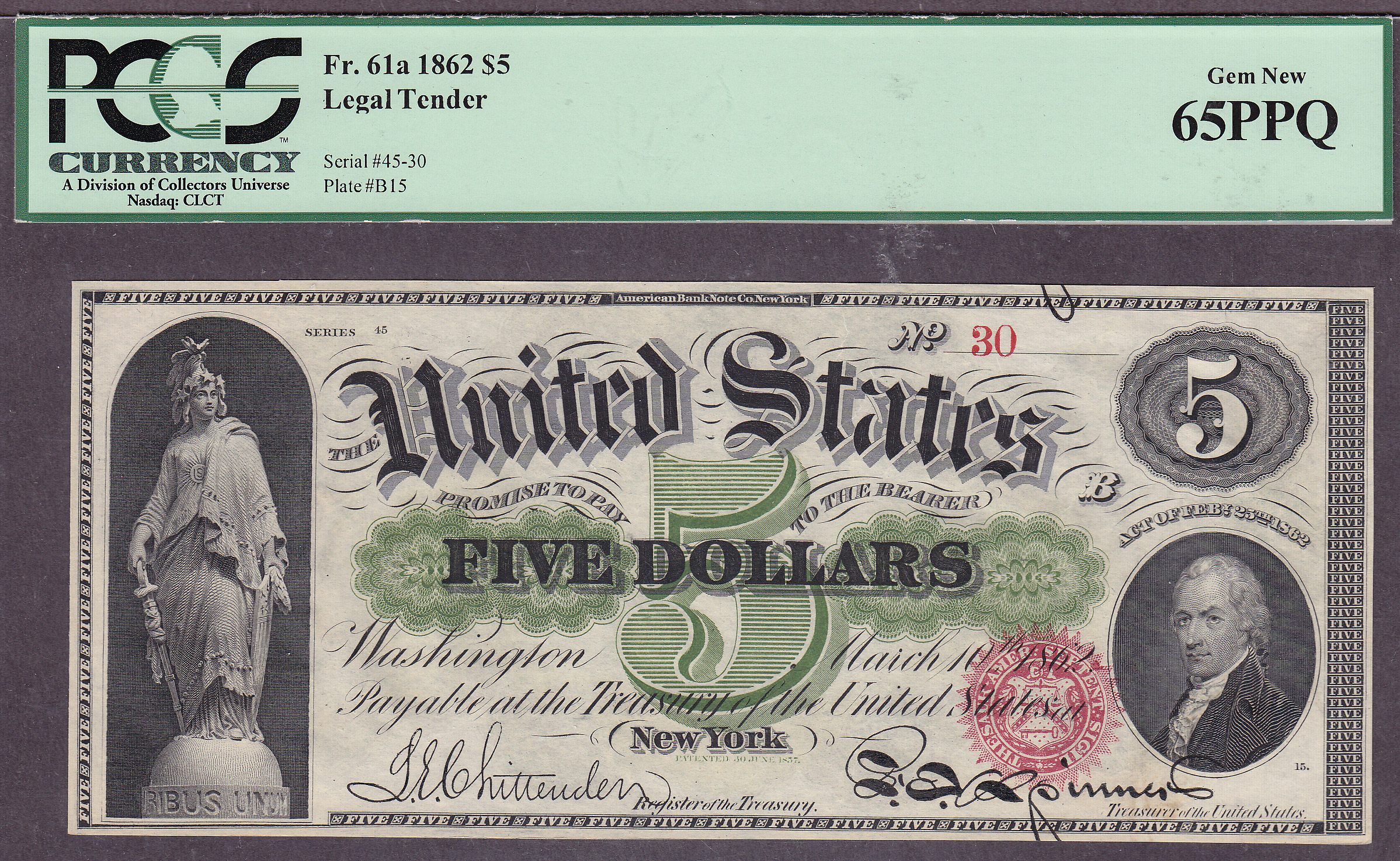 I have owned many Fr-61a notes and none were nicer than this one. Most all of these notes have bad margin cuts on the front which leaves little or no margin on the sides, especially the right side. These front margins are dead on perfect. That is the main reason I chose this particular note. However if you will please notice that this serial number 30 is one of the lowest serial numbers recorded. At worst case this is the 30th Fr.-61a 1862 $5 bill Legal Tender ever printed. How cool is that? On the right is Thomas Crawford’s statue of Freedom that sits on top of the capital in Washington and on the right is the head of Alexander Hamilton the first Secretary of the Treasury. The green inks are as vivid as they could possibly be after 150 years. This note is a real catch for the collector who wants the best. It is marked down for a quick sale. If you are in the market for a GEM-65PPQ speicmen, this is the one for you.