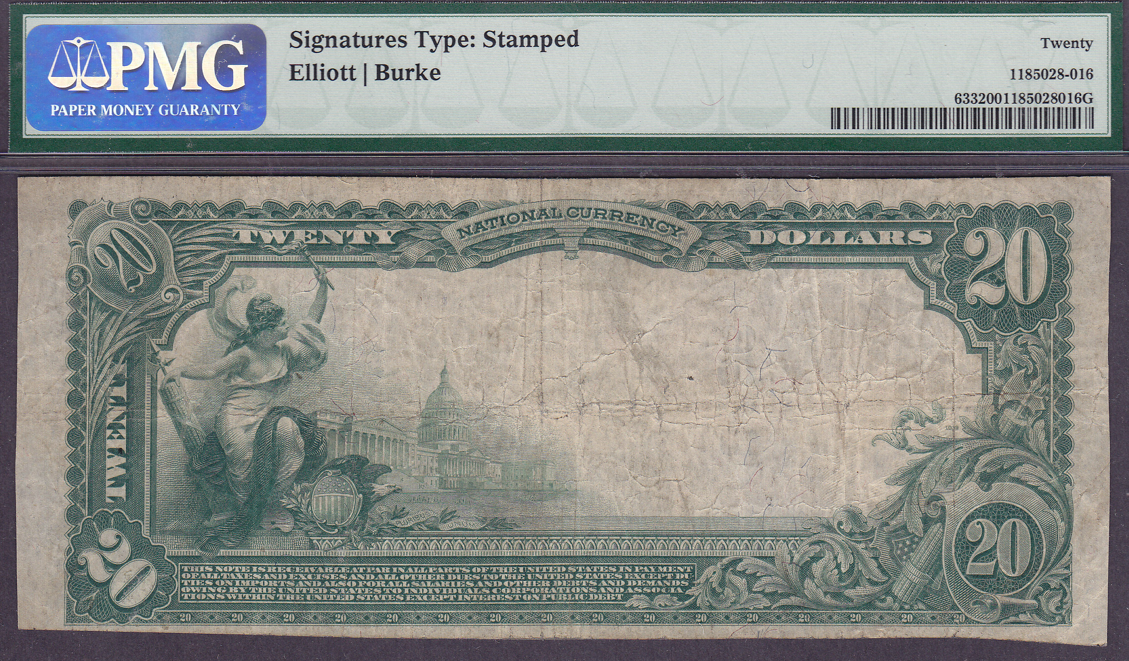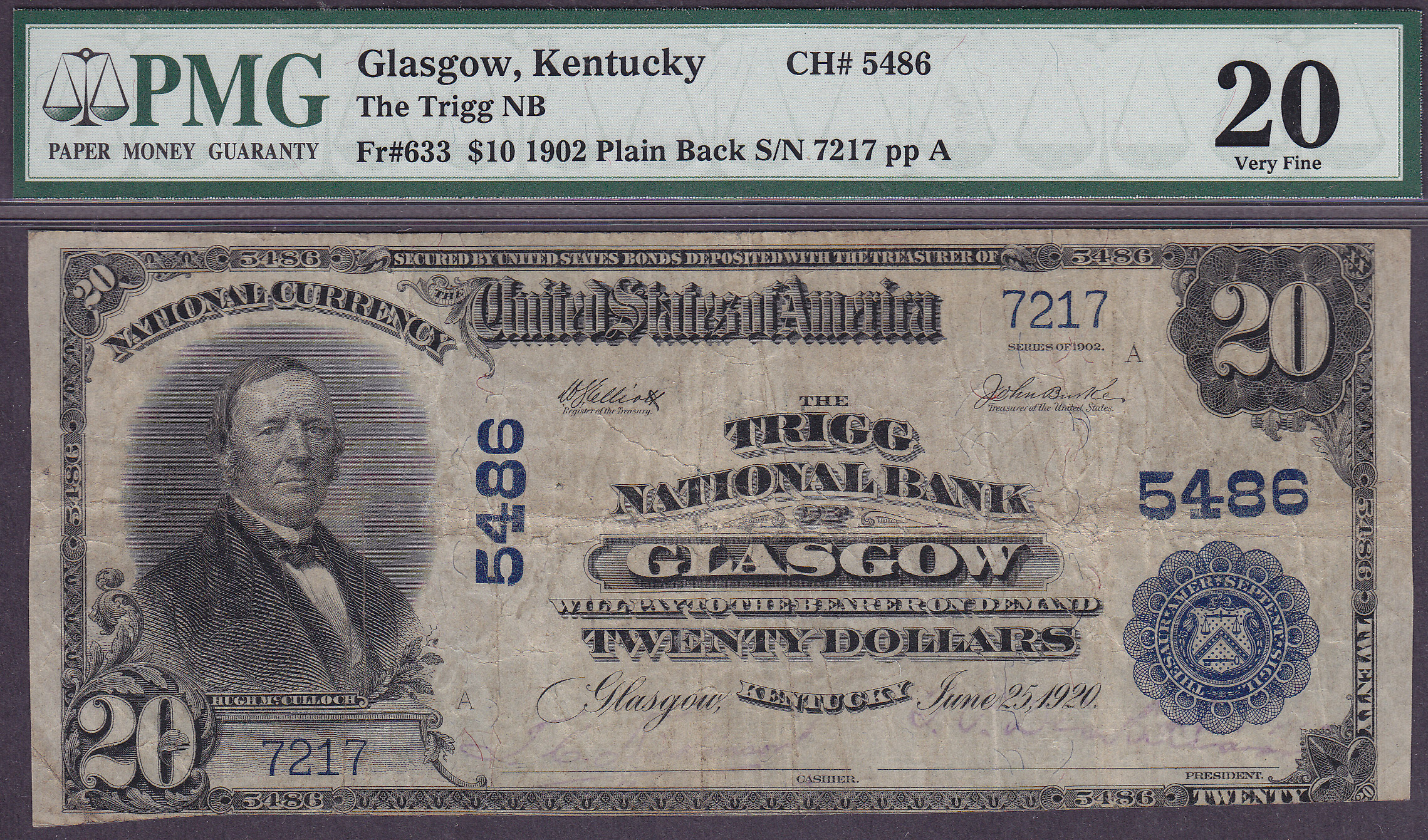 Here is a nice example of a 1902 $10 Plain Back for the Trigg National Bank of Glasgow, kentucky. The serial number is 7217 and the charter number is 5486. It is in a PMG VF-20 holder. THERE ARE ONLY THREE OF THESE 1902 $10 PLAIN BACKS KNOWN FROM THIS BANK!